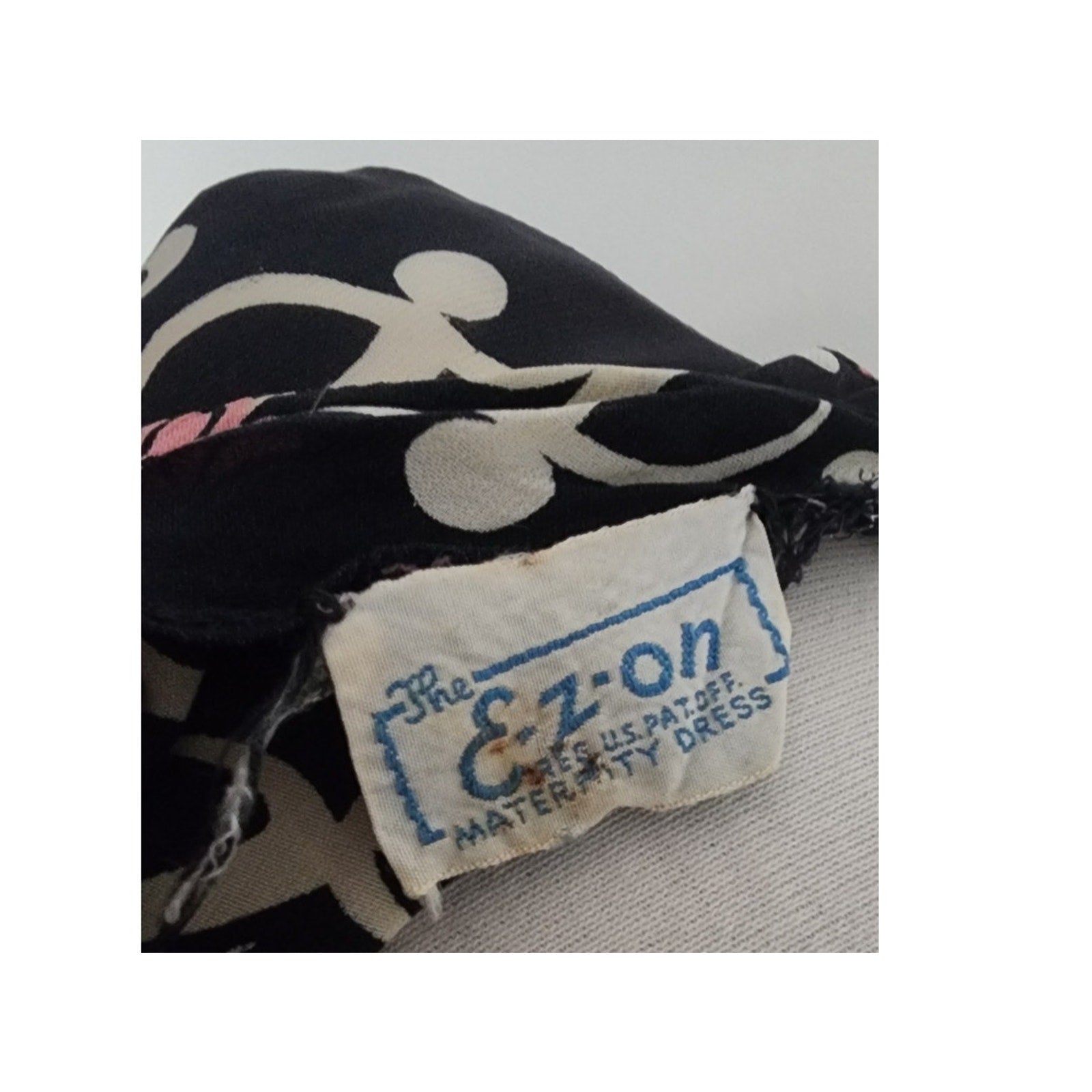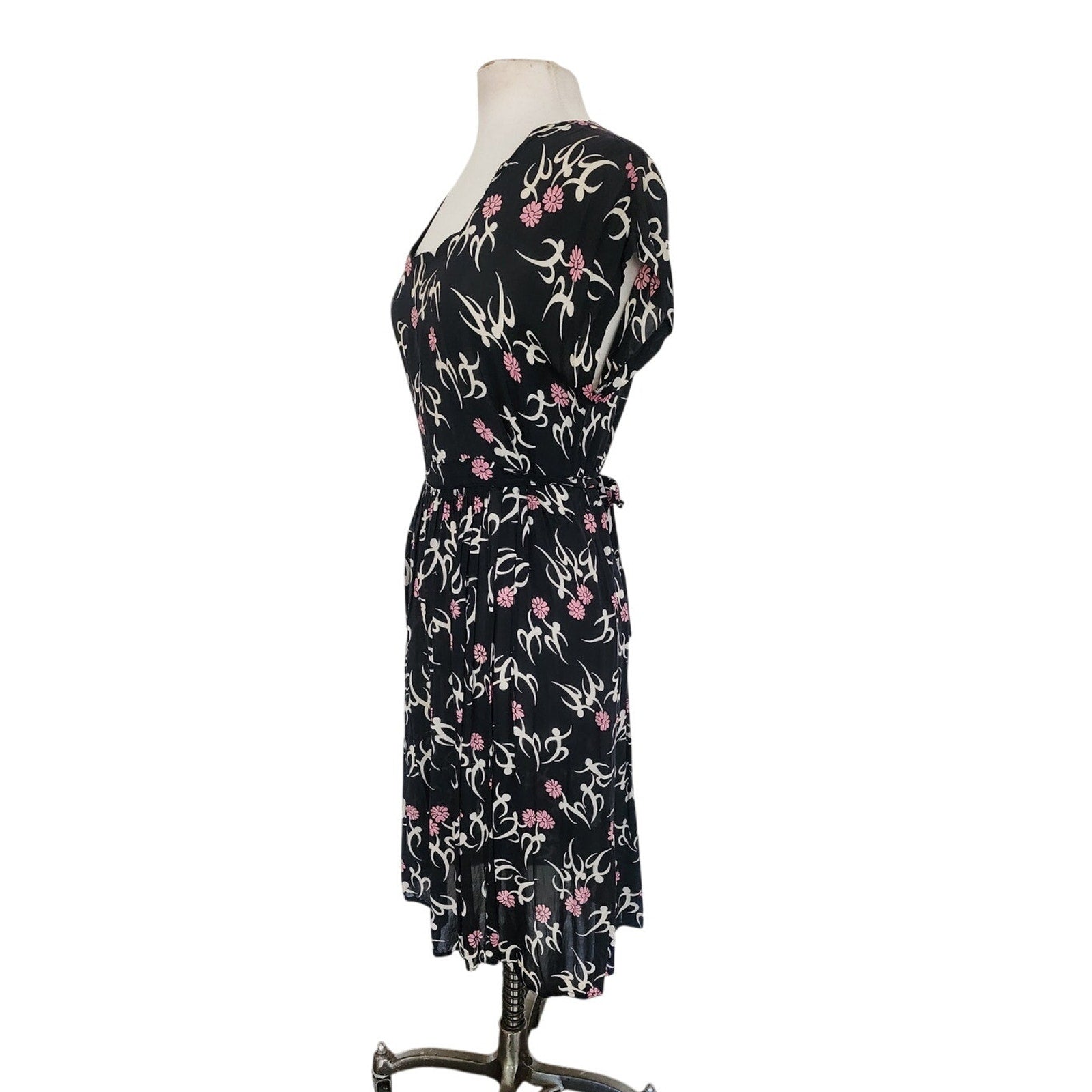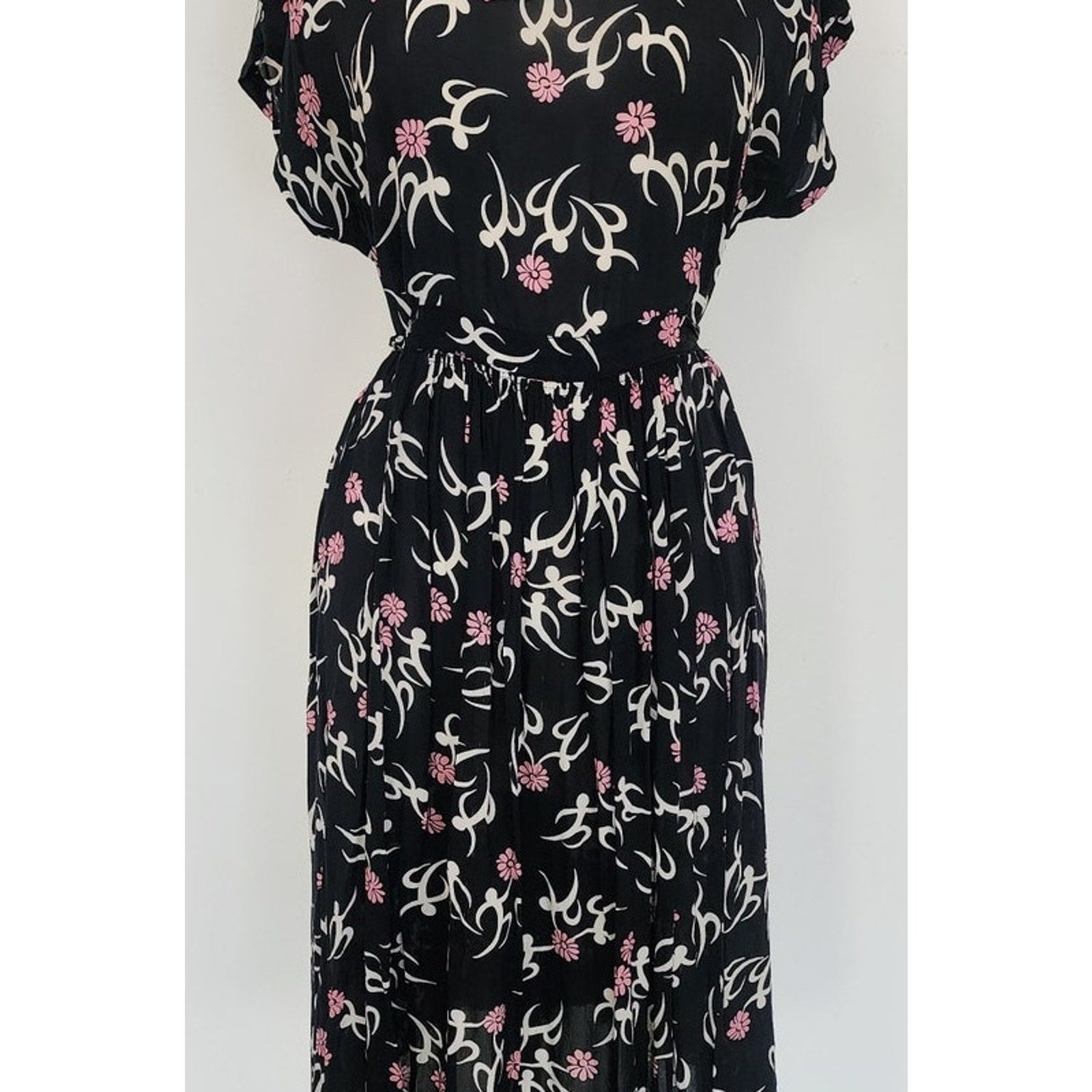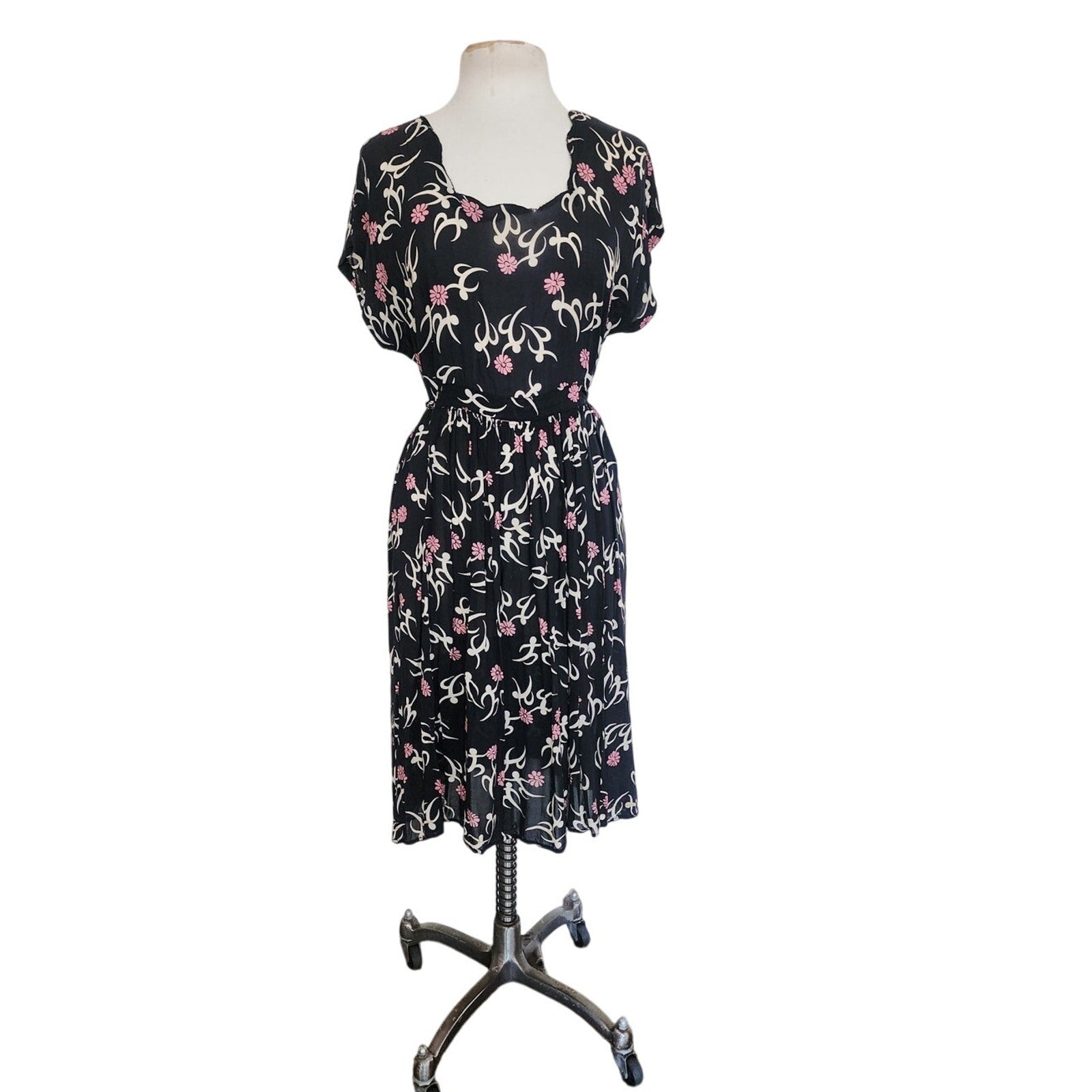 RARE slip on summer dress with capped sleeves and a low scoop scallop edged neckline, this is a midi length frock that can be worn with the waist ties cinched or loose as you progress with pregnancy. Unlined. Fabric is a cute dark floral print of pink and cream on a black background. Note that the cream pattern is an abstract "human figure" shape that is quite charming!