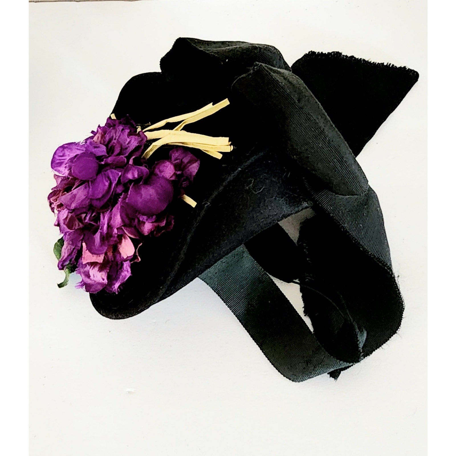 This one is from the late 30s/early 40s. The saucer top, back of the head strapping are in black, while the large bow at rear is in heavy satin. Top of saucer is festooned with a lovely purple bouquet of flowers. There is a remnant of a black netting that once encircled the flowers and was able to be pulled down across the face.