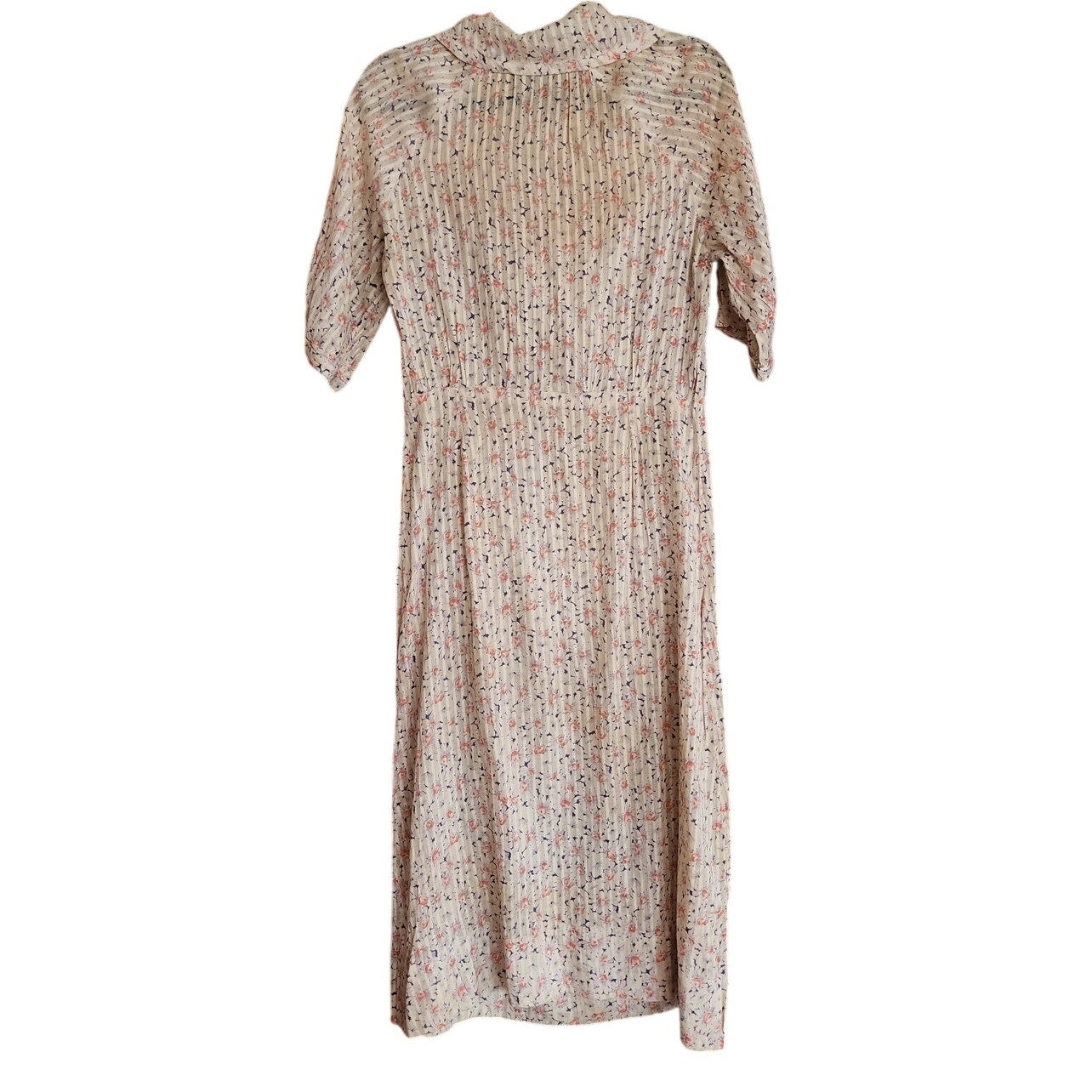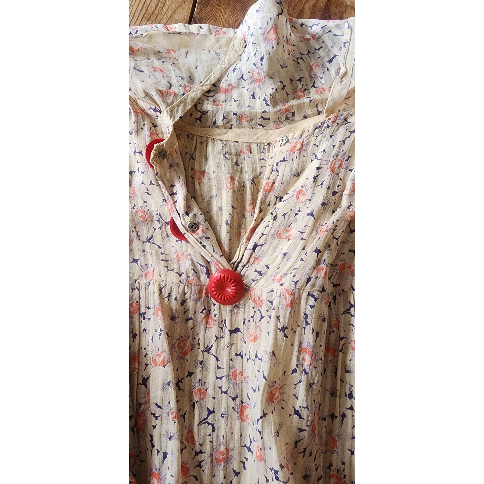 Lightweight dress in a gauzy silk (or silk-cotton blend?) featuring a specled floral print in coral and blue on a base of cream. Collared, it has half length sleeves and three, large red buttons at the throat that are decorative as it closes with interior snaps (added decades later it seems). Chest is fitted and there is an empire waist line. Unlined.