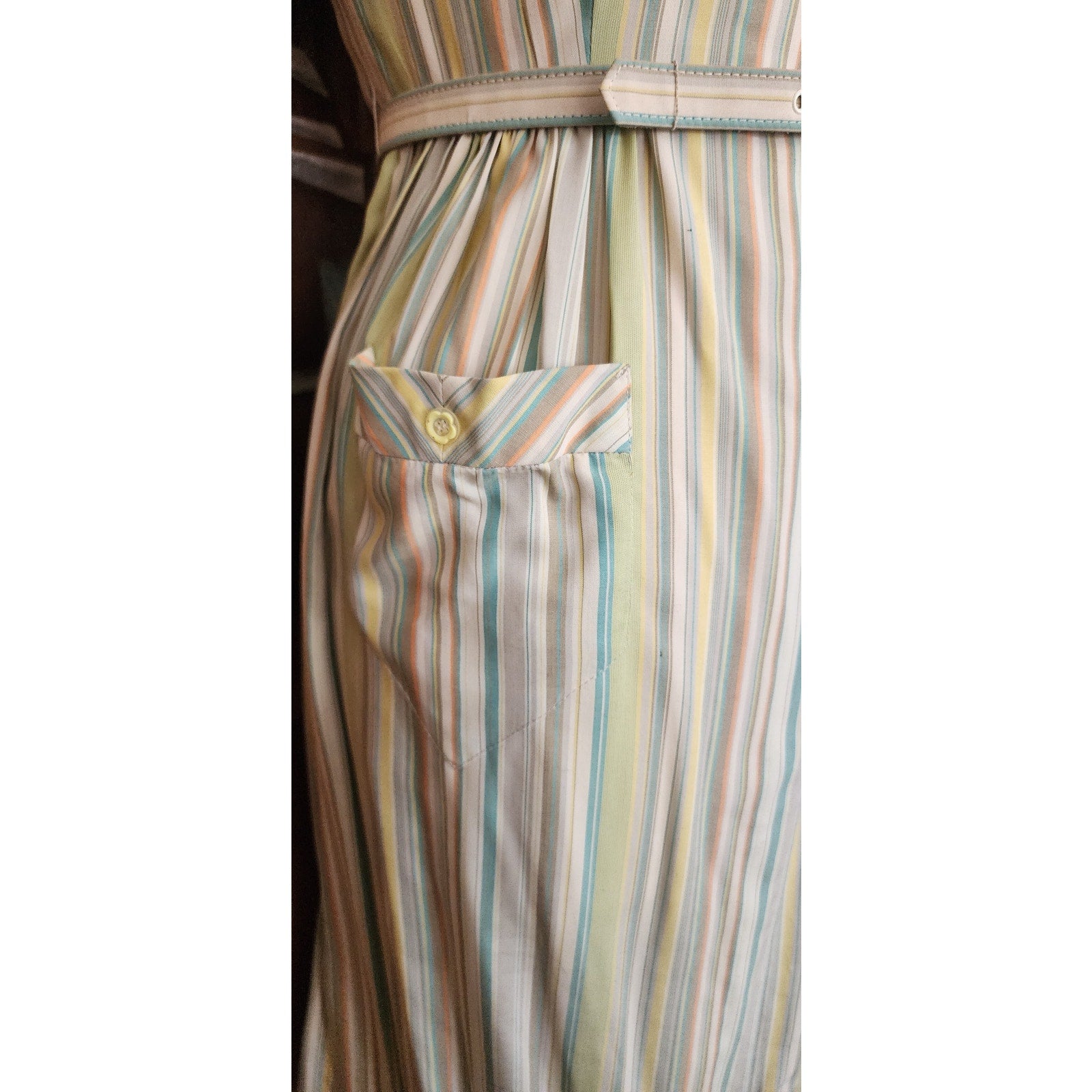 Features a charming, vertical stripe pattern in soft pastel shades of green, blue, yellow, brown, and white. The garment has a collared V-neckline with unique chevron-shaped panel at the chest with small, yellow, daisy flower buttons (functional, not decorative). There are short puffed sleeves, and the fitted waist is cinched by a thin, matching, adjustable belt. The skirt has one patch pocket at right hip and falls to a midi length. Side zipper for closure.