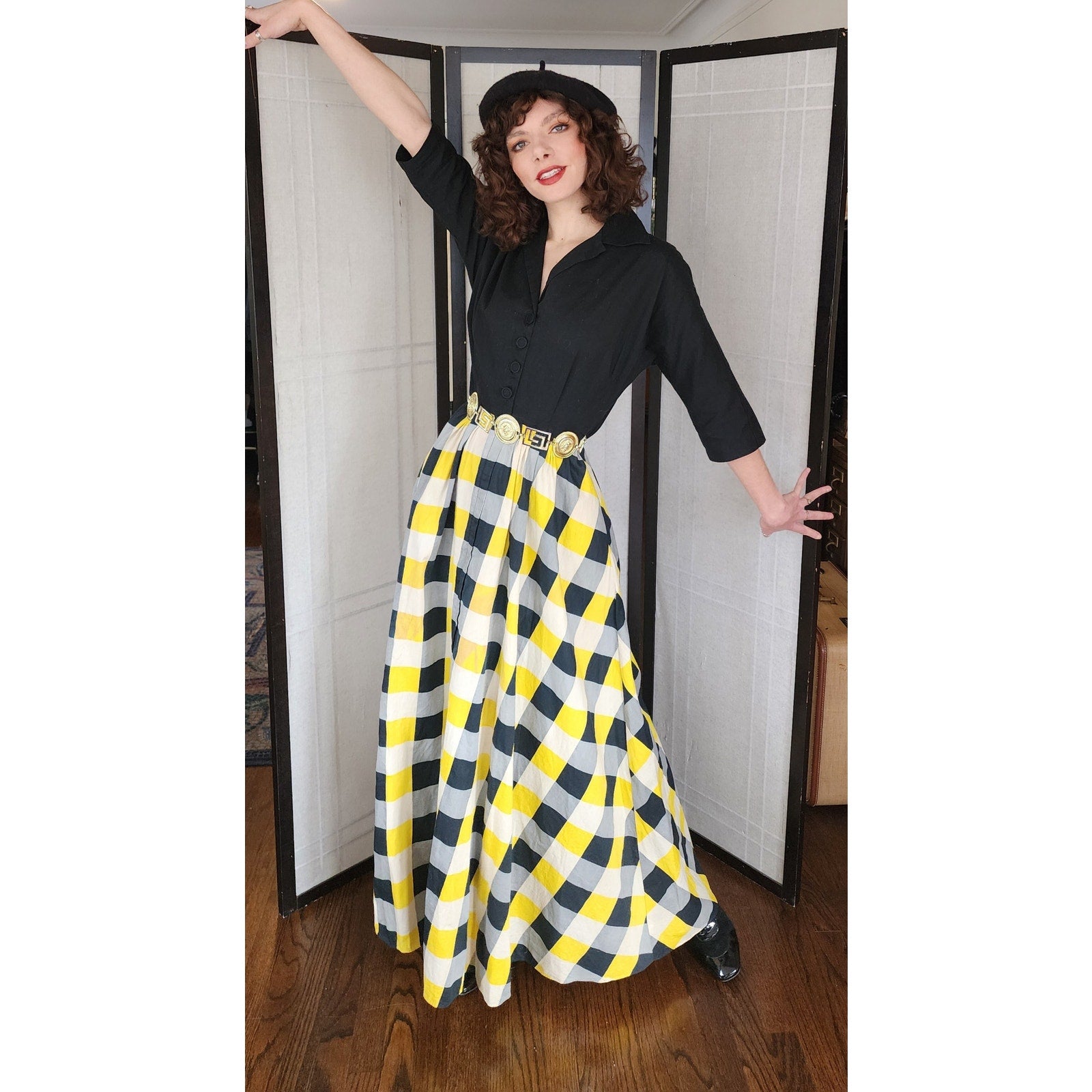 Features a small, fold down collar, a fitted torso with three-quarters length sleeves, a button down front and a nipped waist. Drama is all in the ankle length skirt in squares of yellow, ivory, black and gray check, and there is a hidden zipper at center front of top of skirt.