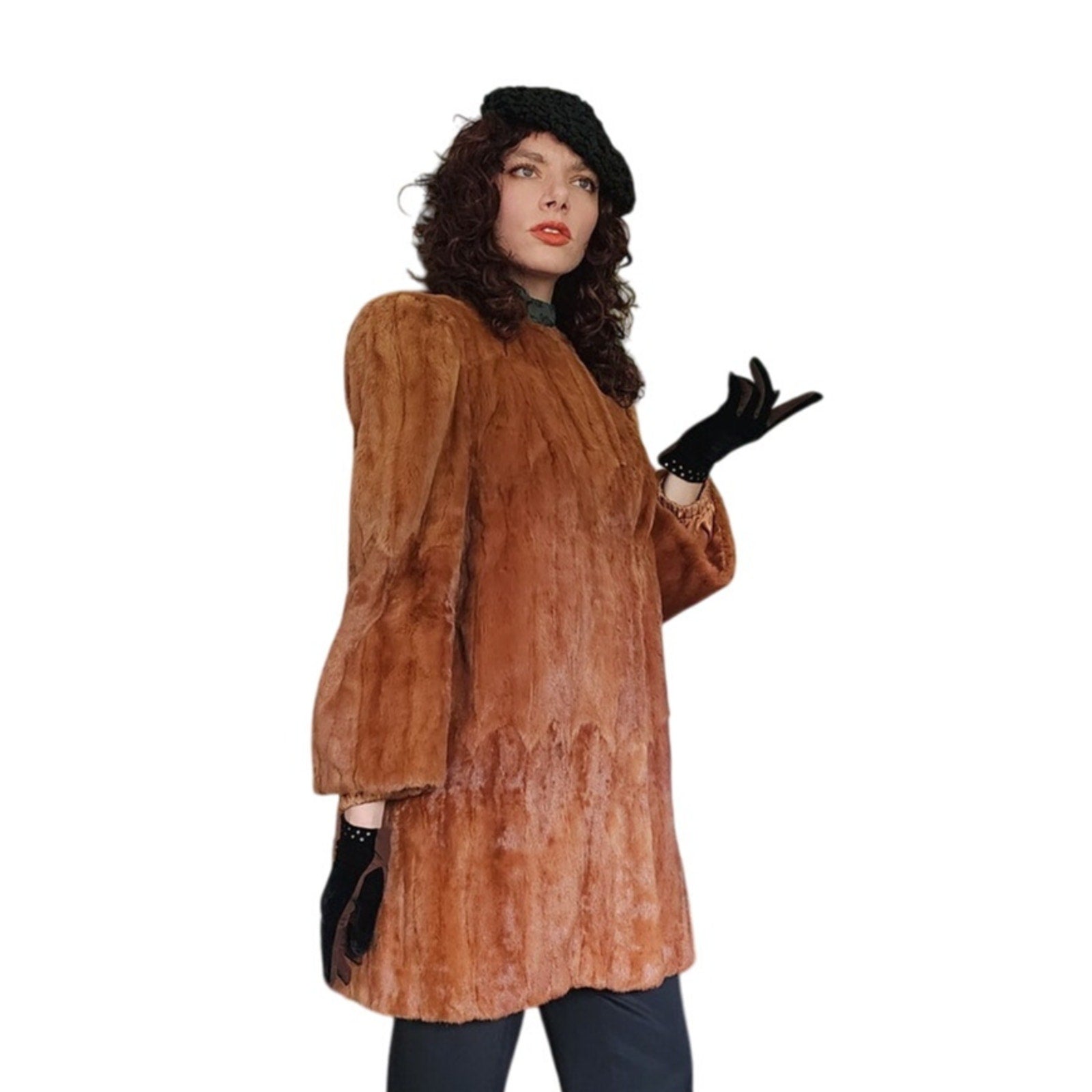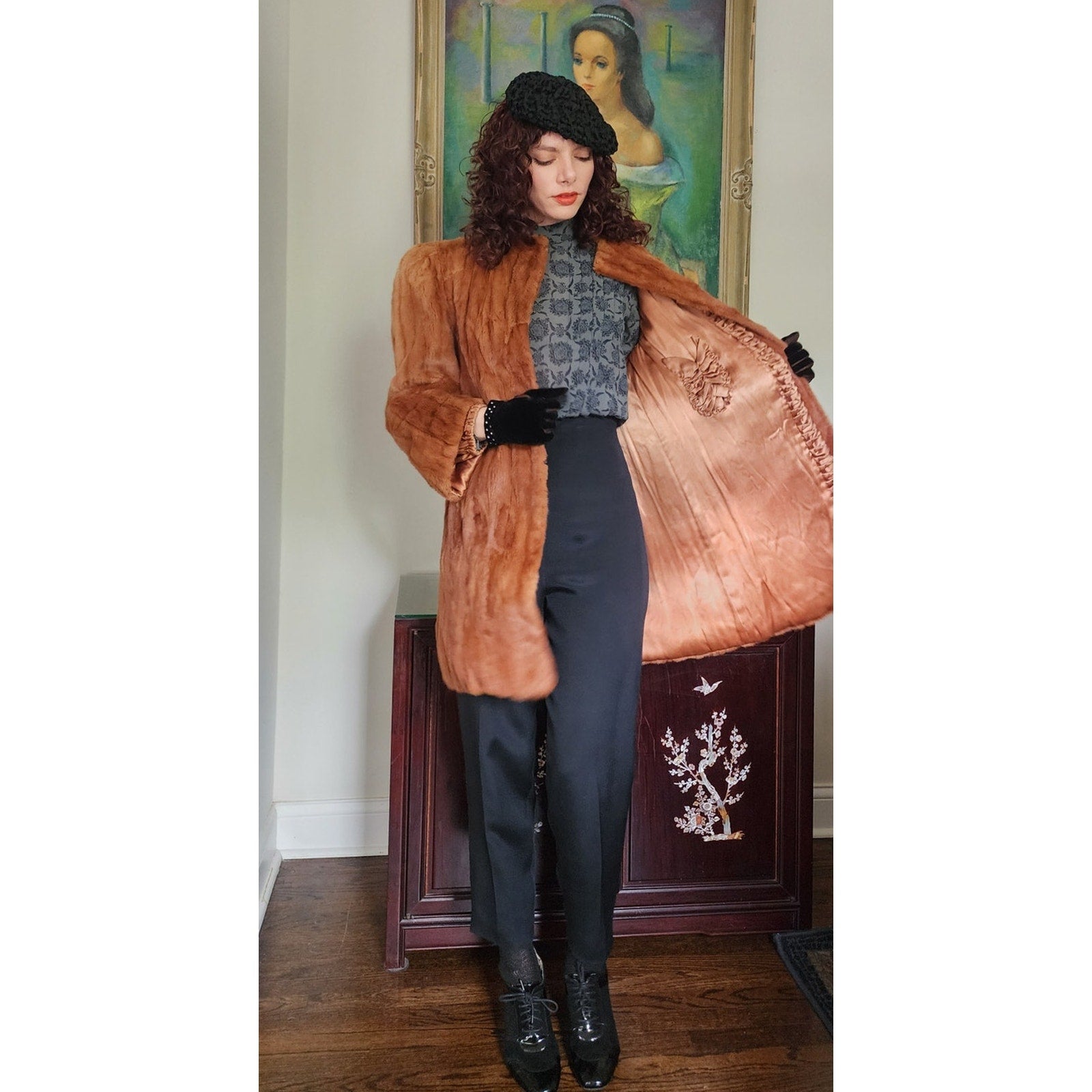 Summer ermine fur coat with padded shoulders and wide, long sleeves that have the "wind sleeve" elastic inner cuff liner! Collarless, it is cut on a very slight A line along the body it closes up to the neck with hidden hooks at center front. No pockets. Very luxurious liner in a copper colored silk satin with tufted edges and a small pocket at left interior.