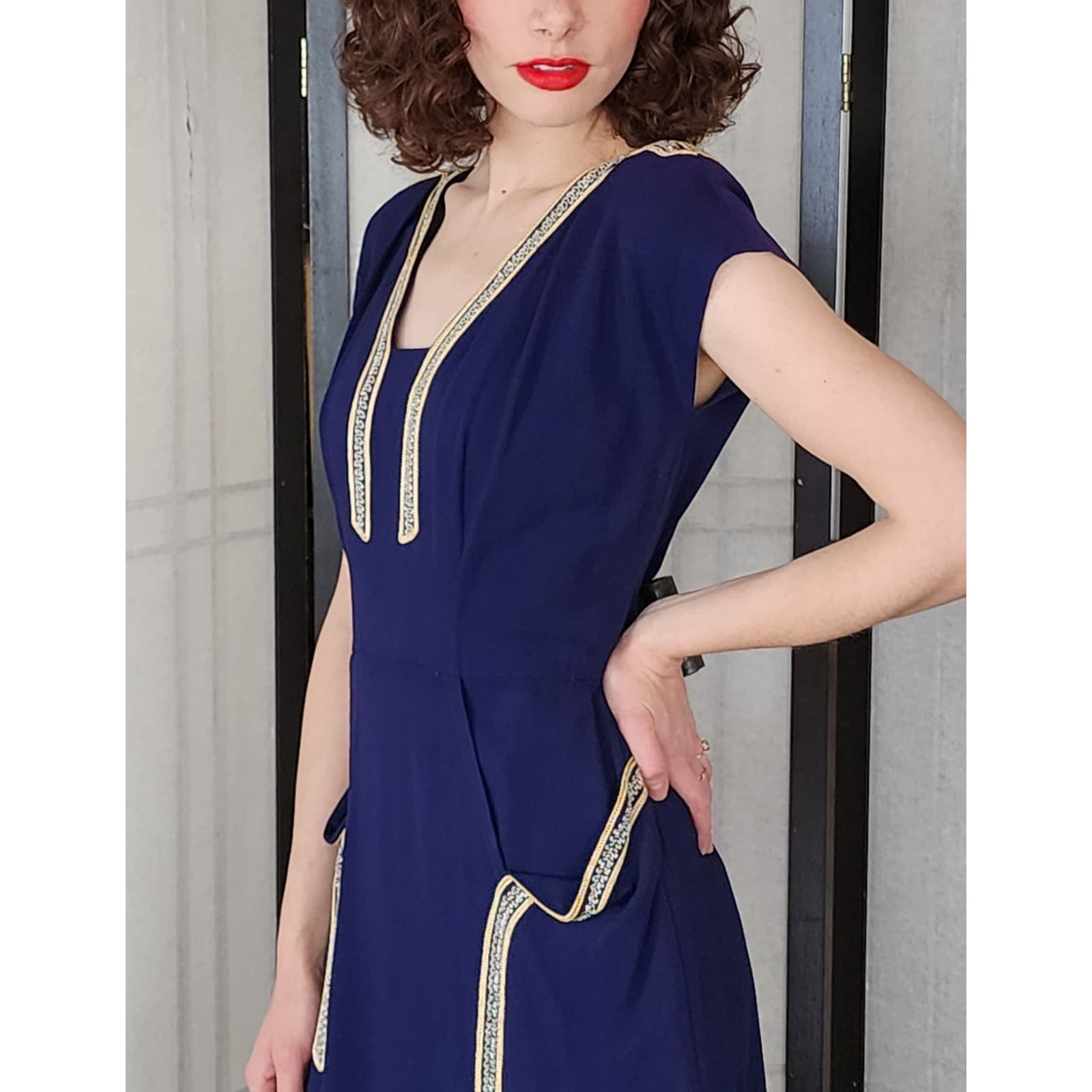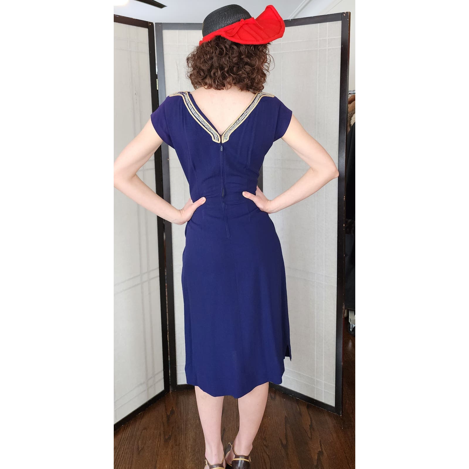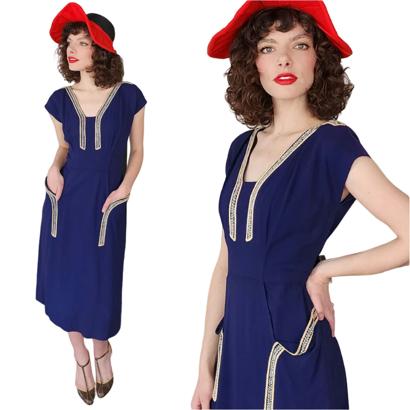 Vintage 40s Navy Blue Dress Beaded Rayon