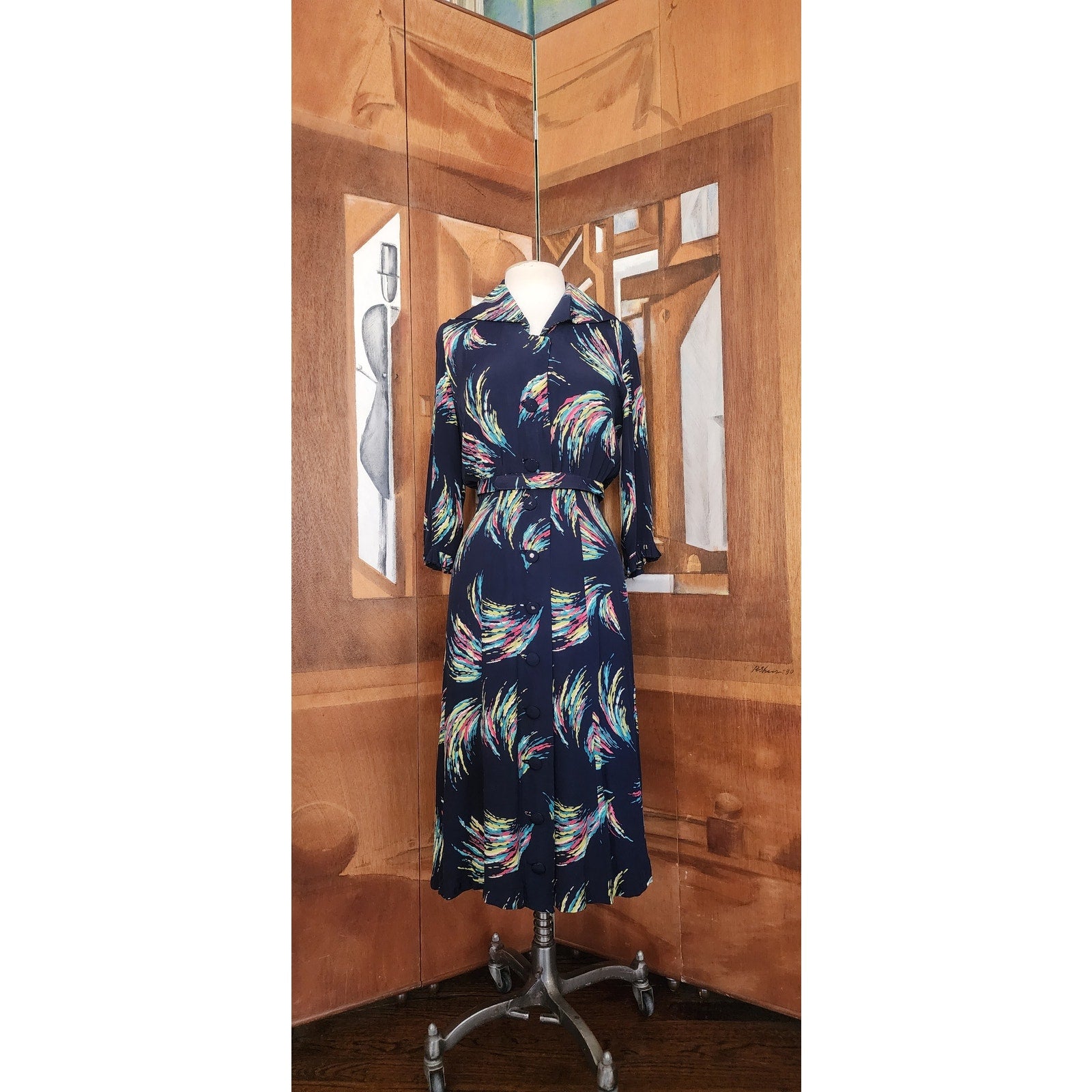 Vintage 40s Rayon Print Midi Dress Navy Blue Painterly Print / S