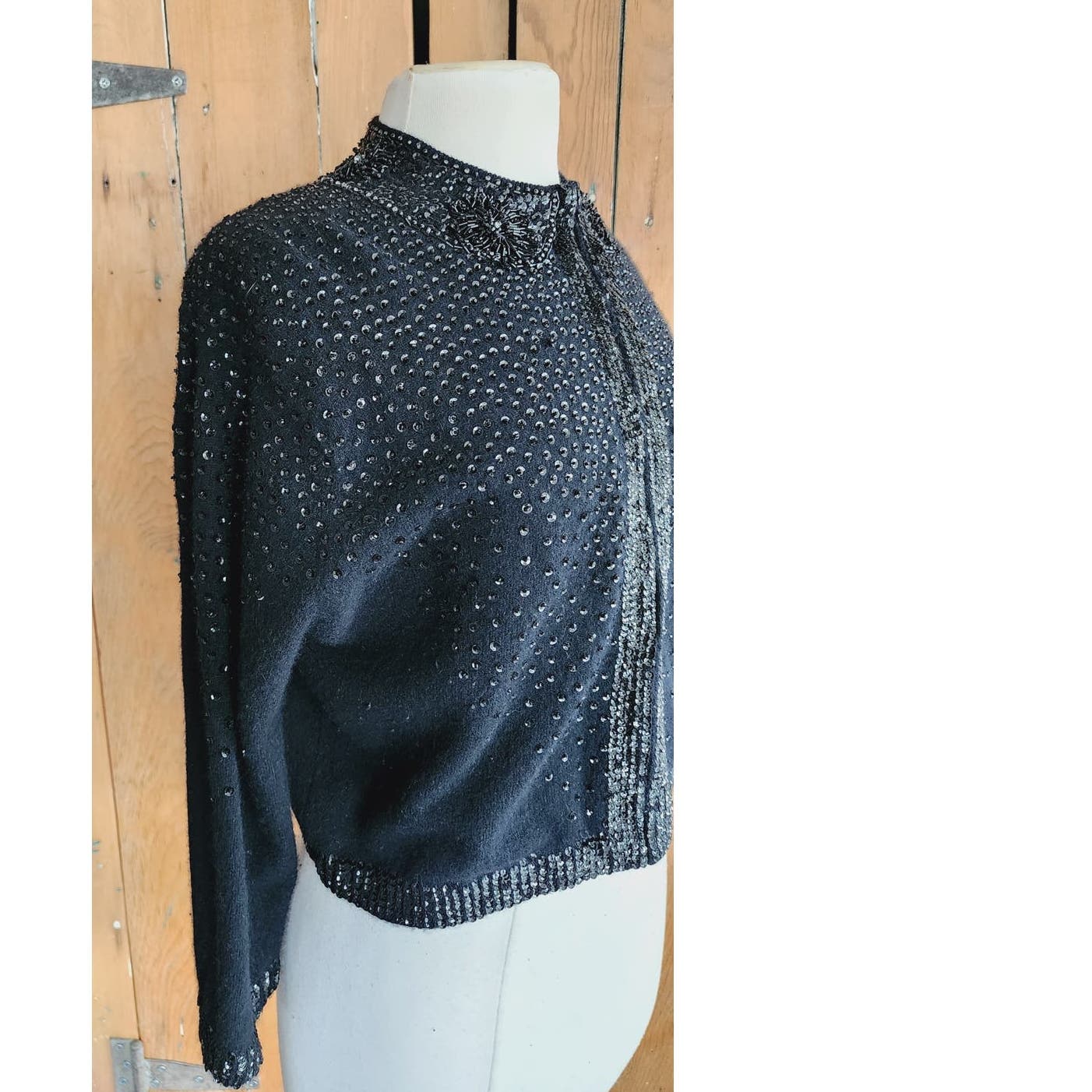 Sweet little sweater that closes with hidden hooks at the center front, it is heavily beaded in jet black beads and sequins, with the neckline trimmed in an ornate pattern, made to look like a peter pan collar. Fully lined at the interior.