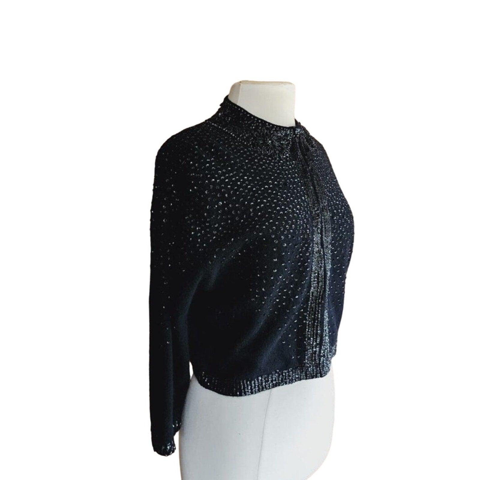 Sweet little sweater that closes with hidden hooks at the center front, it is heavily beaded in jet black beads and sequins, with the neckline trimmed in an ornate pattern, made to look like a peter pan collar. Fully lined at the interior.