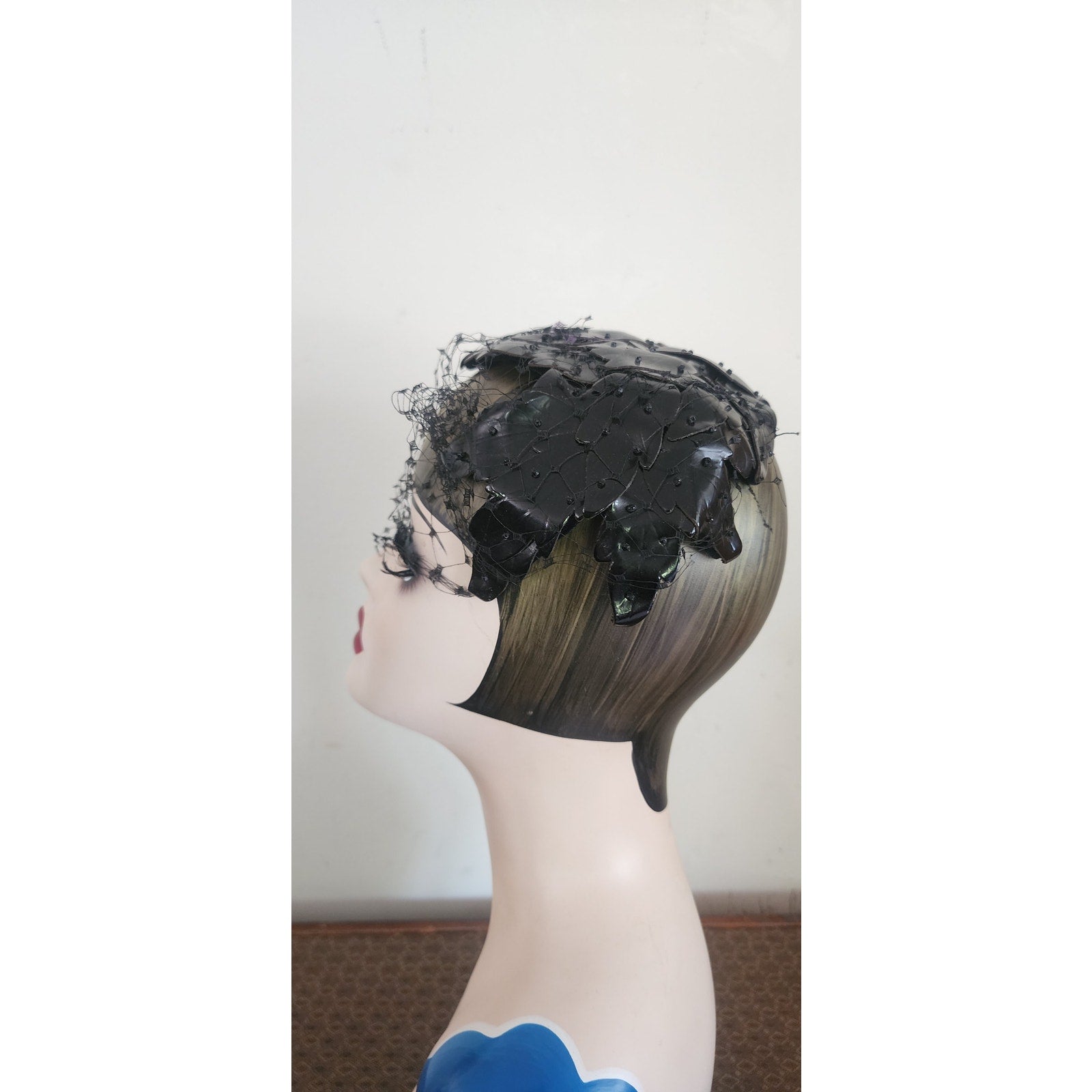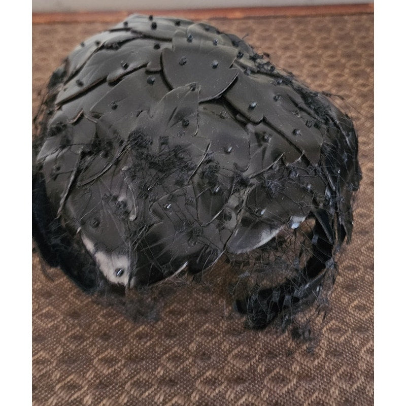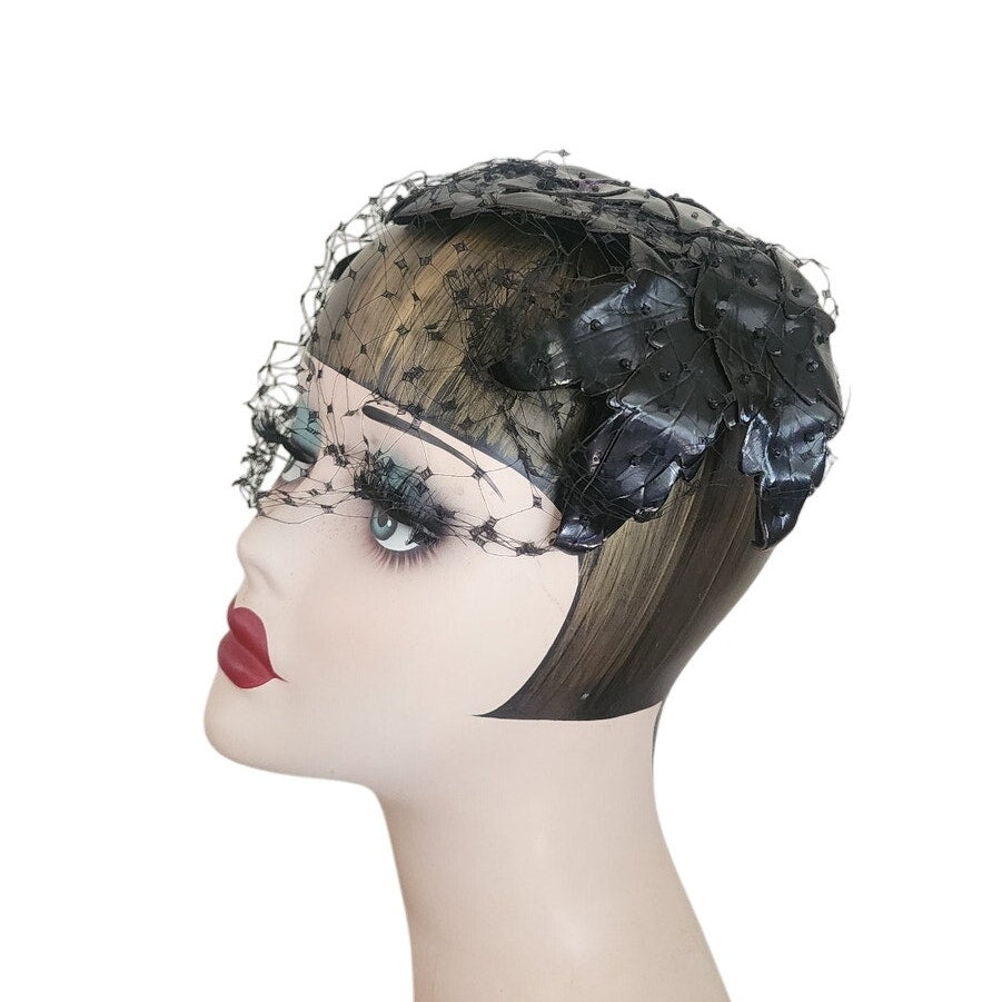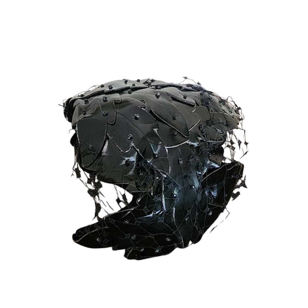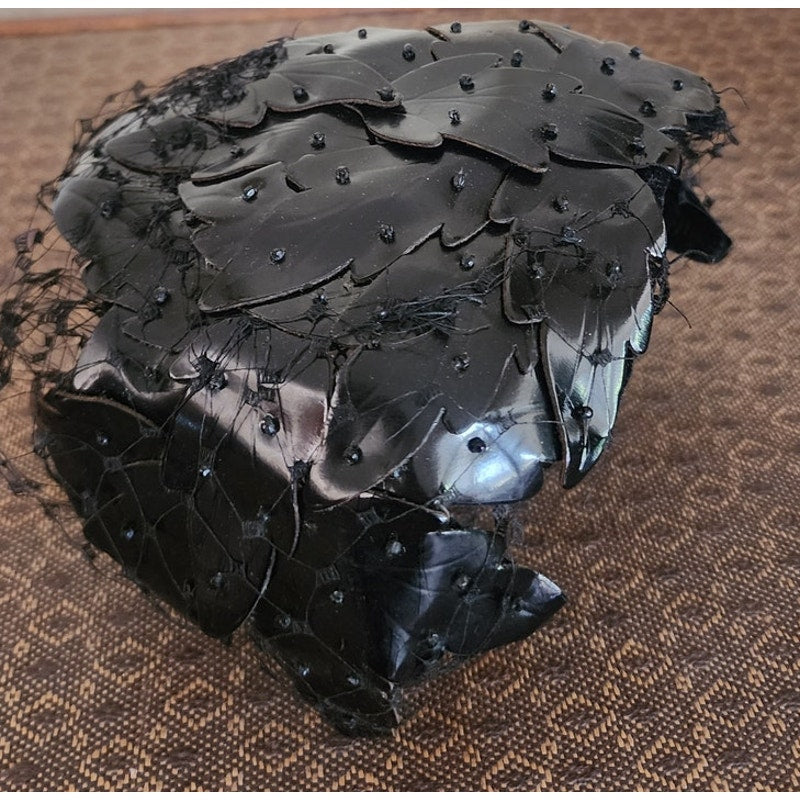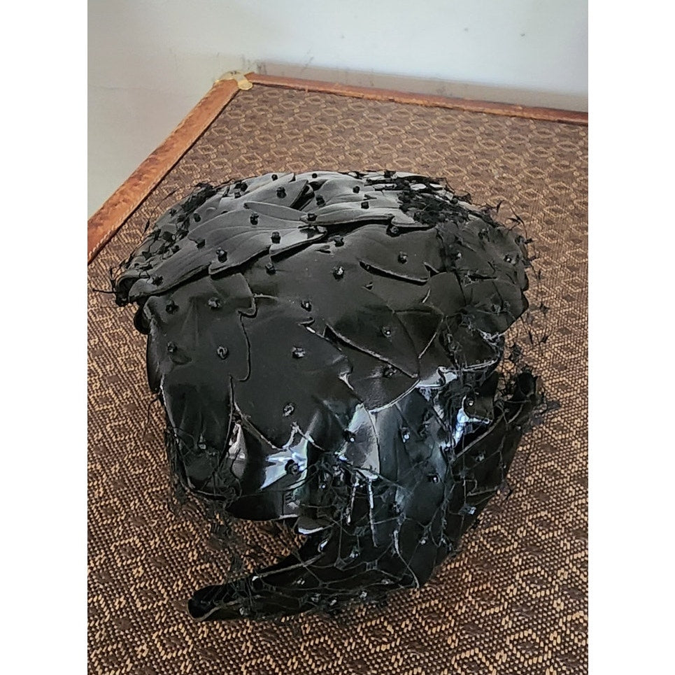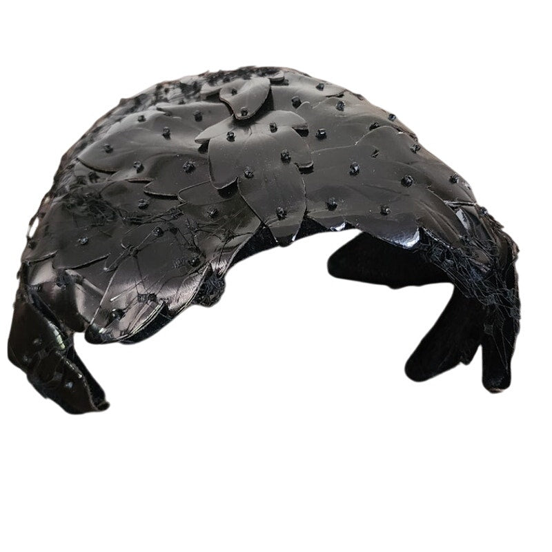 Headband style hat consisting of petals or leaves cut out of a shiny, lacquered, black leather. Conforms to the head thanks to the semi-flexible frame. Black veil is suspended from the front. This is a typical piece by the great Mad Hatter himself: Bes-Ben of Chicago! Interior edge is lined in black velvet, but there is no maker's label. However, this piece bears all the hallmarks of Bes-Ben's design and workmanship and has been verified as authentic by the author of the only monograph on the milliner.