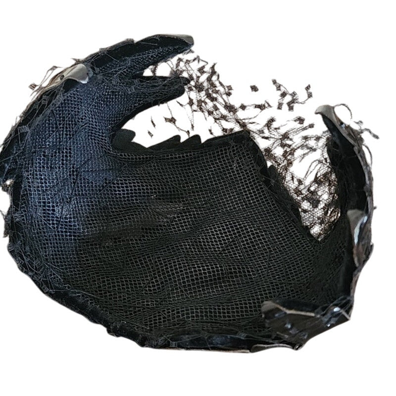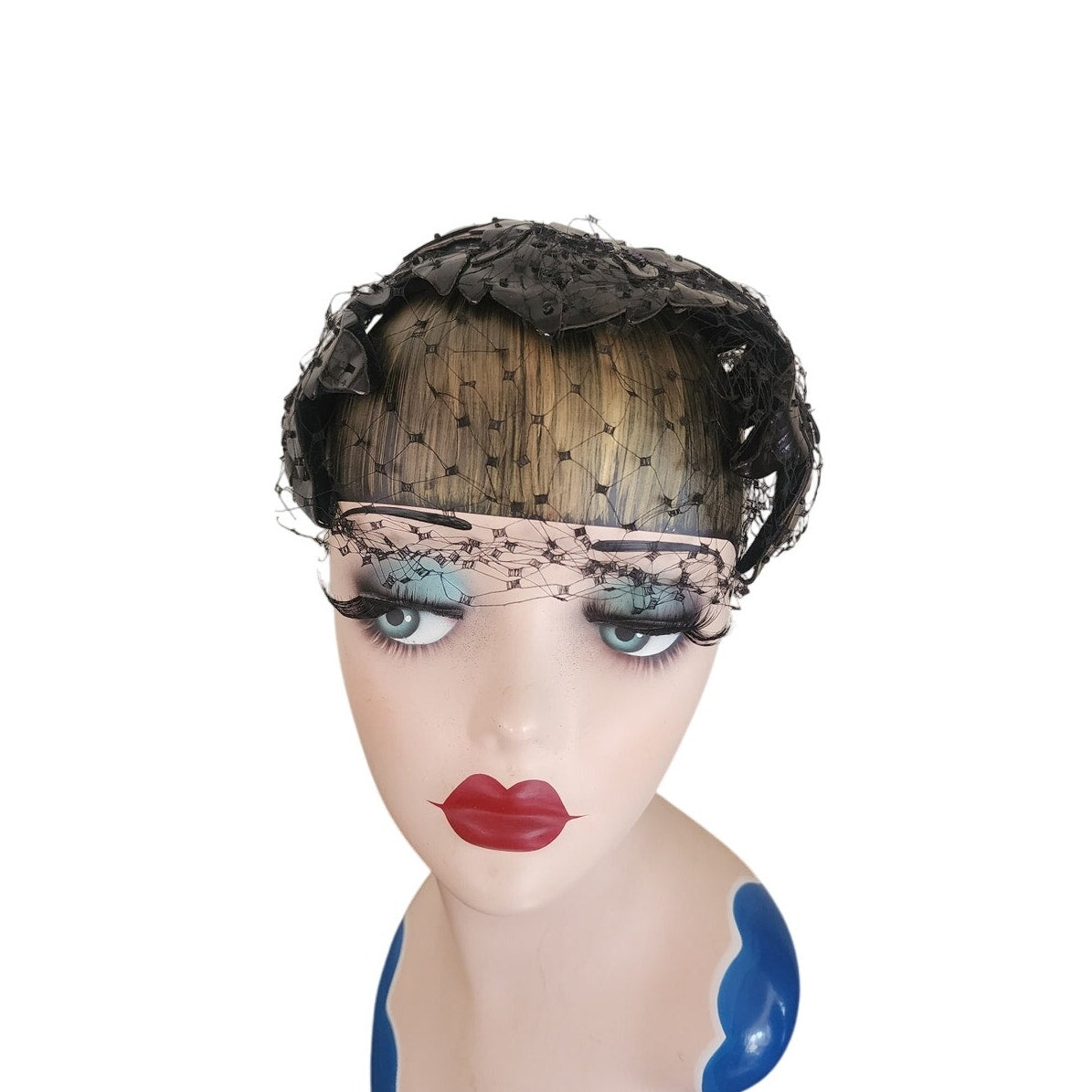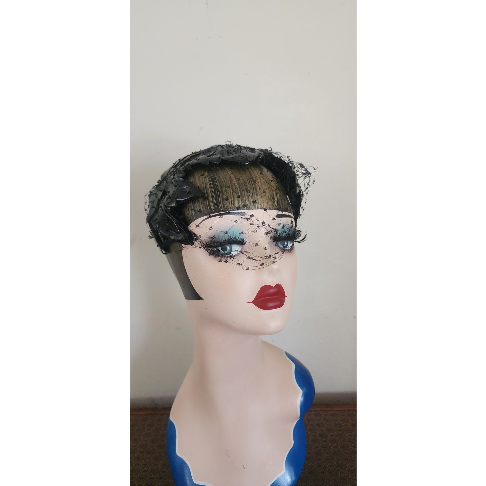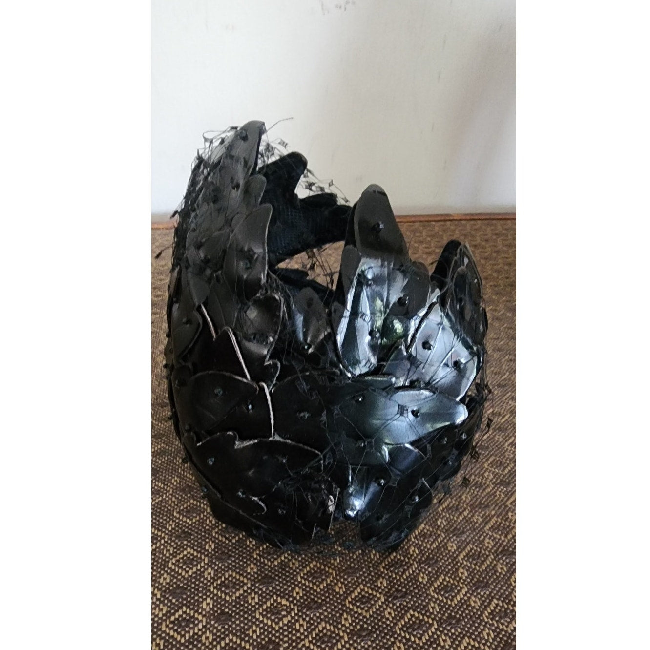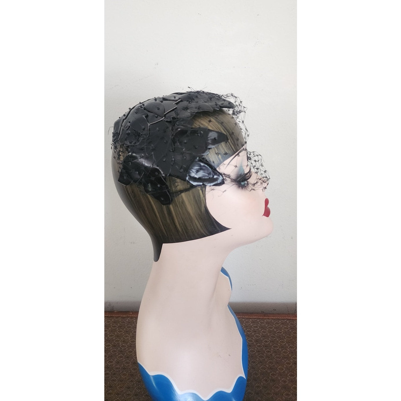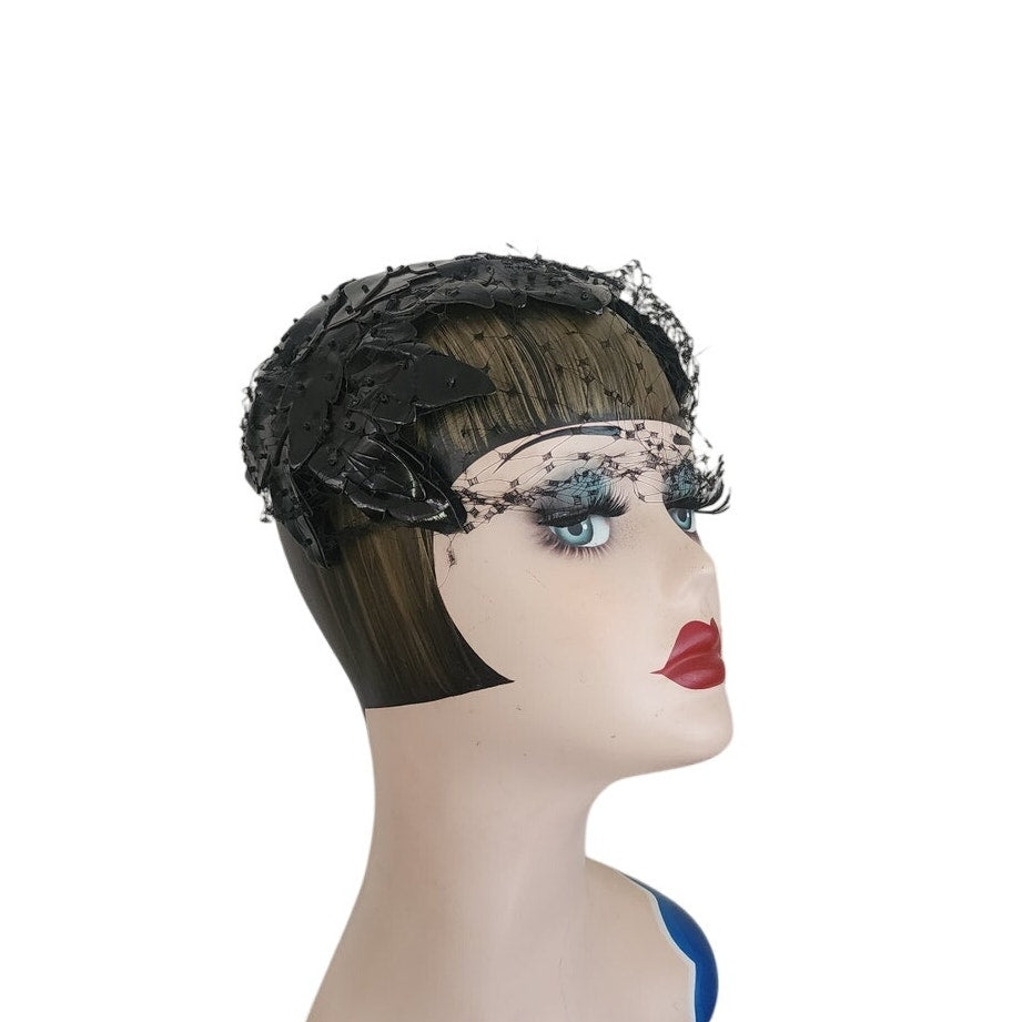 Headband style hat consisting of petals or leaves cut out of a shiny, lacquered, black leather. Conforms to the head thanks to the semi-flexible frame. Black veil is suspended from the front. This is a typical piece by the great Mad Hatter himself: Bes-Ben of Chicago! Interior edge is lined in black velvet, but there is no maker's label. However, this piece bears all the hallmarks of Bes-Ben's design and workmanship and has been verified as authentic by the author of the only monograph on the milliner.