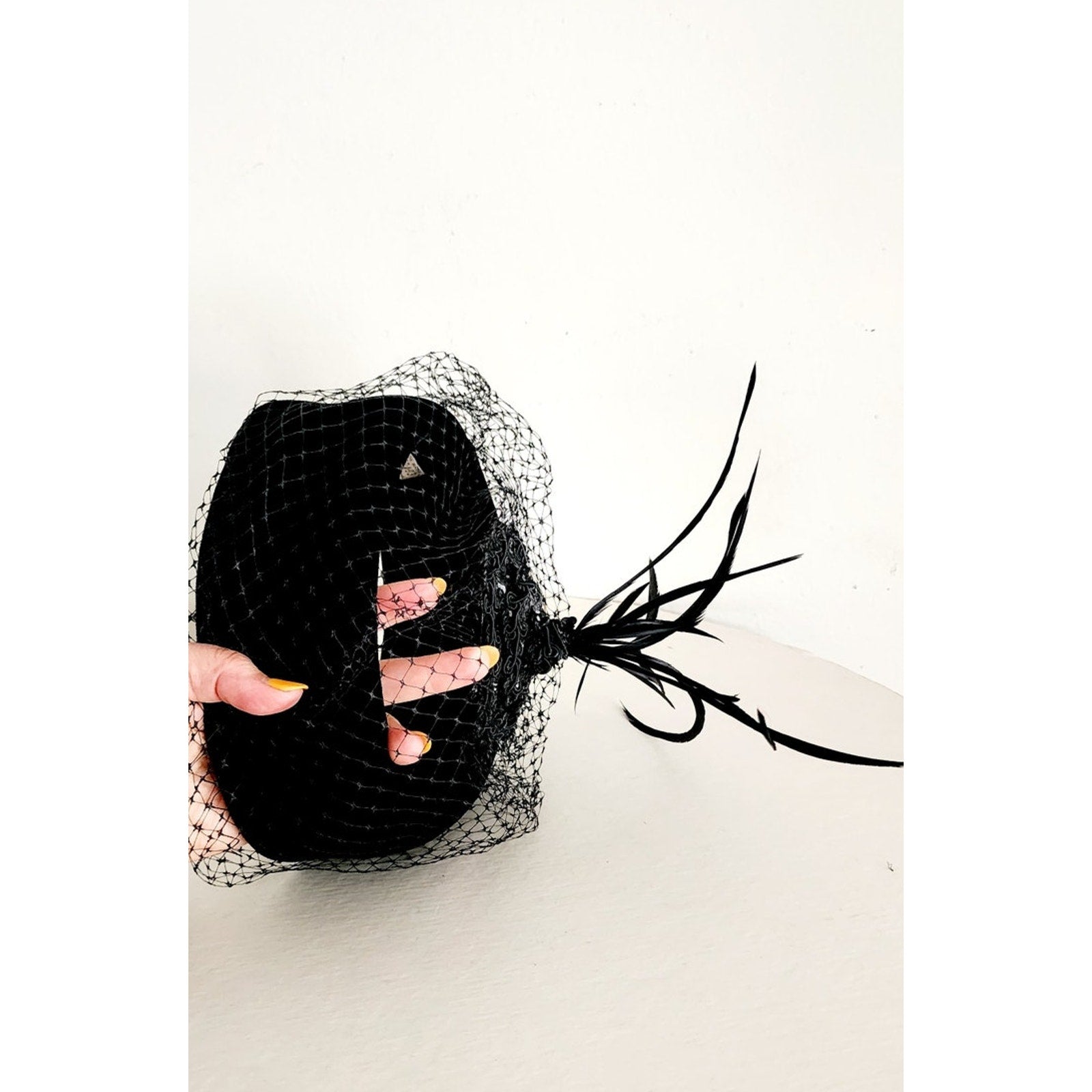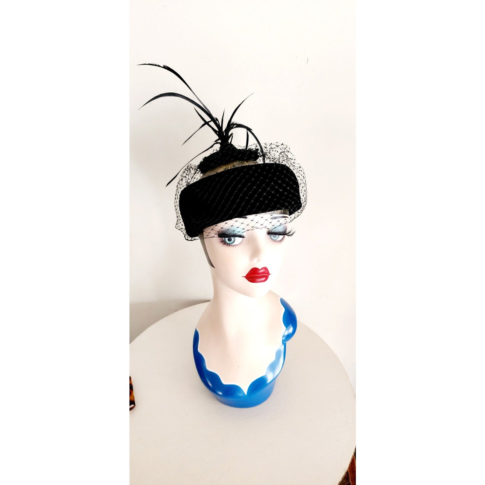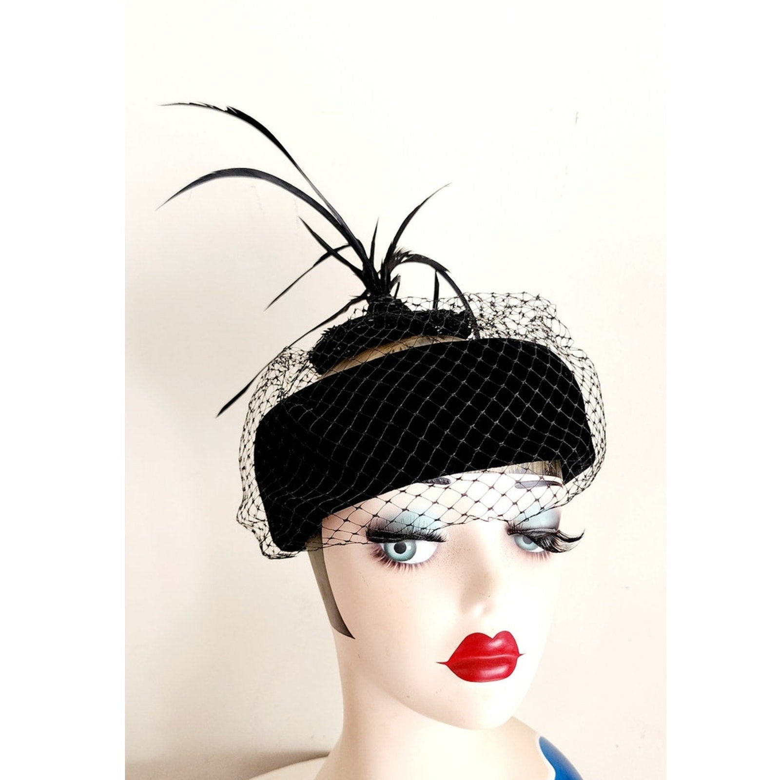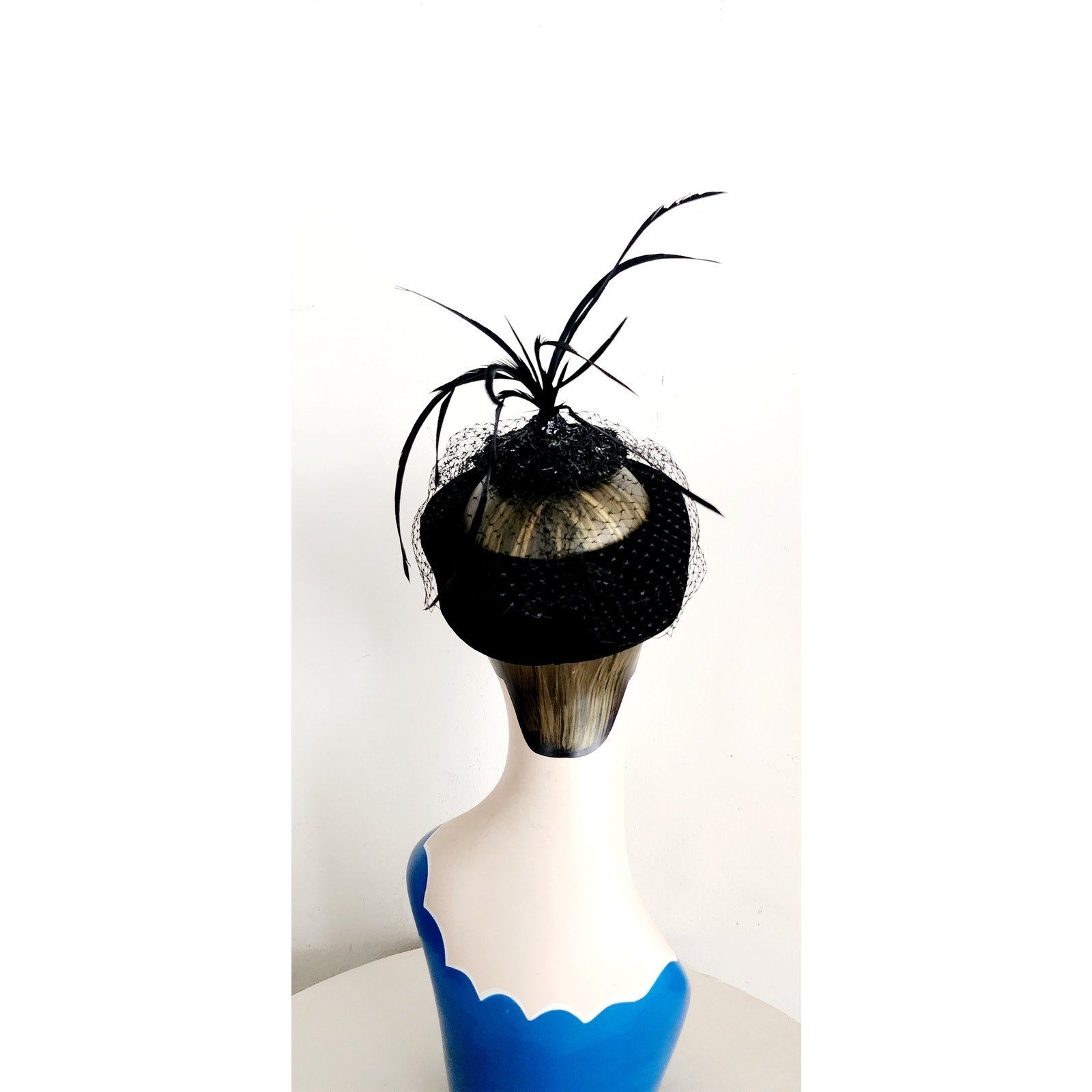 Vintage 50s Black Cocktail Hat Velvet Pillbow w/Mesh and Tall Feathers