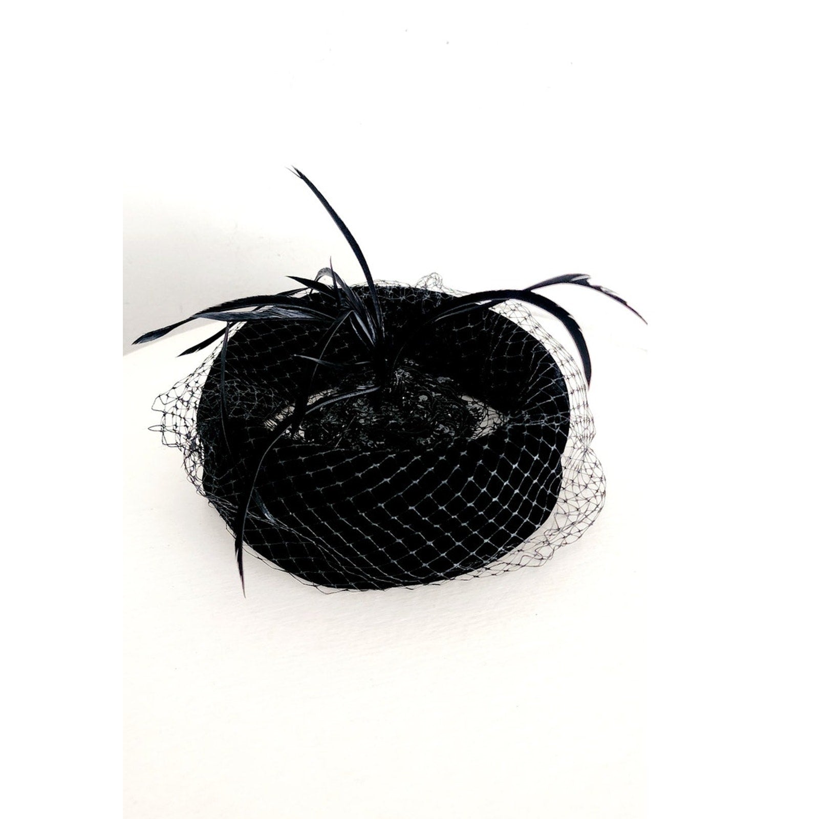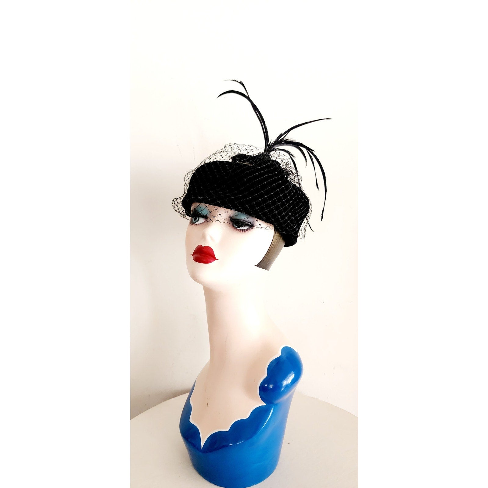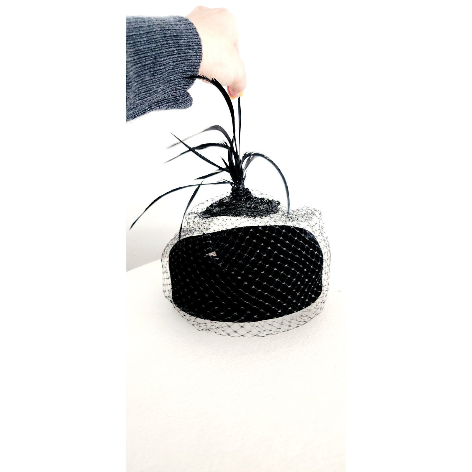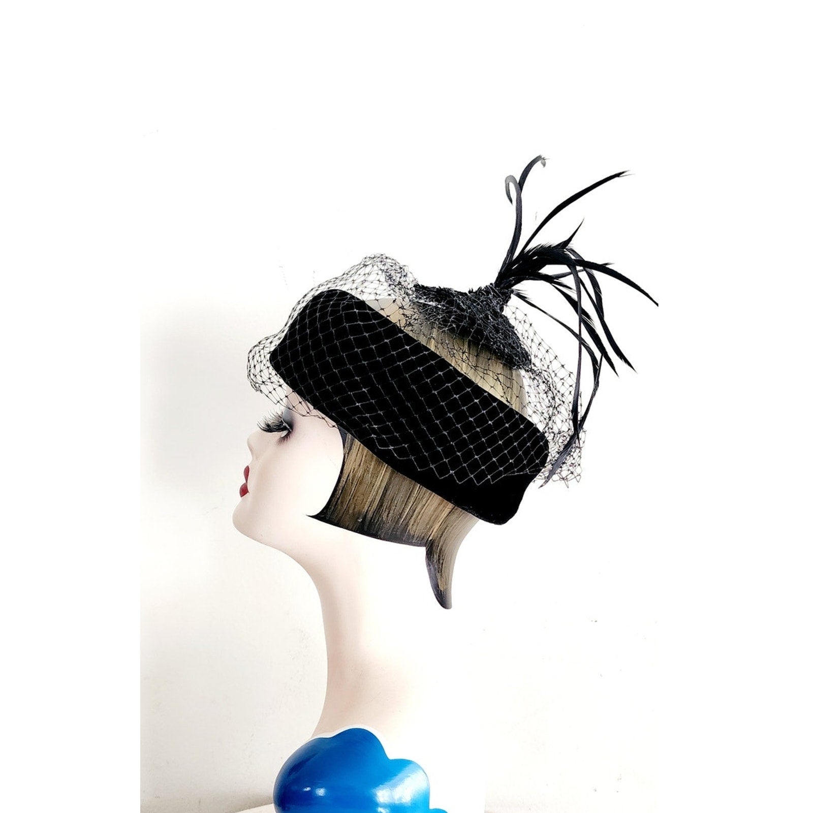 Vintage 50s Black Cocktail Hat Velvet Pillbow w/Mesh and Tall Feathers