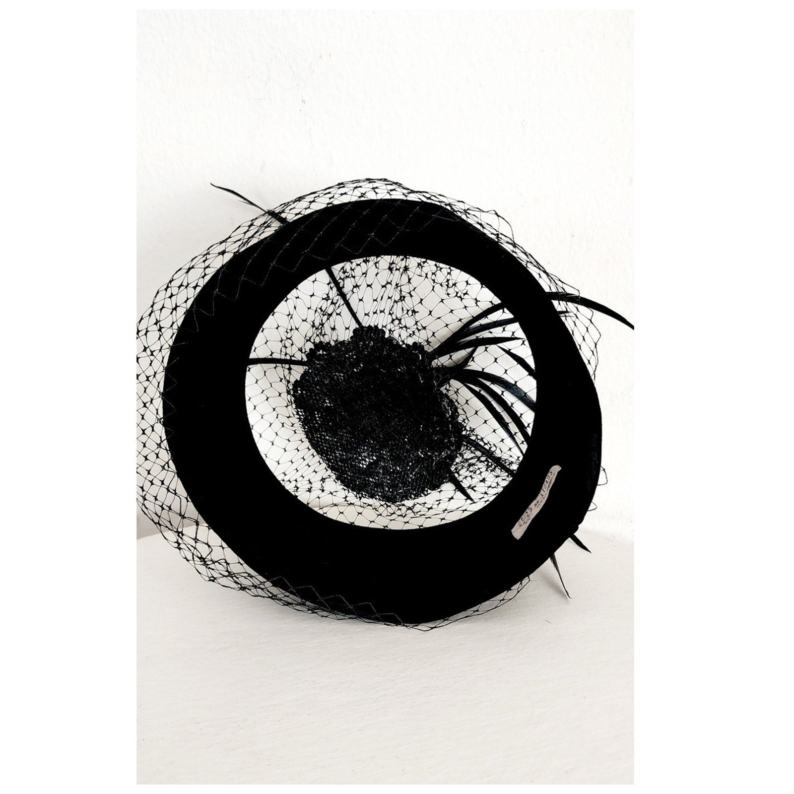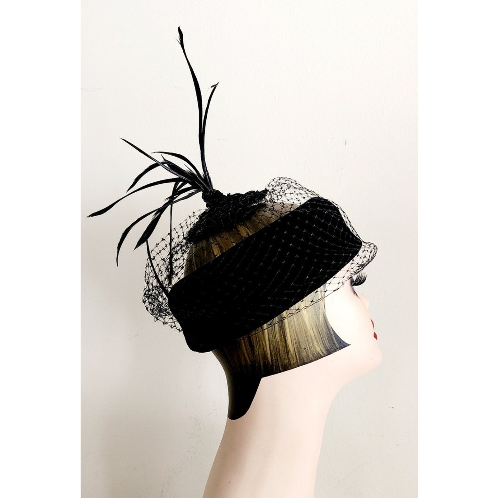 Turn heads when they see your head in this black velvet fascinator with an open crown that is covered by a black veil. Top of center has an insert in black embroidered trim and sequins out of which, vertical, long, black feathers emerge like a sculpted bird! Fun, modernist with a resemblance to a Dr Seuss character, you will stand out! Interior has a union label.