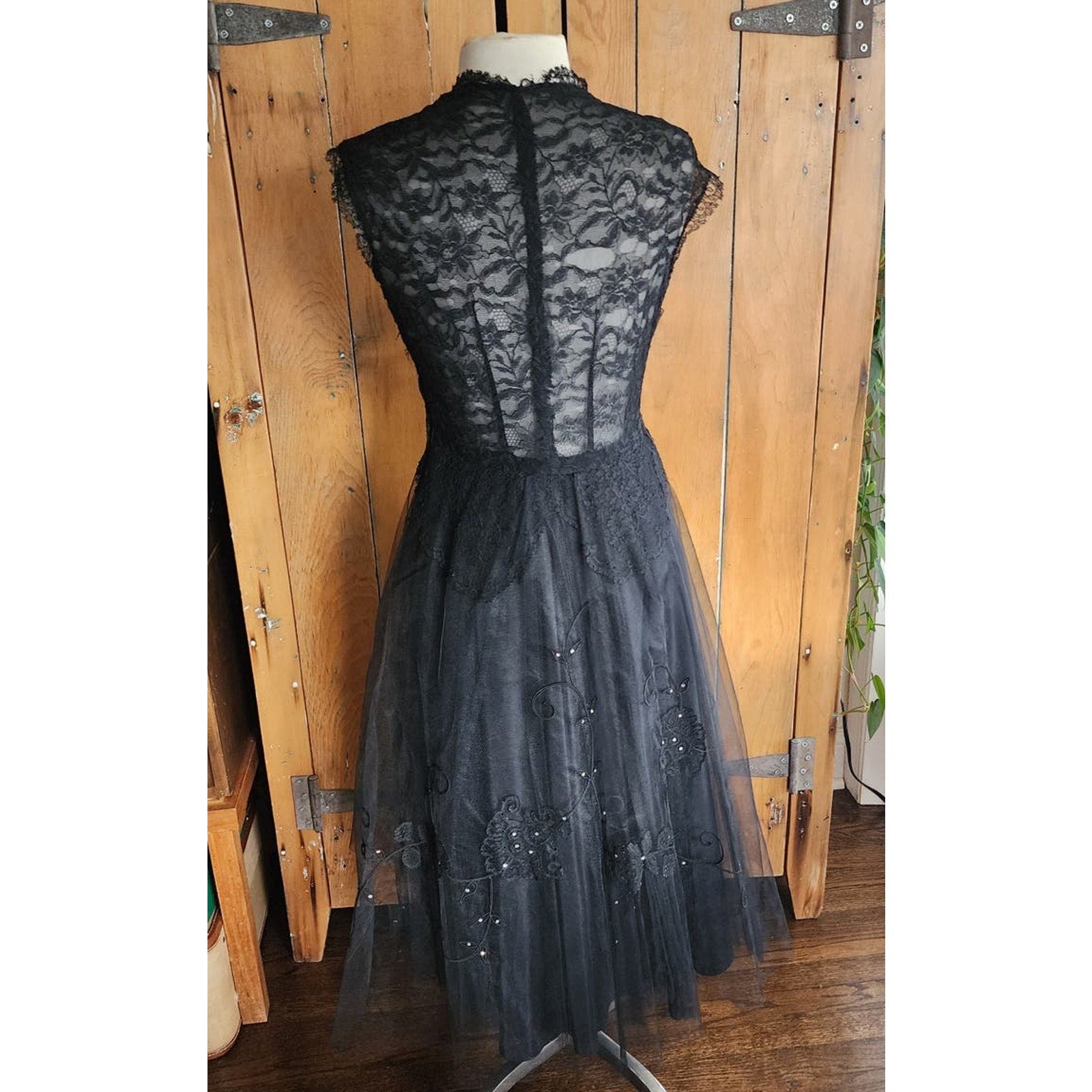 Vintage 50s Black Party Dress Tulle Lace Rhinestones M