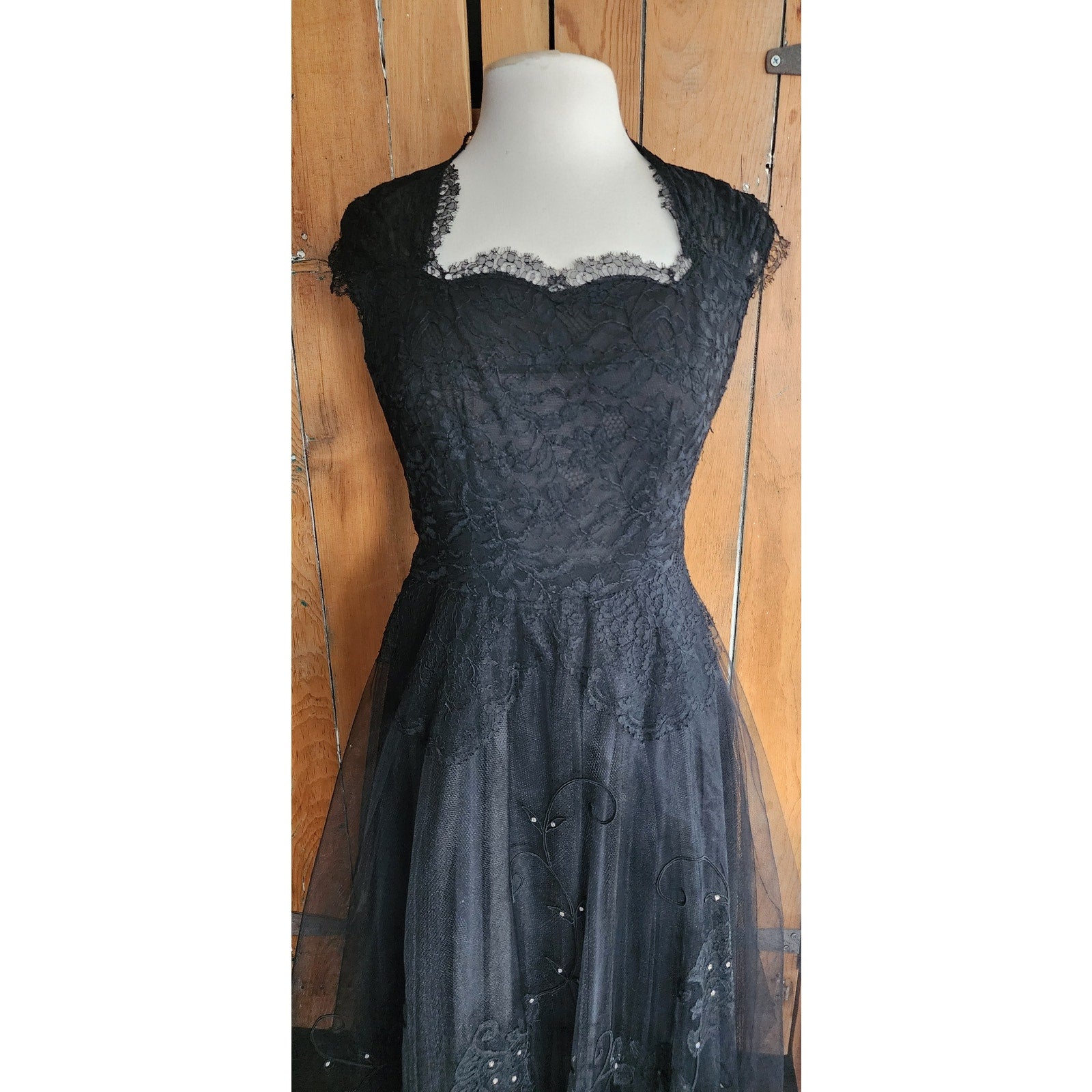 Exquisite and darkly romantic dress with a sweetheart neckline, fitted torso, nipped waist and a full and poofy skirt! The torso and the capped sleeves are in black lace, bleeding down to the top part of the skirt which is in black tulle and embroidered in black silk thread, lace, and rhinestones. Lined in satin, it closes with a zipper at the side.