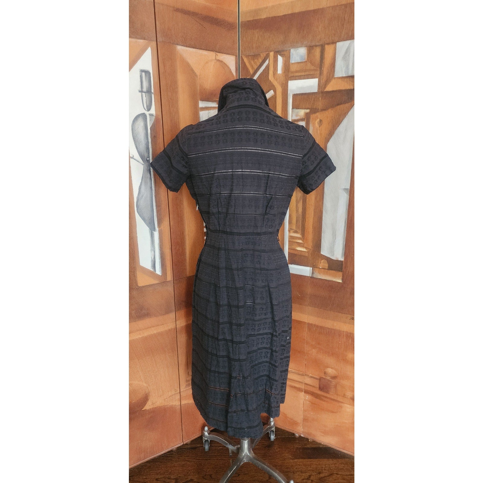 Vintage 50s Black Shirtwaist Day Dress Short Sleeve Textured Stripe Kay Whitney