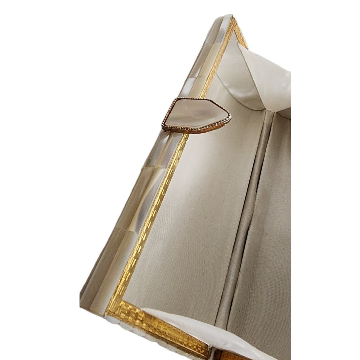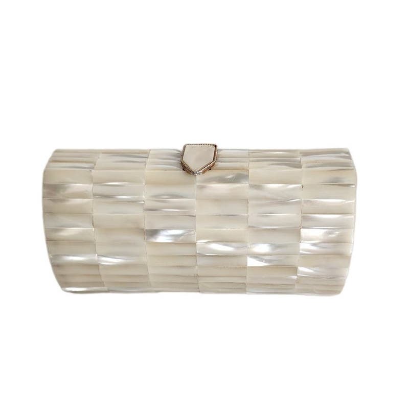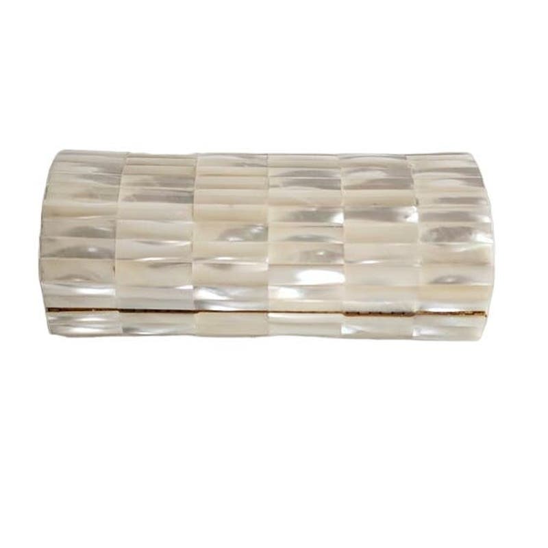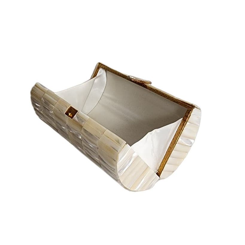 Gorgeous clutch on a hinged body in a cylindrical shape, consisting of shiny panels of abalone or mother-of-pearl, with a lovely clasp at the top. Interior is lined in satin. No labels. Stunning accessory for your evening out!