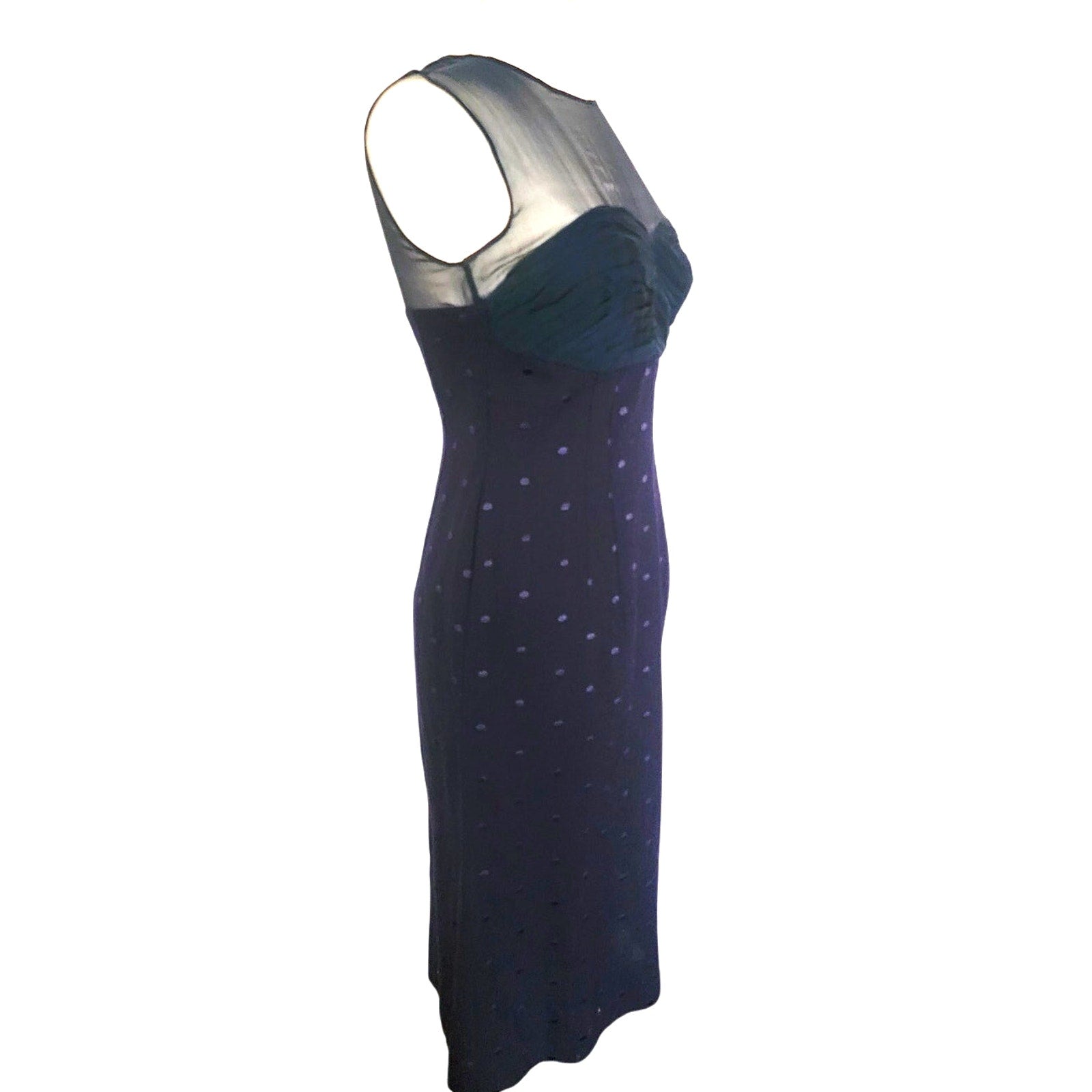 Start with a sleeveless wiggle dress that hugs all your curves and heightens your bust area with a sweetheart neckline defined by pleated silk. The sheer navy blue silk panel from through to bust contrasts in its modesty. The rest of the frock is in a jacquard wool of textured navy-on-navy polka dot print. The dots have a shimmer against the wool, thanks to their satin finish. Kick pleat at center rear. Fully lined.