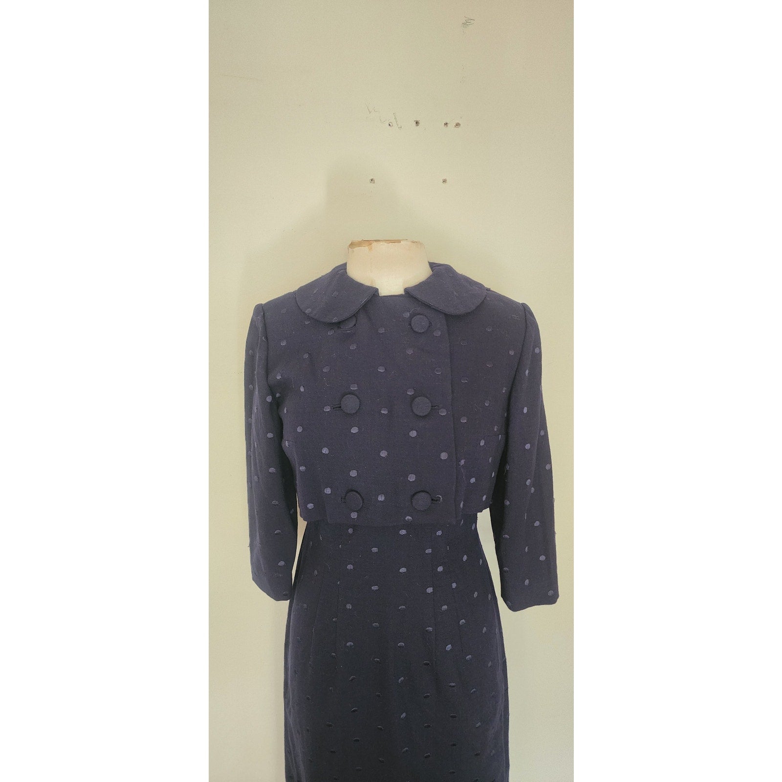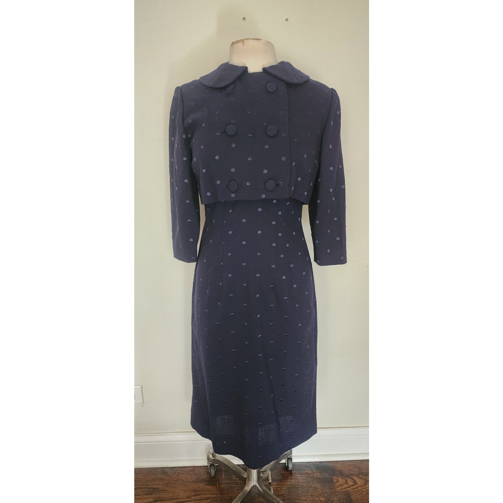 Vintage 50s Dress Jacket Suit Set Navy Blue Polkadot Wool Silk Bombshell Wiggle Viva Las Vegas
