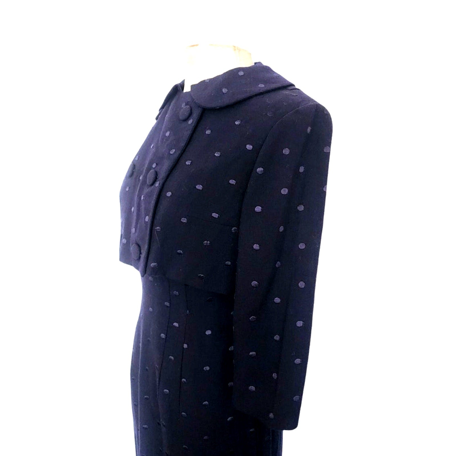 The matching jacket is cropped, double breasted, and with a peter pan collar. It's demure appearance acts as a surprising foil to the bombshell frock underneath! No lining.