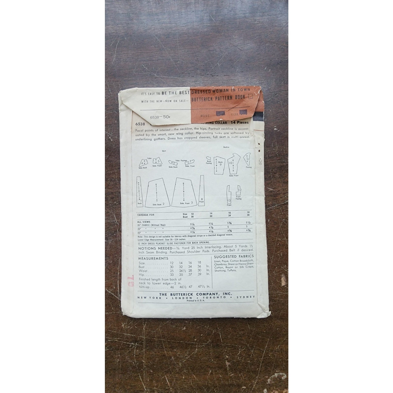 Vintage 50s Dress Sewing Pattern: One Piece Dress Wing Collar Butterick 6538 / Bust 34