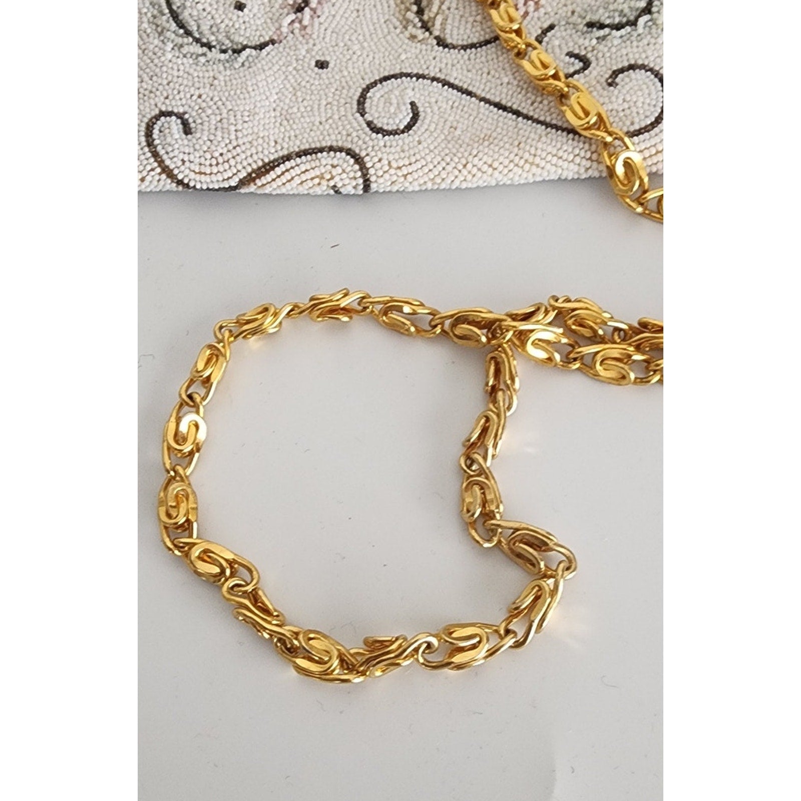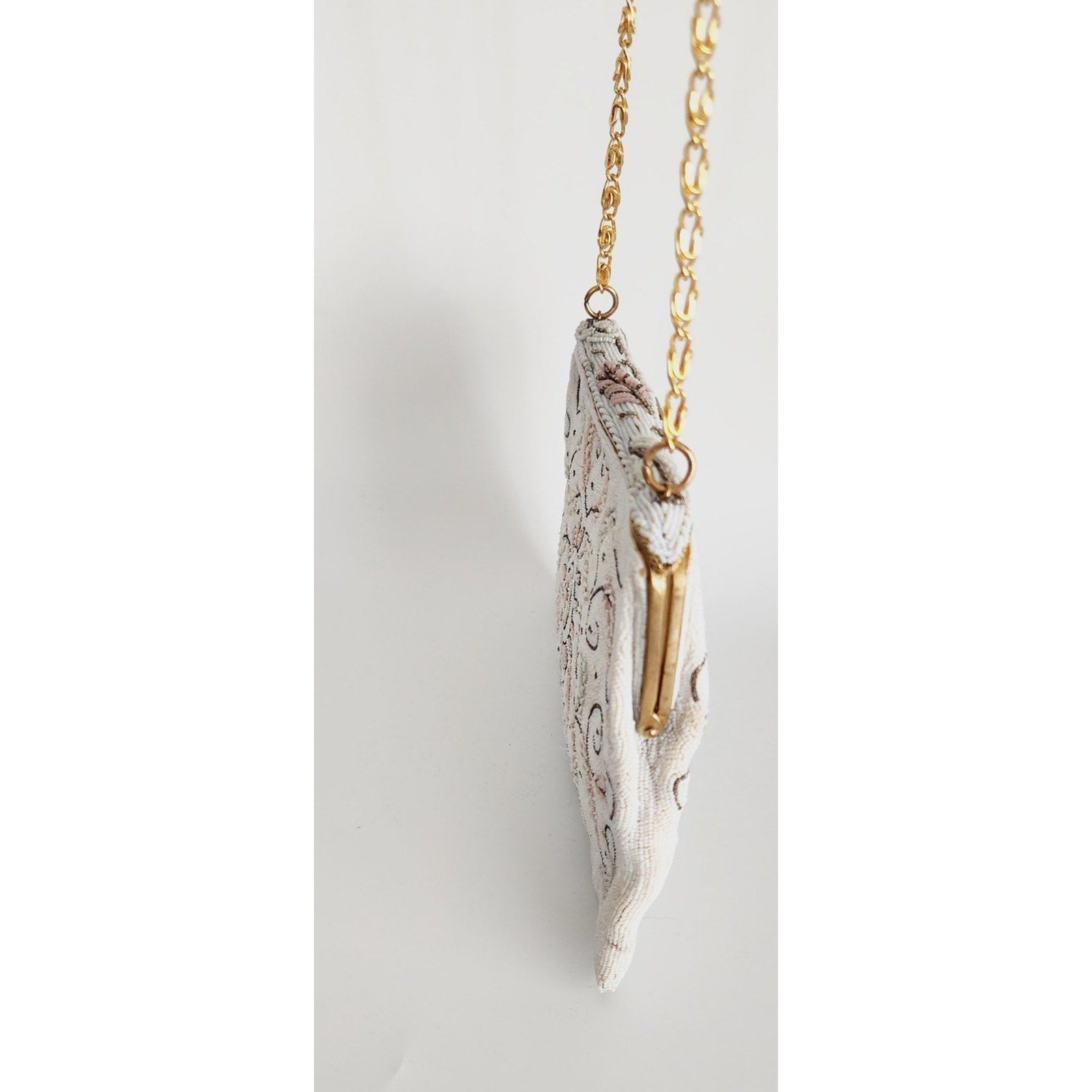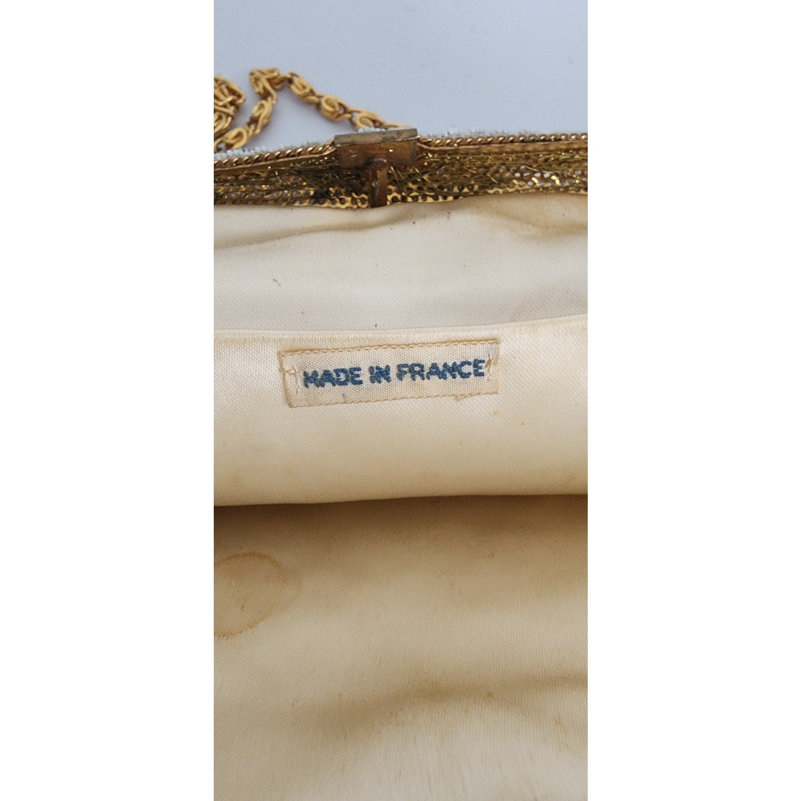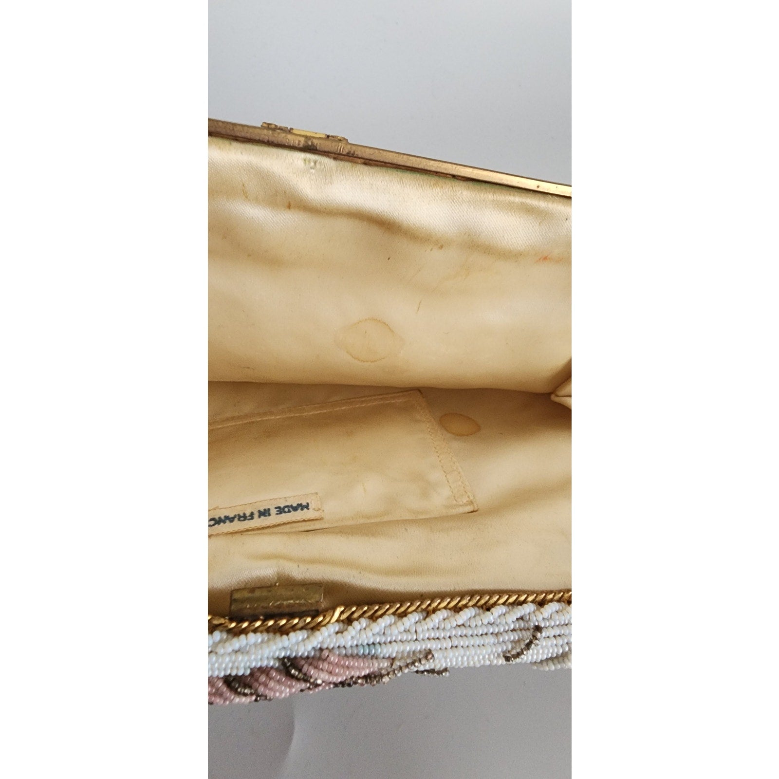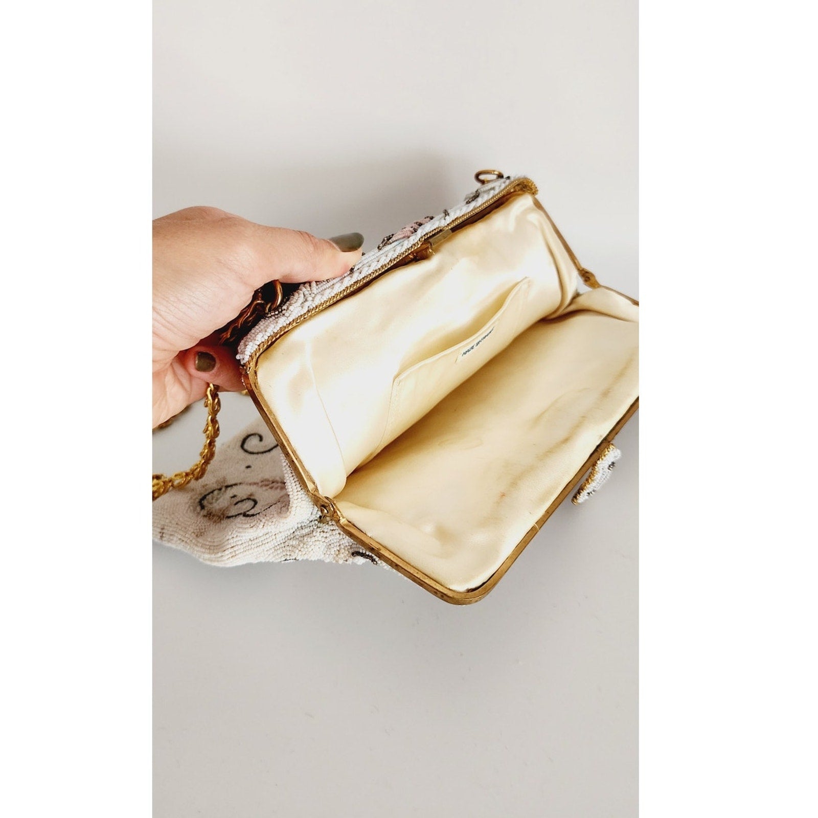 Gorgeous dressy bag in the micro-beaded style, it has a white background with an ornate, octopus-like design of a rosette surrounded by scroll symbols in gray, pin, and ivory. The design is repeated on the rear. Top of the hinged opening is delineated in more detailed beadwork with leaf and branch motifs. Front clasp is a rounded panel of white beads surrounded by a golden metal braid. There is a long, chunky, gold chain shoulder strap to complete the look. Interior lined in cream colored satin and has a small slit pocket. Features a label "made in France".