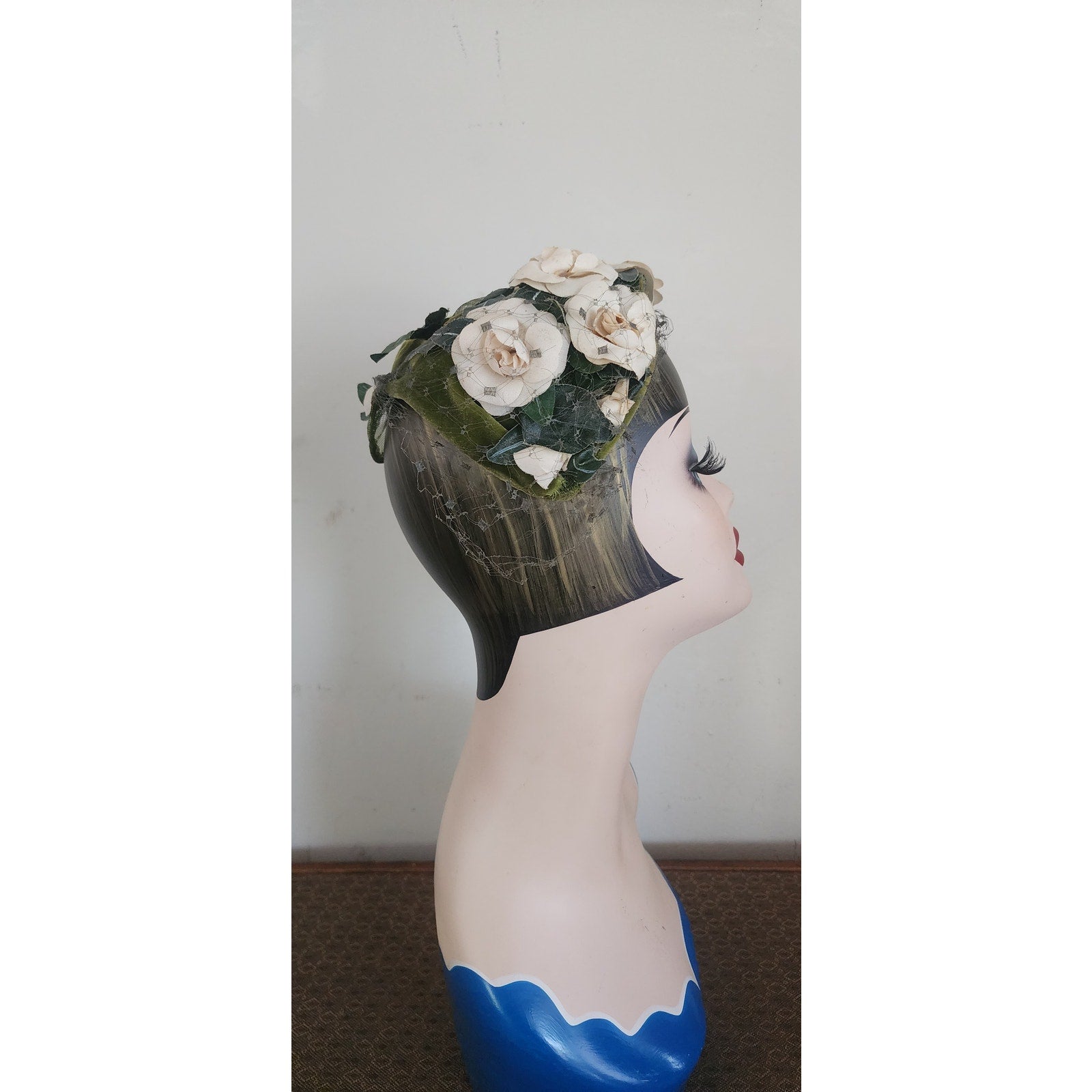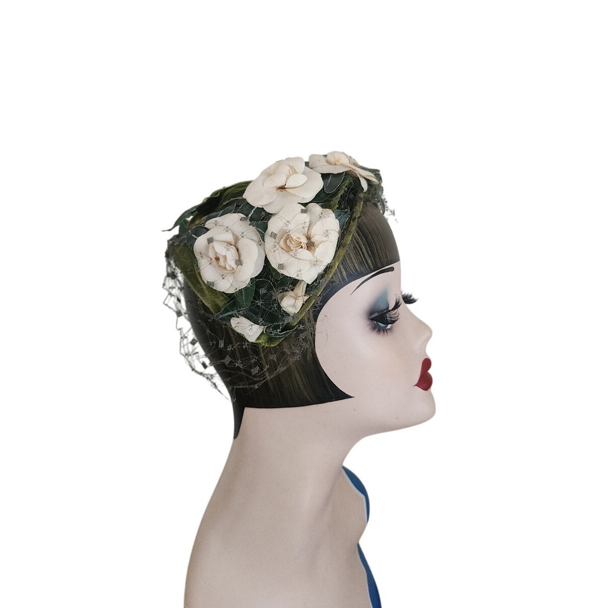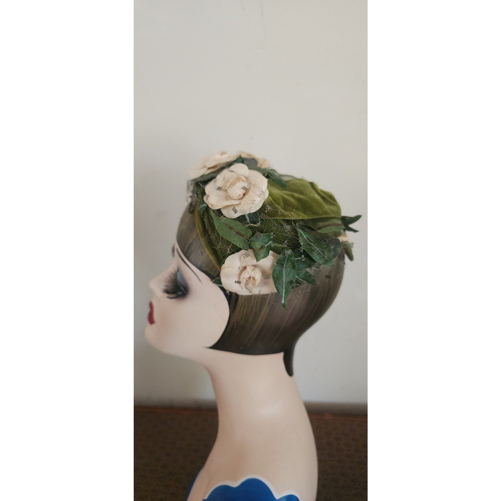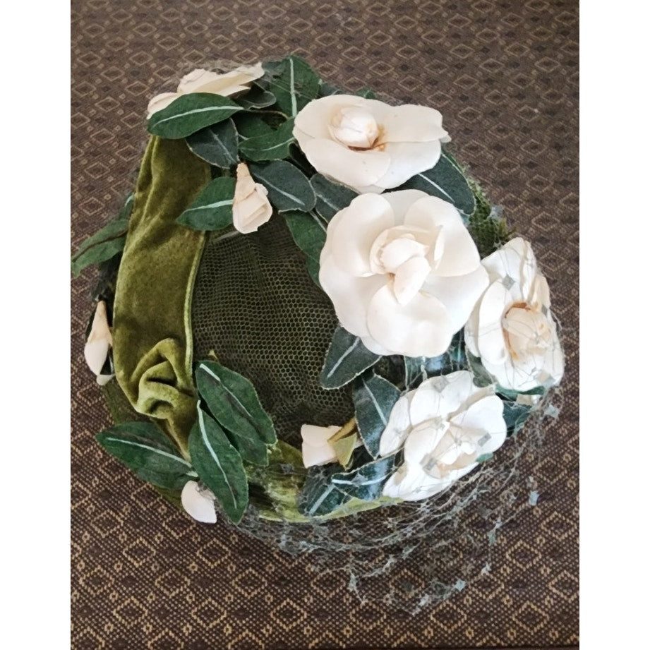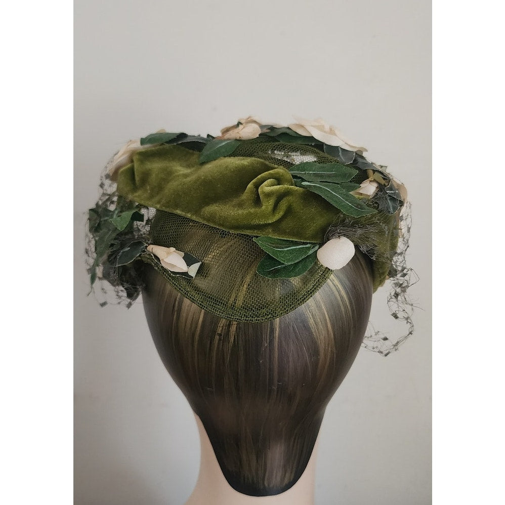 Green velvet frame with mesh at center. Front is festooned in cream silk flowers offset with dark green leaves. Green veil at rear and front. Conforms to the head. Great for vintage bridal looks.