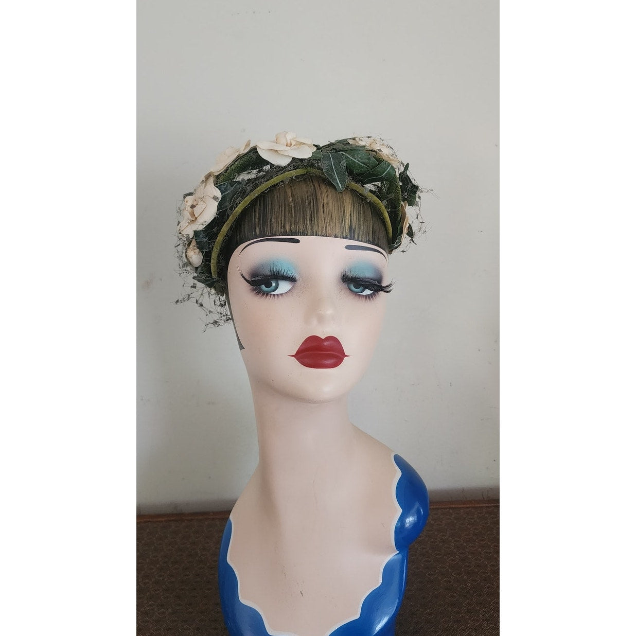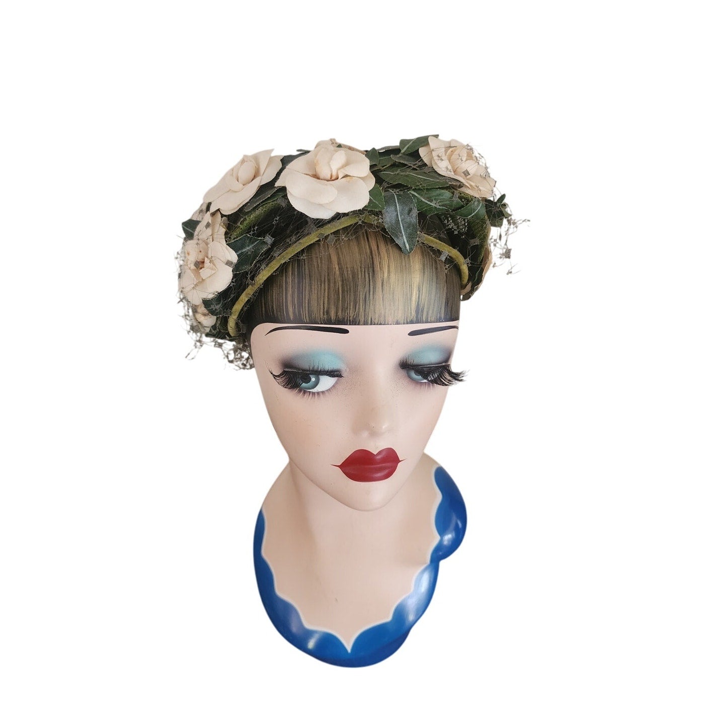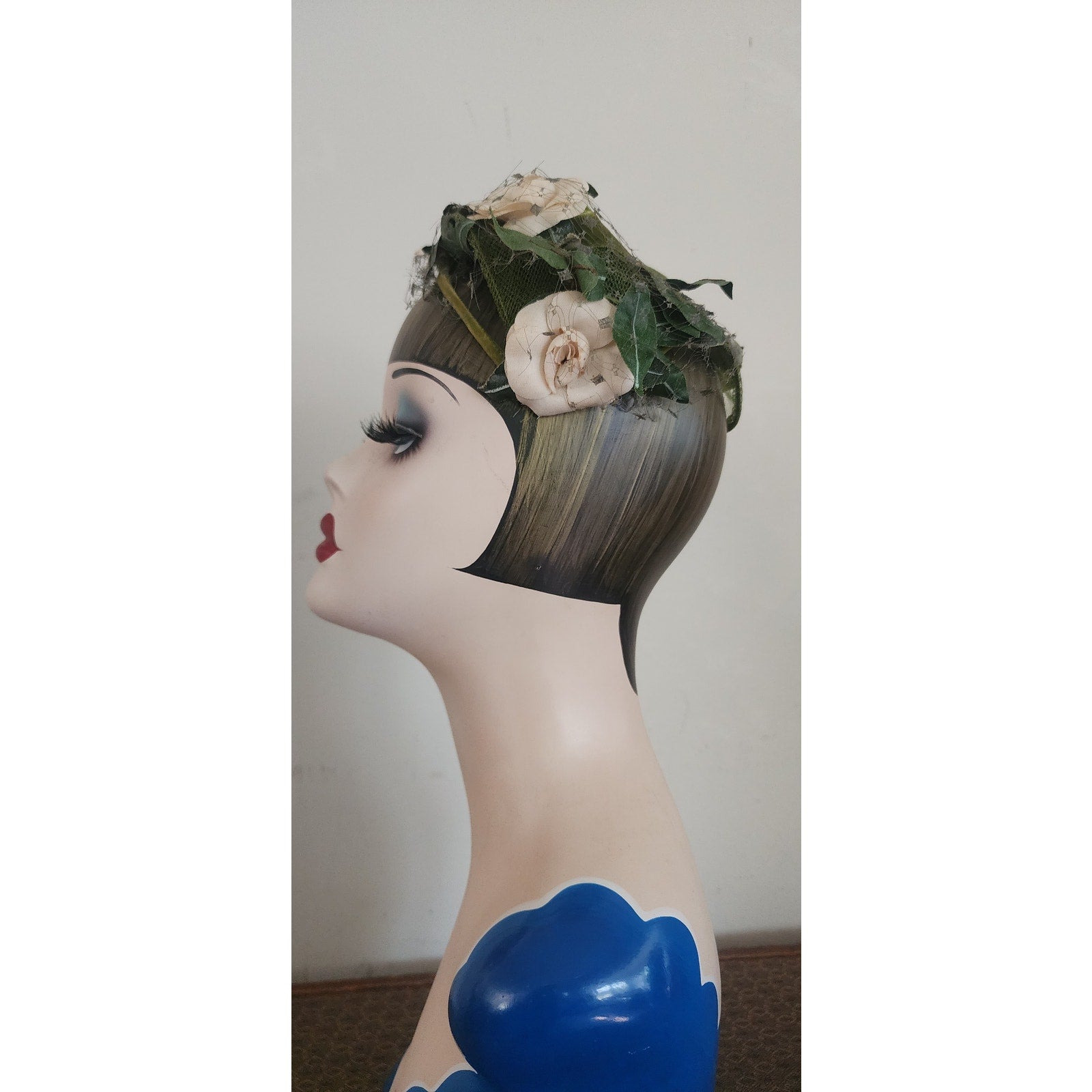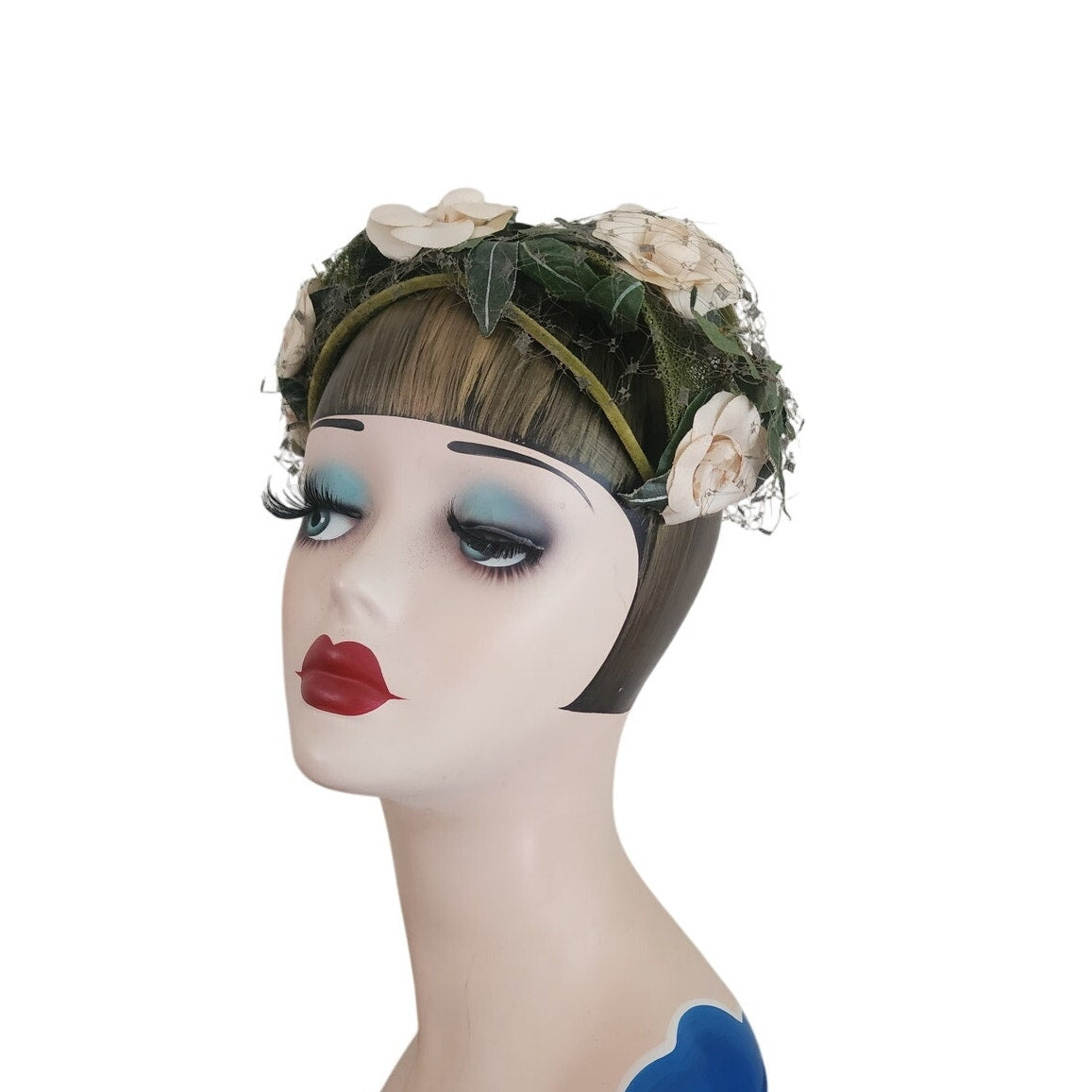 Green velvet frame with mesh at center. Front is festooned in cream silk flowers offset with dark green leaves. Green veil at rear and front. Conforms to the head. Great for vintage bridal looks.