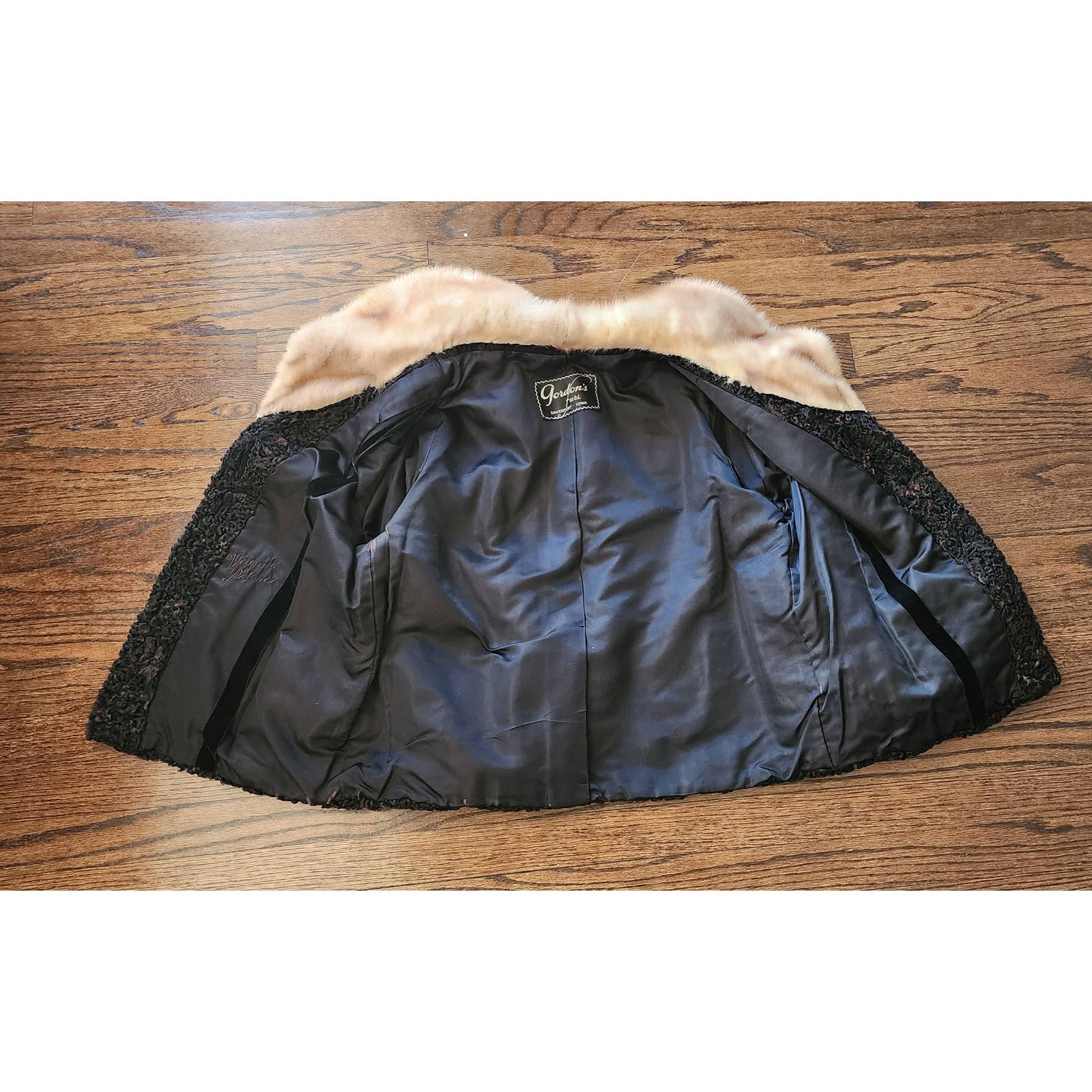 Gorgeous 50s jacket with a large, fold down collar in a light brown mink fur, it is cut straight down the body in a brown and black mottled persian wool and has slit pockets at each hip front and two buttons for closure - one small one at the throat and a larger one at chest. Interior is fully lined and bears the monogram of the original owner, as is typical of furs from this era.