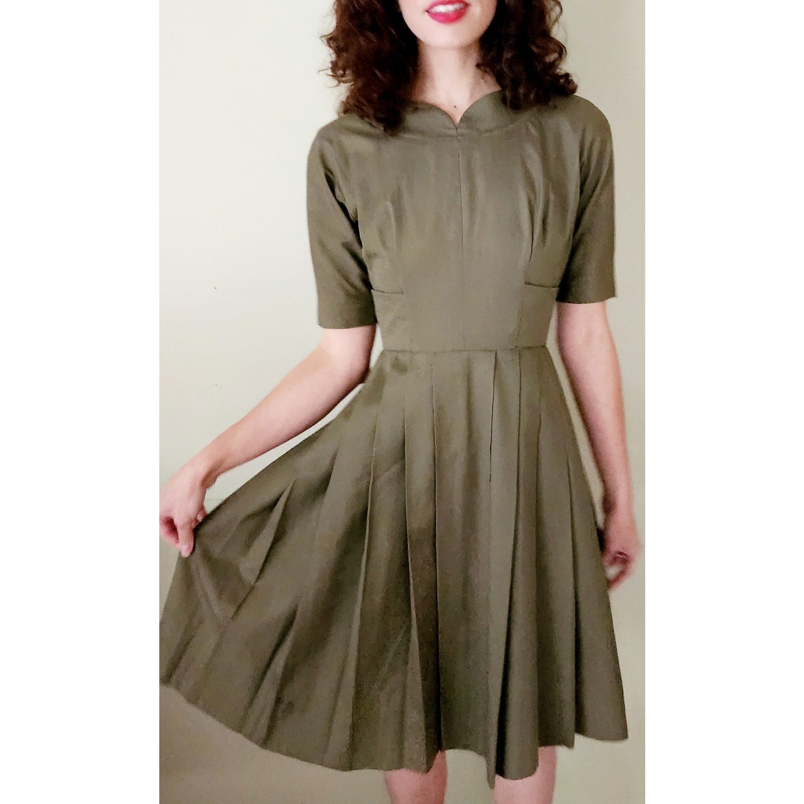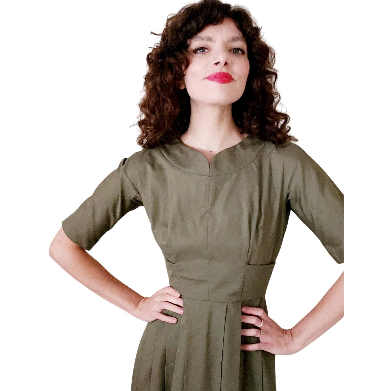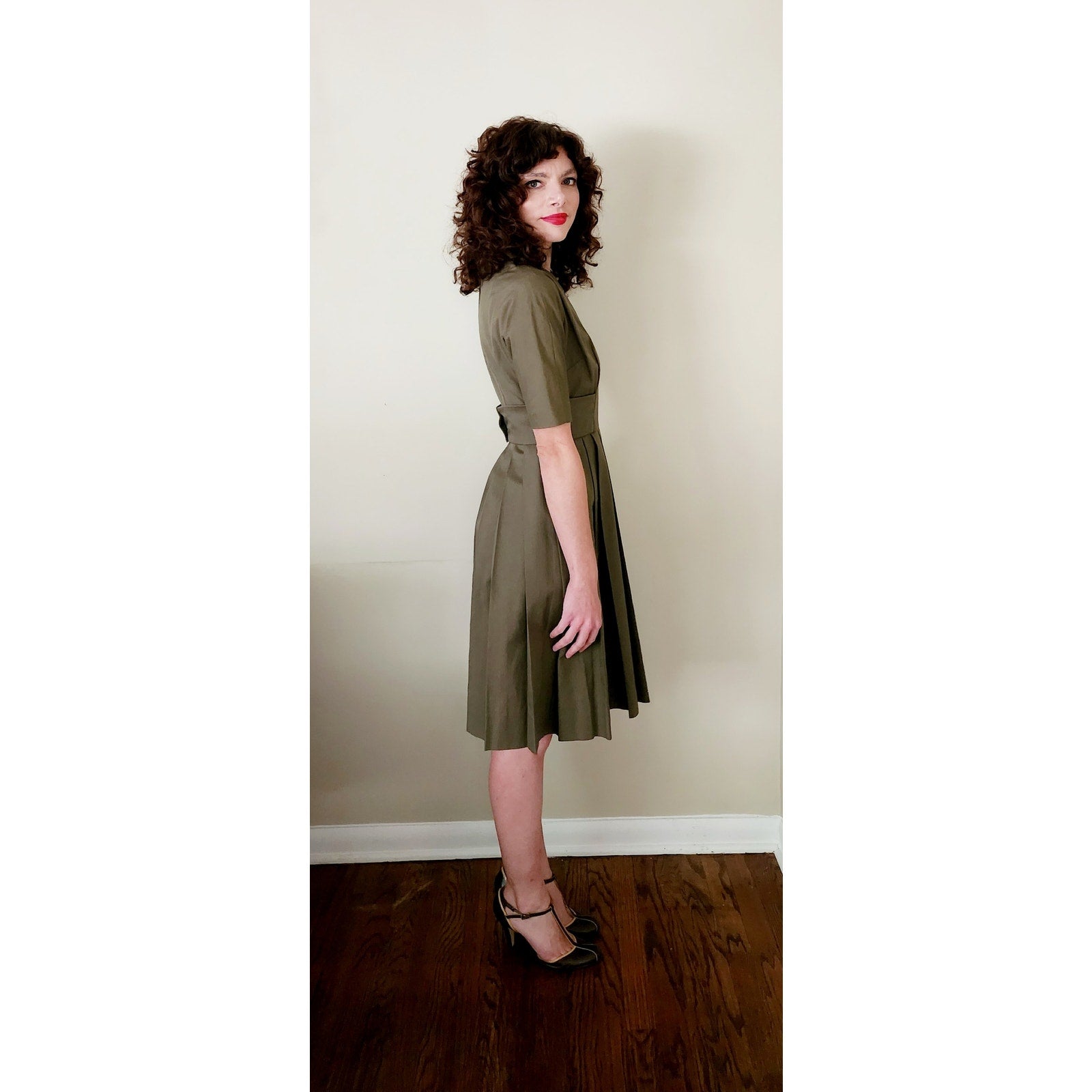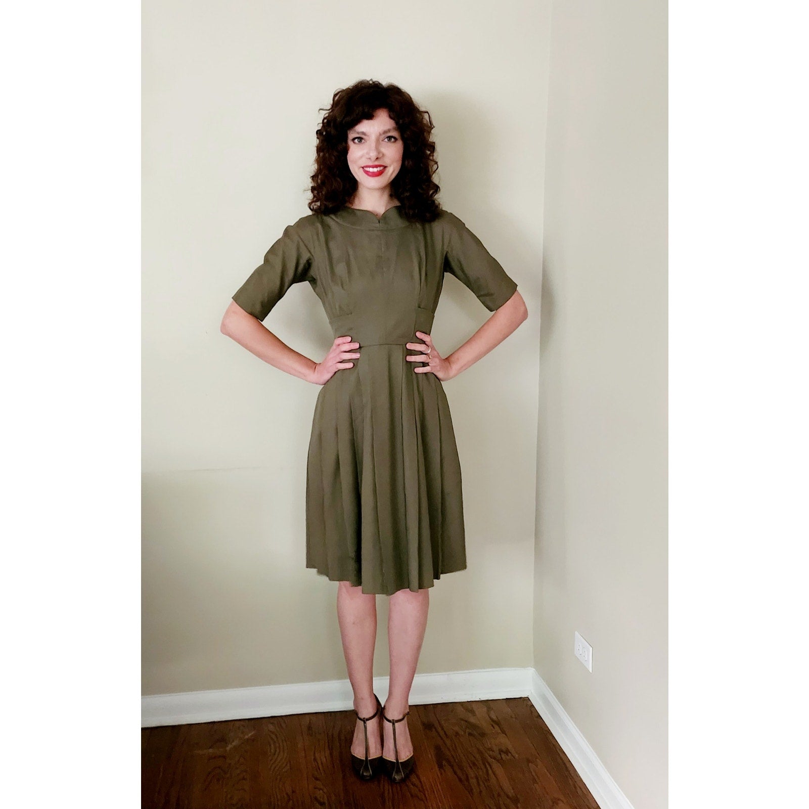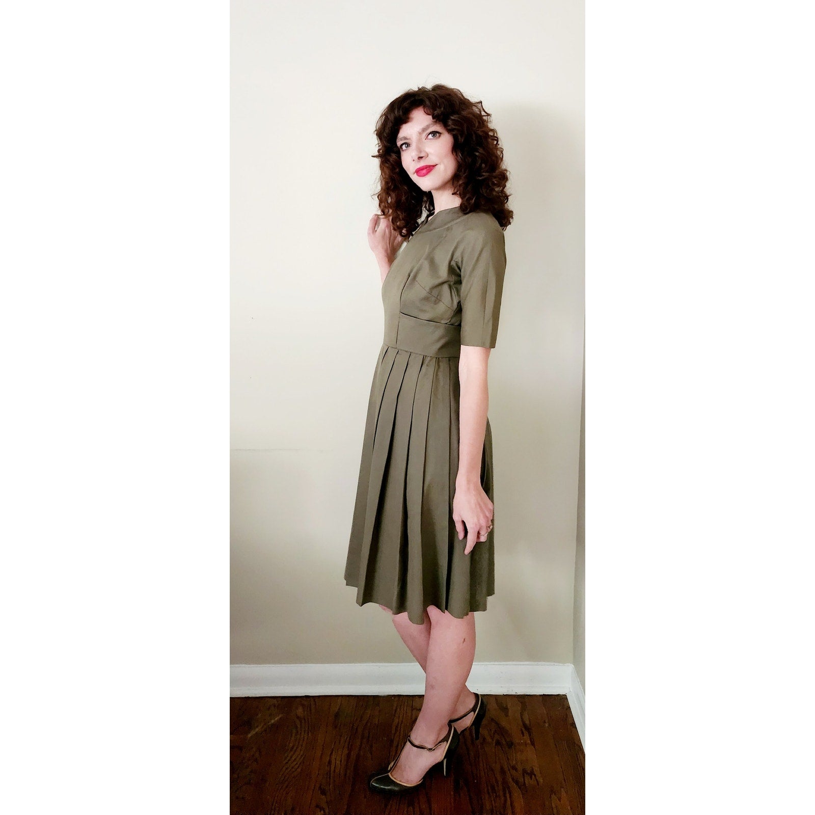 Vintage 50s Jacques Heim Couture Dress Olive Green Wool / Small