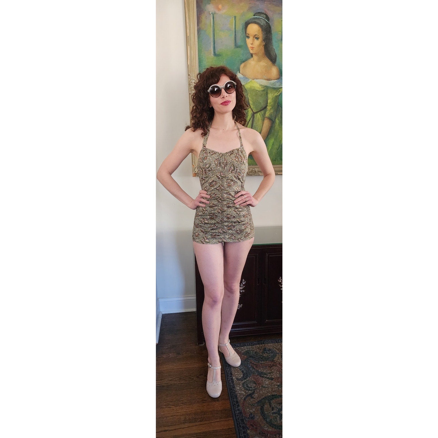 Classic one piece bathing suit with halter top neck tie, a ruched front bodice, covering boy cut style undies, as typical of the decade. The entire back area is smocked so gives you lots of stretch and adjustability with the top featuring an elastic. Delightful print in olive green, red and cream features a dizzying combo of paisley and geometric shapes. Lined bodice and crotch area.