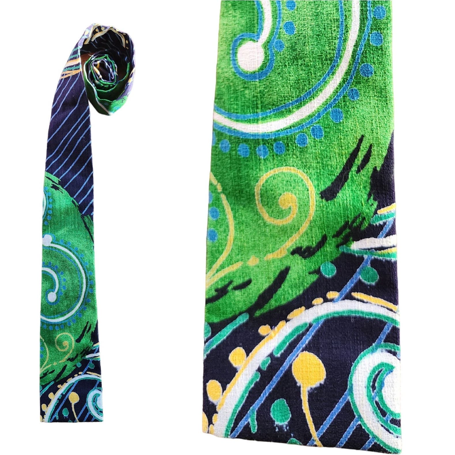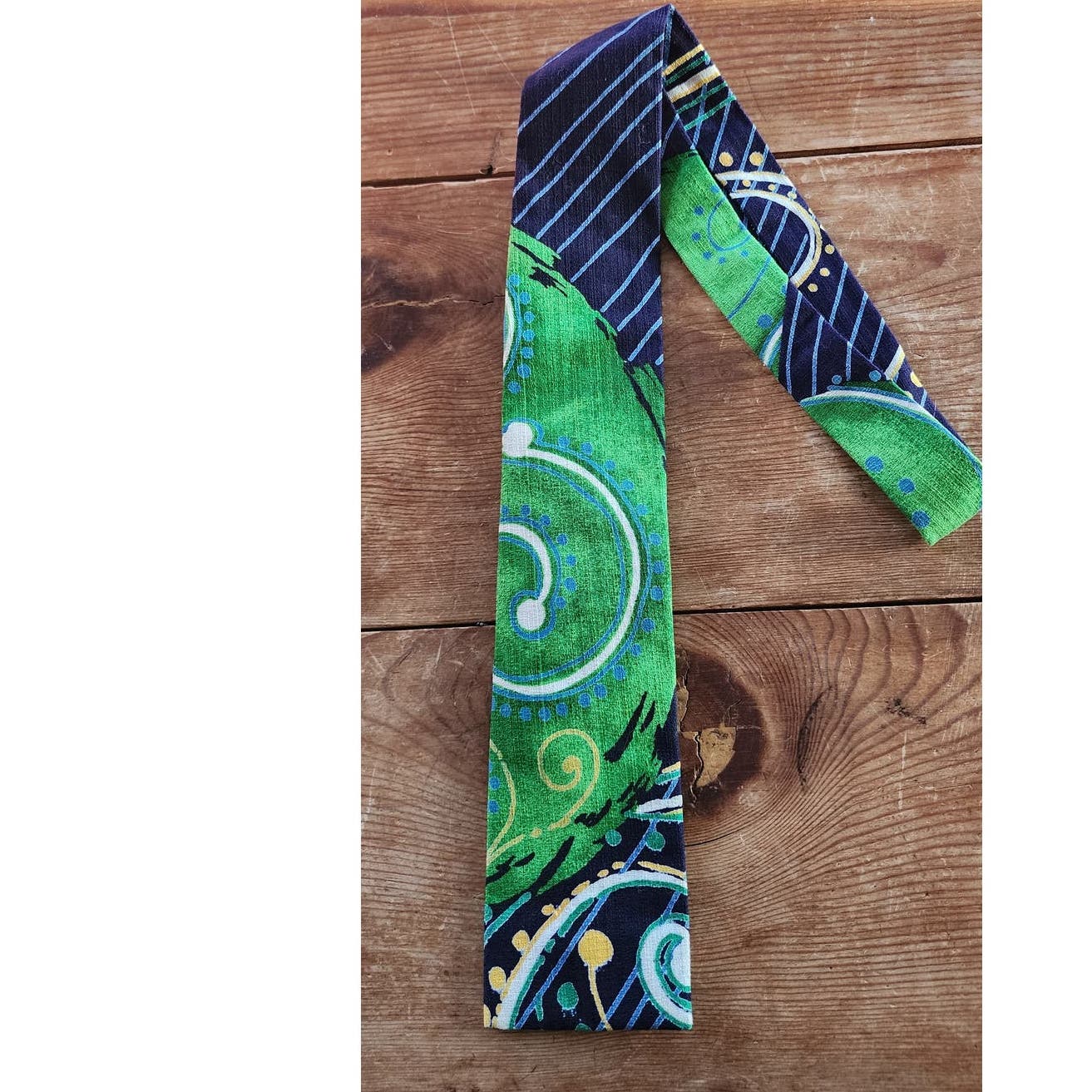 Blunt end, square edged tie from the 50s in a groovy abstract print with a tiki vibe! Tones are green, light and dark blue, yellow and white.