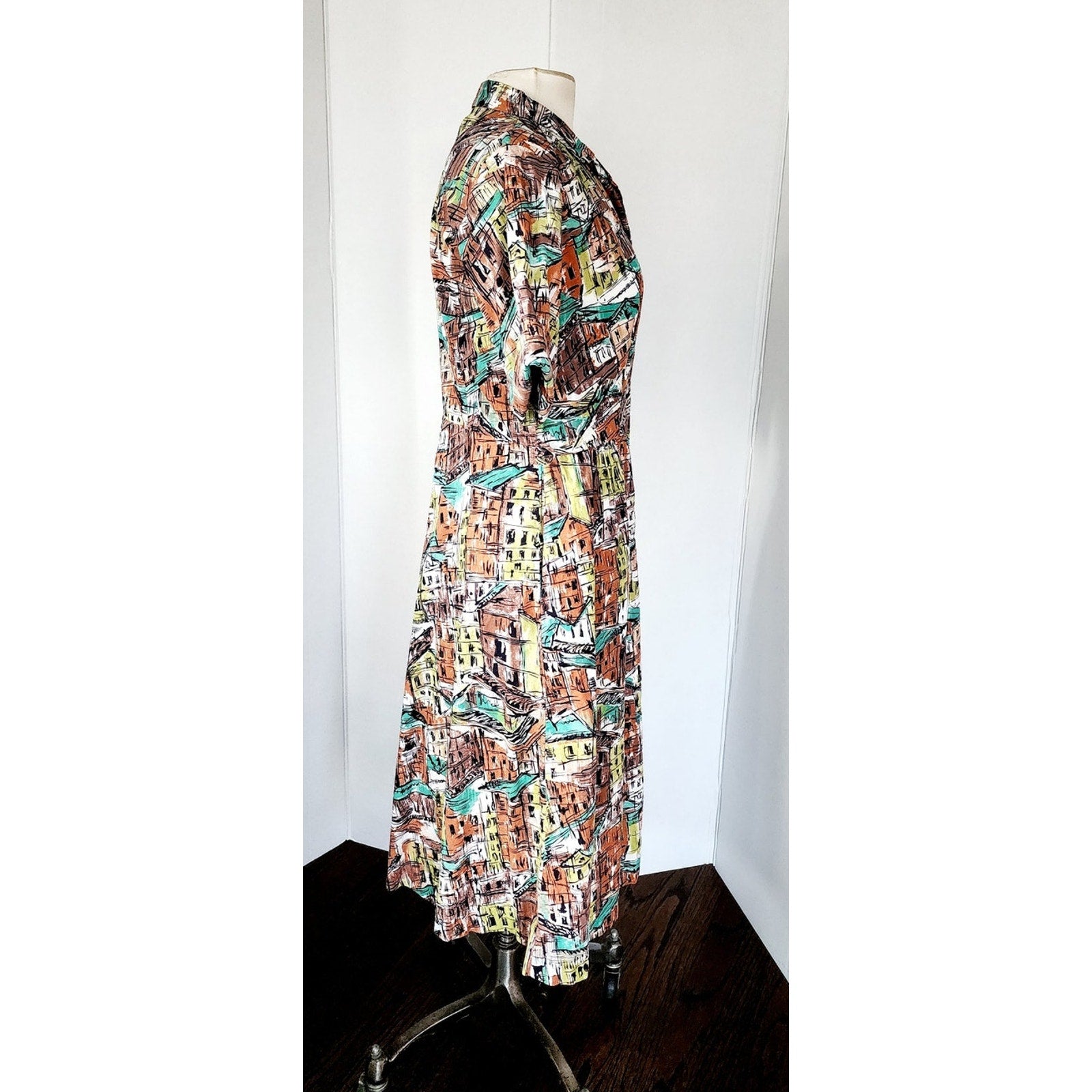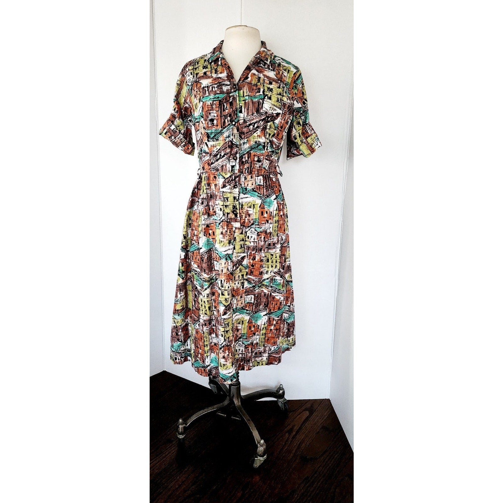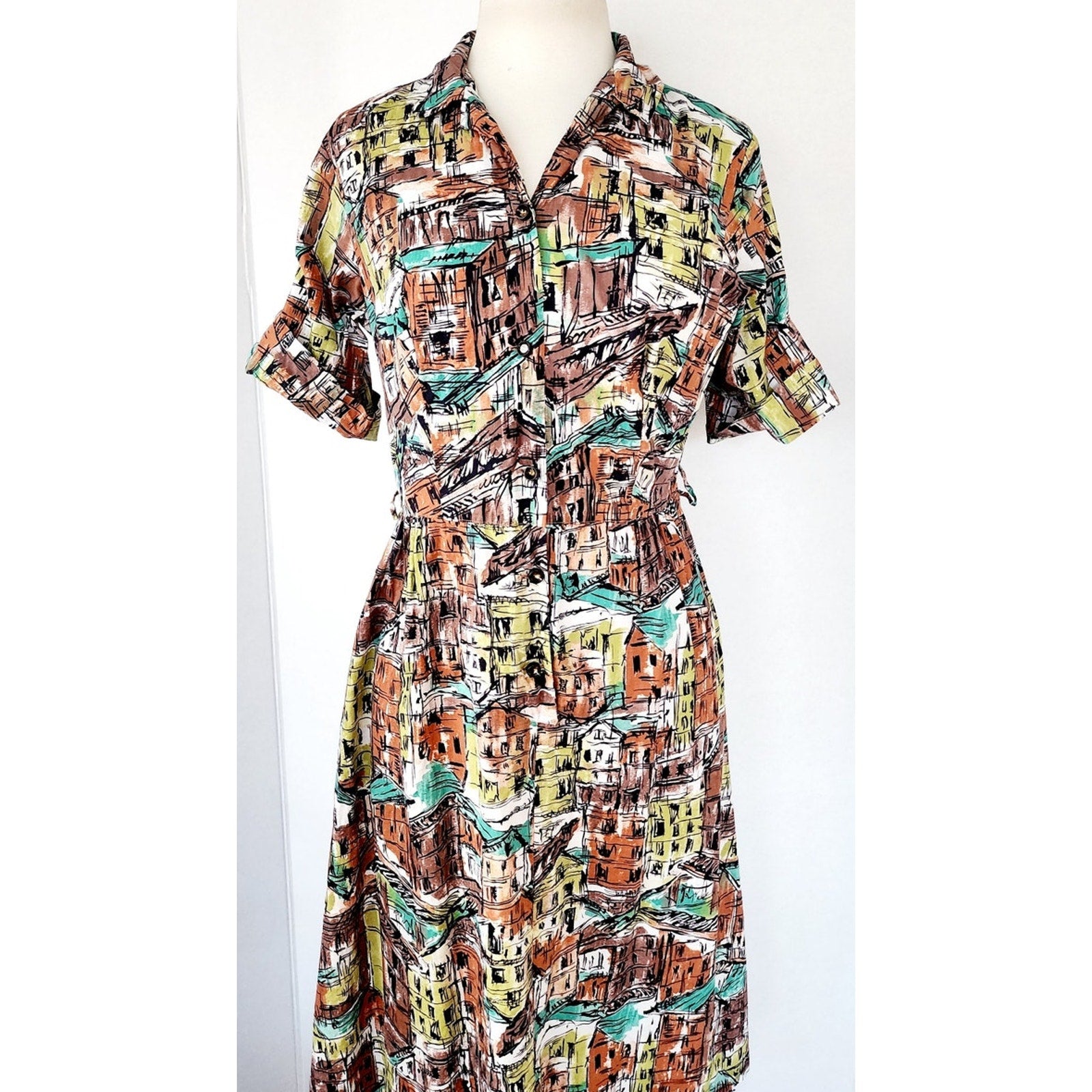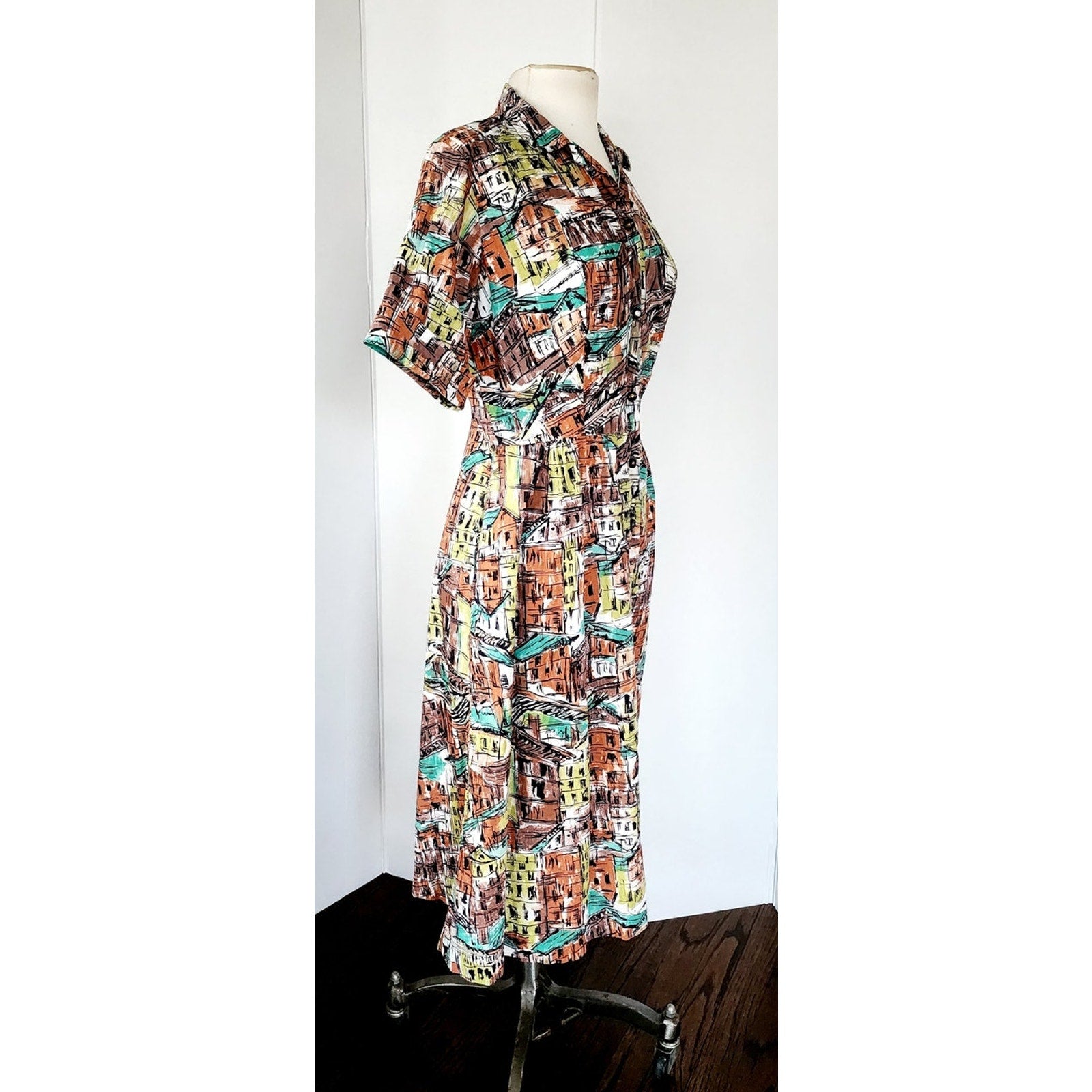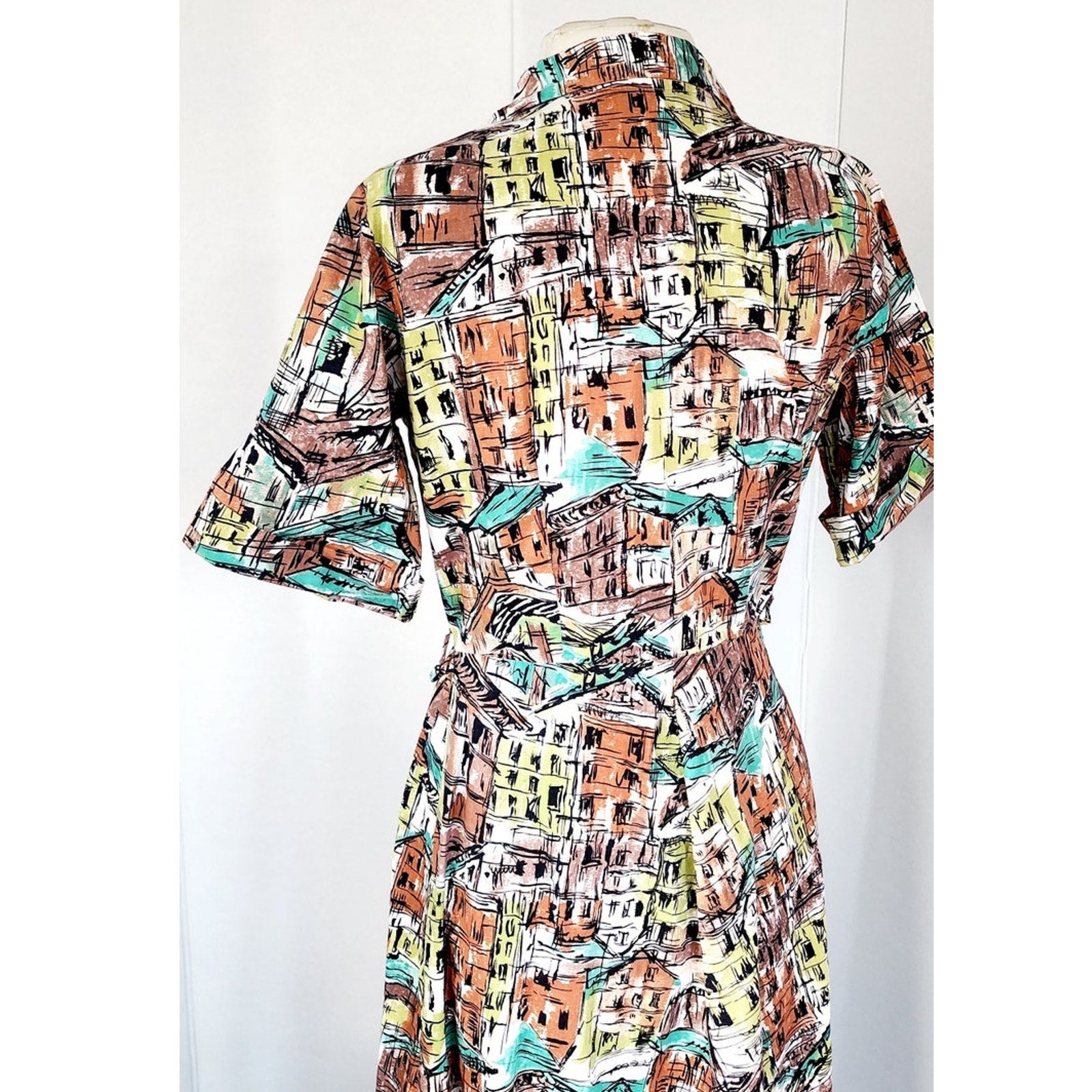 Classic shirtdress with cuffed half-sleeves, a fold down collar, nipped waist, and an A line midi length skirt. This one is all about the graphic print - a stylized street scene of houses and buildings in tones of brown, green, and white! Very midcentury modern! Buttons are black with rhinestone centers! Unlined. Belt loops ready for a belt of your choice. There is a slit pocket at the right hip front.