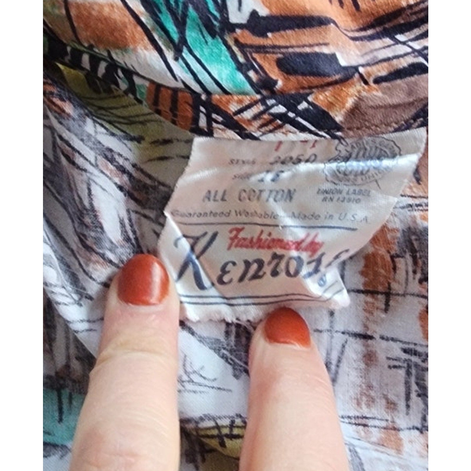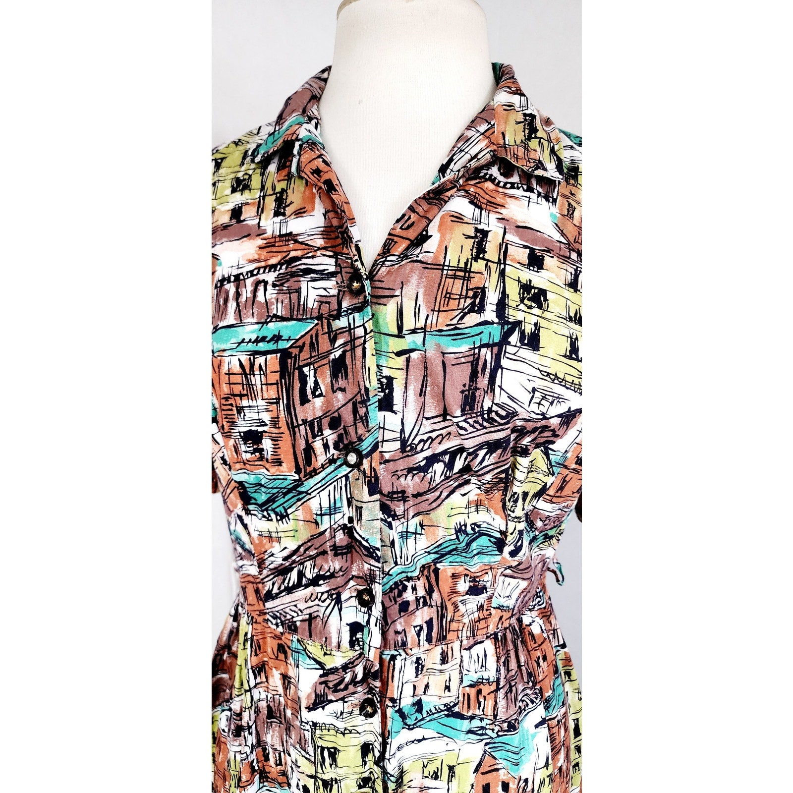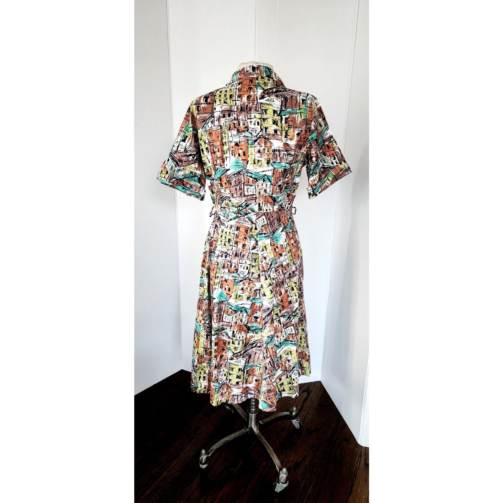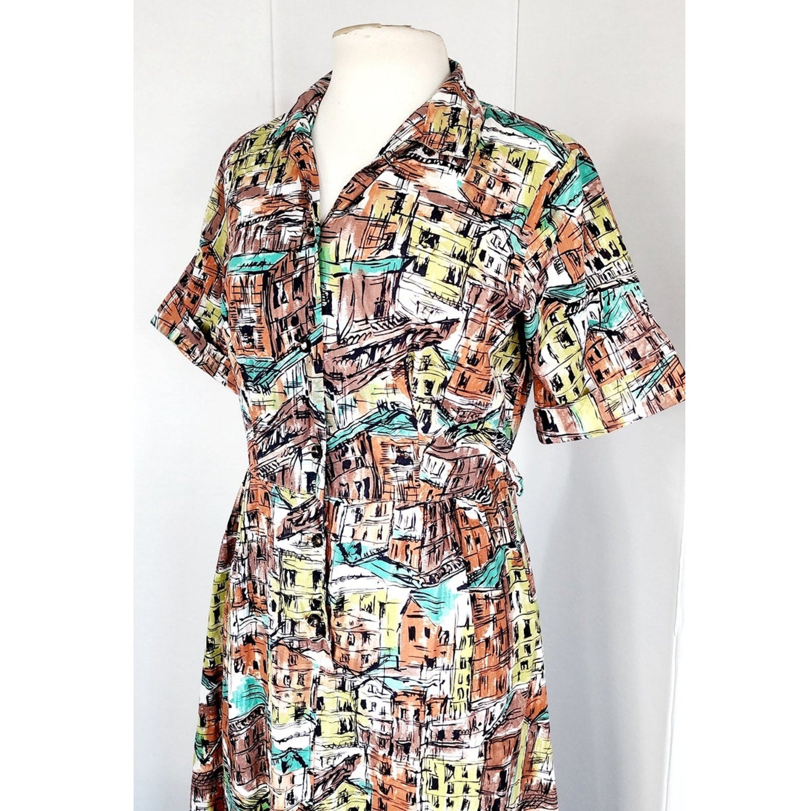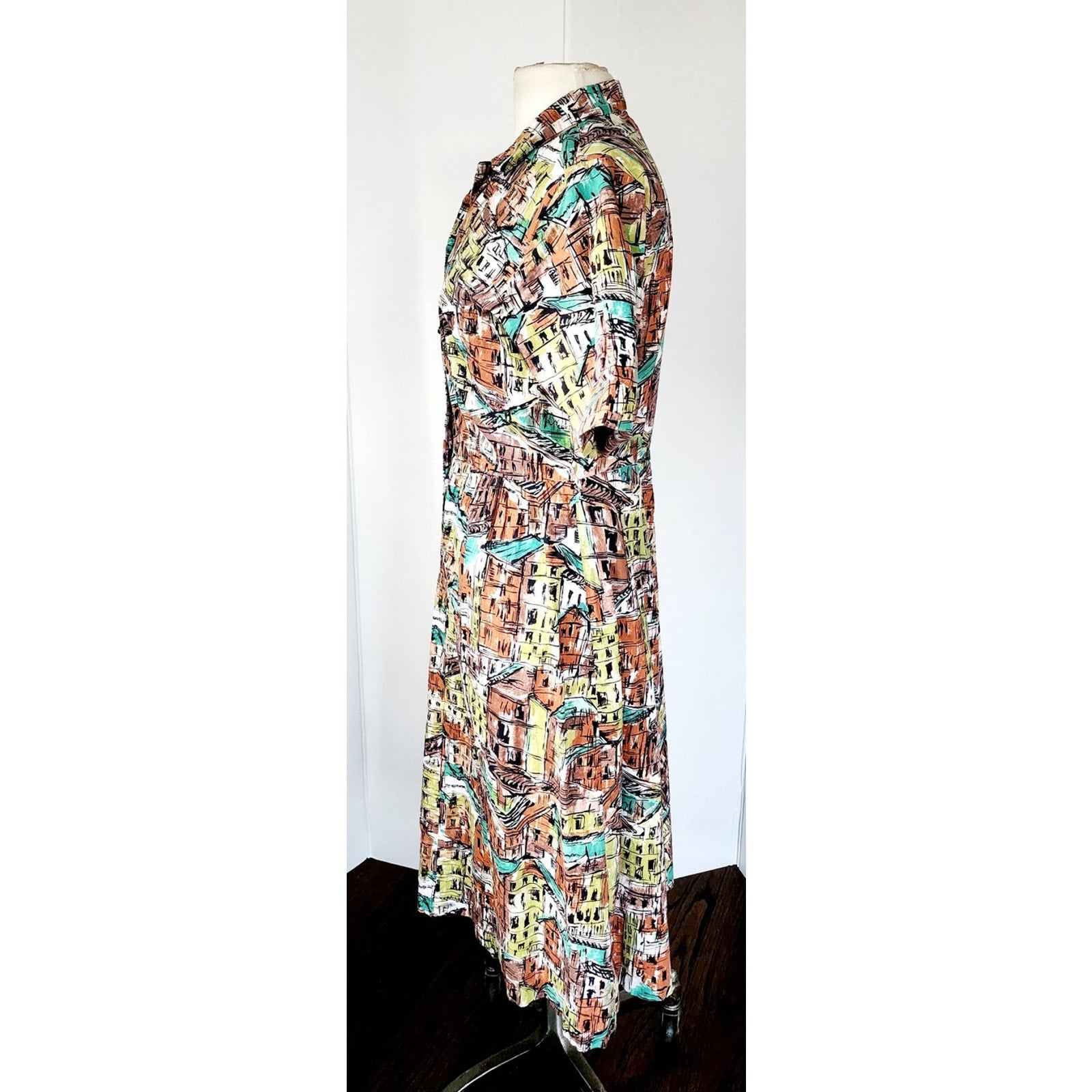Classic shirtdress with cuffed half-sleeves, a fold down collar, nipped waist, and an A line midi length skirt. This one is all about the graphic print - a stylized street scene of houses and buildings in tones of brown, green, and white! Very midcentury modern! Buttons are black with rhinestone centers! Unlined. Belt loops ready for a belt of your choice. There is a slit pocket at the right hip front.