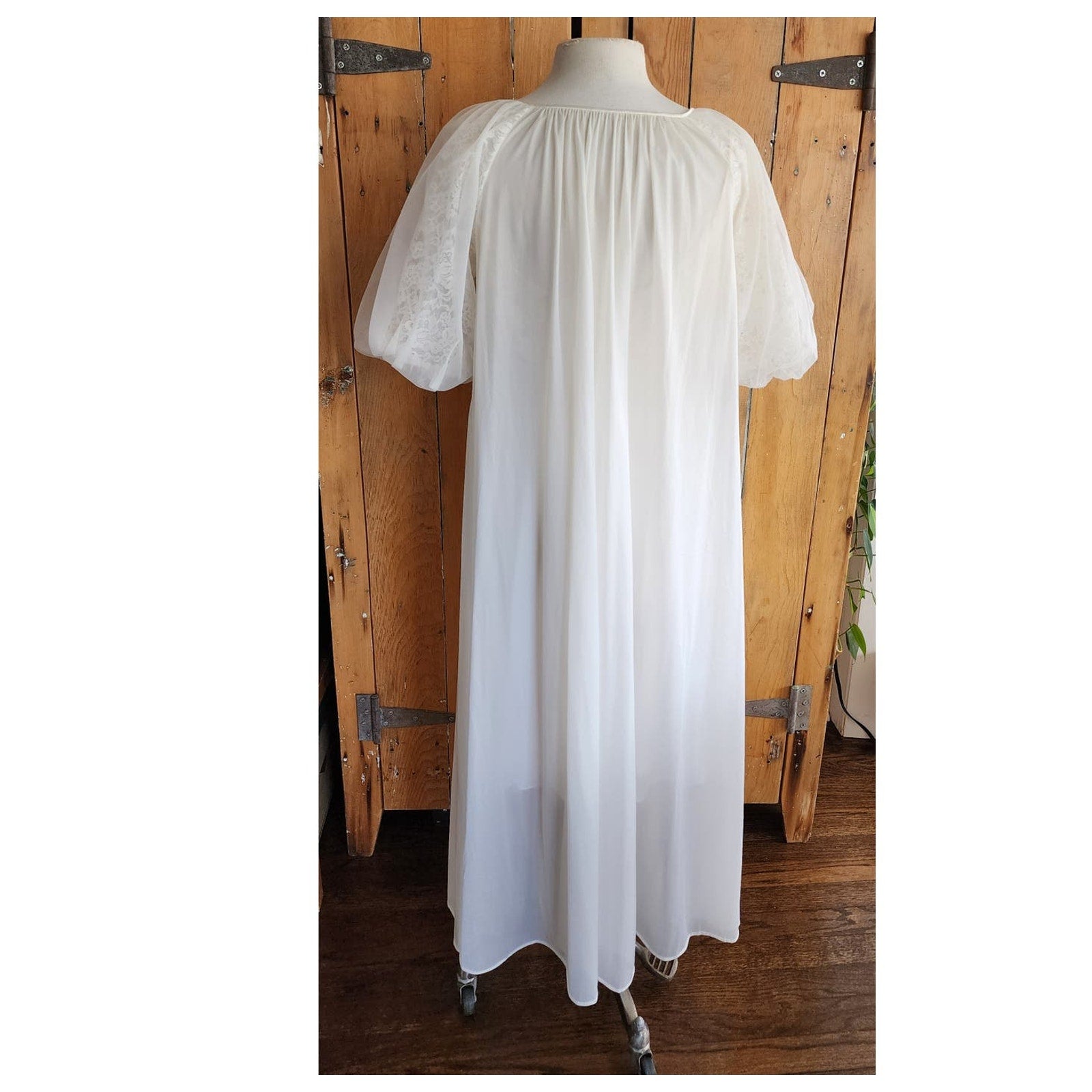A lovely two piece lingerie set in double knit, white nylon. The robe is collarless, with puffed half sleeves in white lace with a layer of sheer fabric over it. Swing style with an open front, it buttons at the top center of chest. The slip dress underneath has spaghetti straps and an empire waist line. The chest is covered in white lace and there is a satin sash tie bow at center, with a keyhole right above.