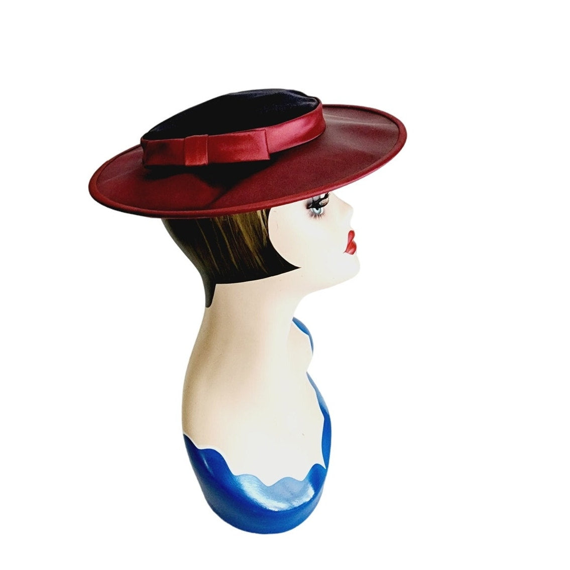 Wide brimmed and flat crowned, this beauty is cut out of burgundy red satin and dark blue velvet. Note the little bow at right side in matching red satin. Stays on head with little side prongs. Just tilt it the way you like and you're set in high style. Quite lightweight.