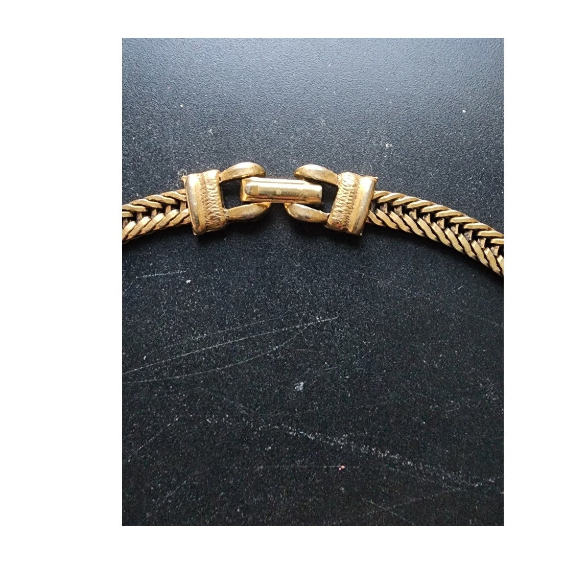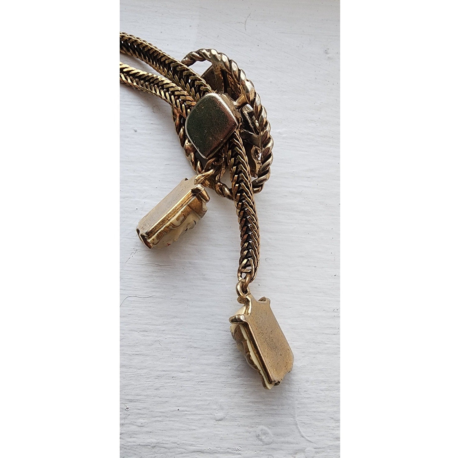 Exquisite necklace from the Orientalist fascination of the last mid-century, this is a bolo style with three pendants - meaning you can adjust the length and made it a choker as necessary. Thick, chunky necklace has a large central medallion and two smaller, matching ones hanging on each end of resin heads in ornate settings and faux pearl.