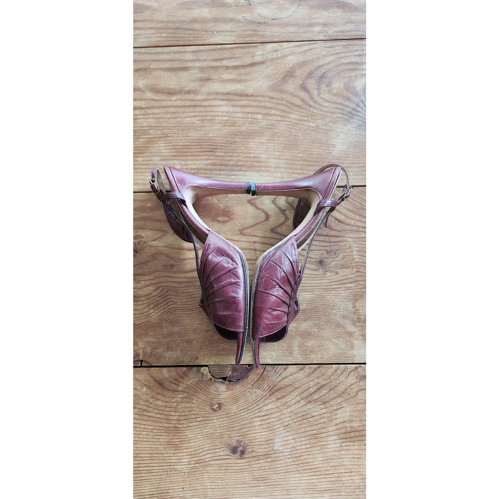 Sassy little pair of high heels with open toe and adjustable slingback strap, in oxblood red leather. Vamp features an elegant curved "overlap" panel with ribbing at the outer sides. Heel is in matching red. Gold hardware on the strap.