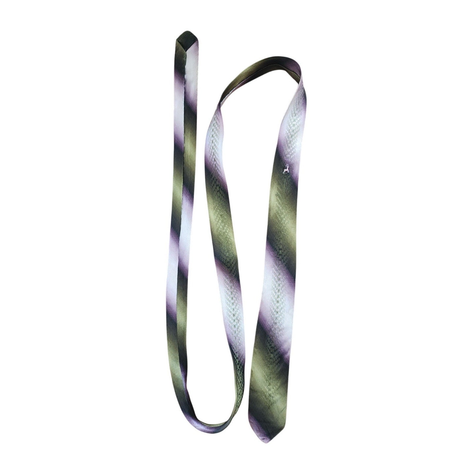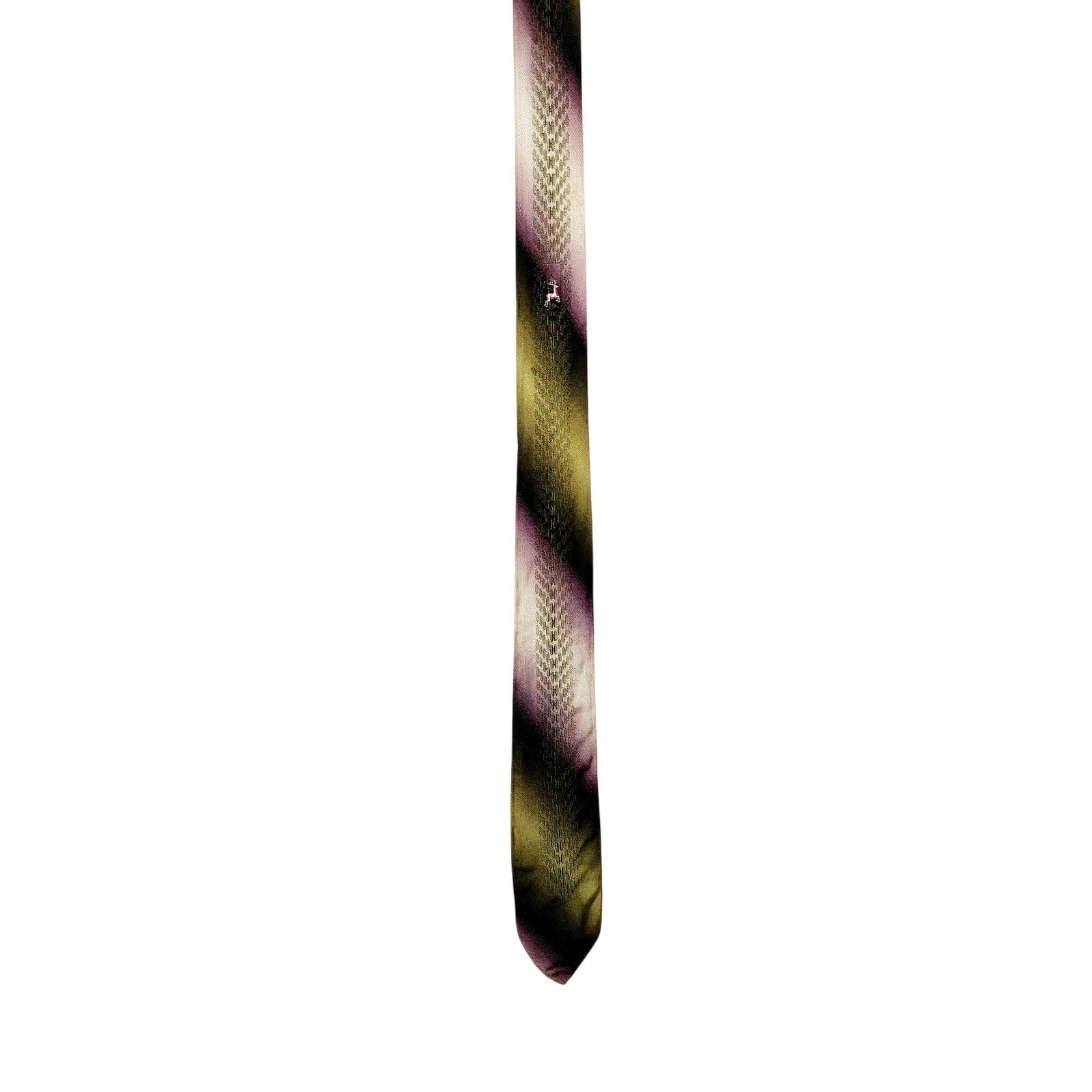 A subtle and sleek tie featuring diagonal stripes of ombre purple, gray, and green running across the length. Centeral front area has a small, embroidered figure of a white dear or running stag.