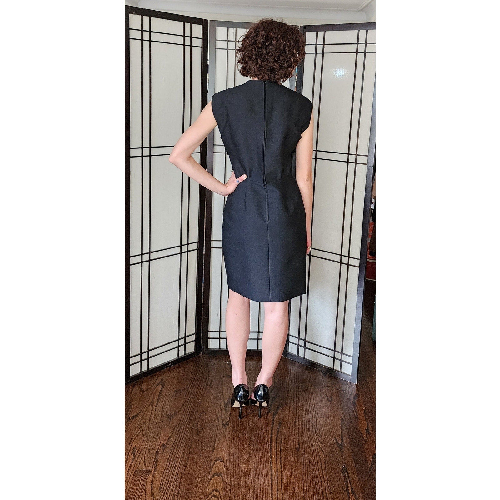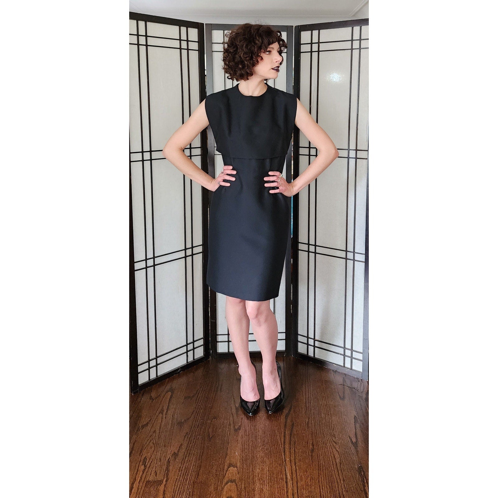 Impeccably tailored, black wool dress that is sleeveless and has a jewel neckline. The waist is nipped and the midi length skirt is cut on a curved A line, but what makes it stand out is the panel that overlaps the front torso, creating an interesting, sculpted look across. Closes with a zipper down the center of the back. Fully lined.