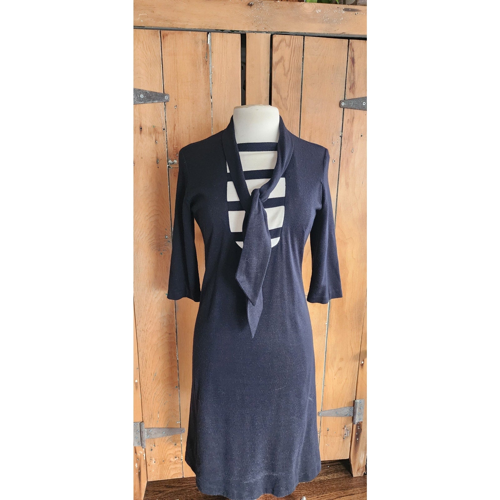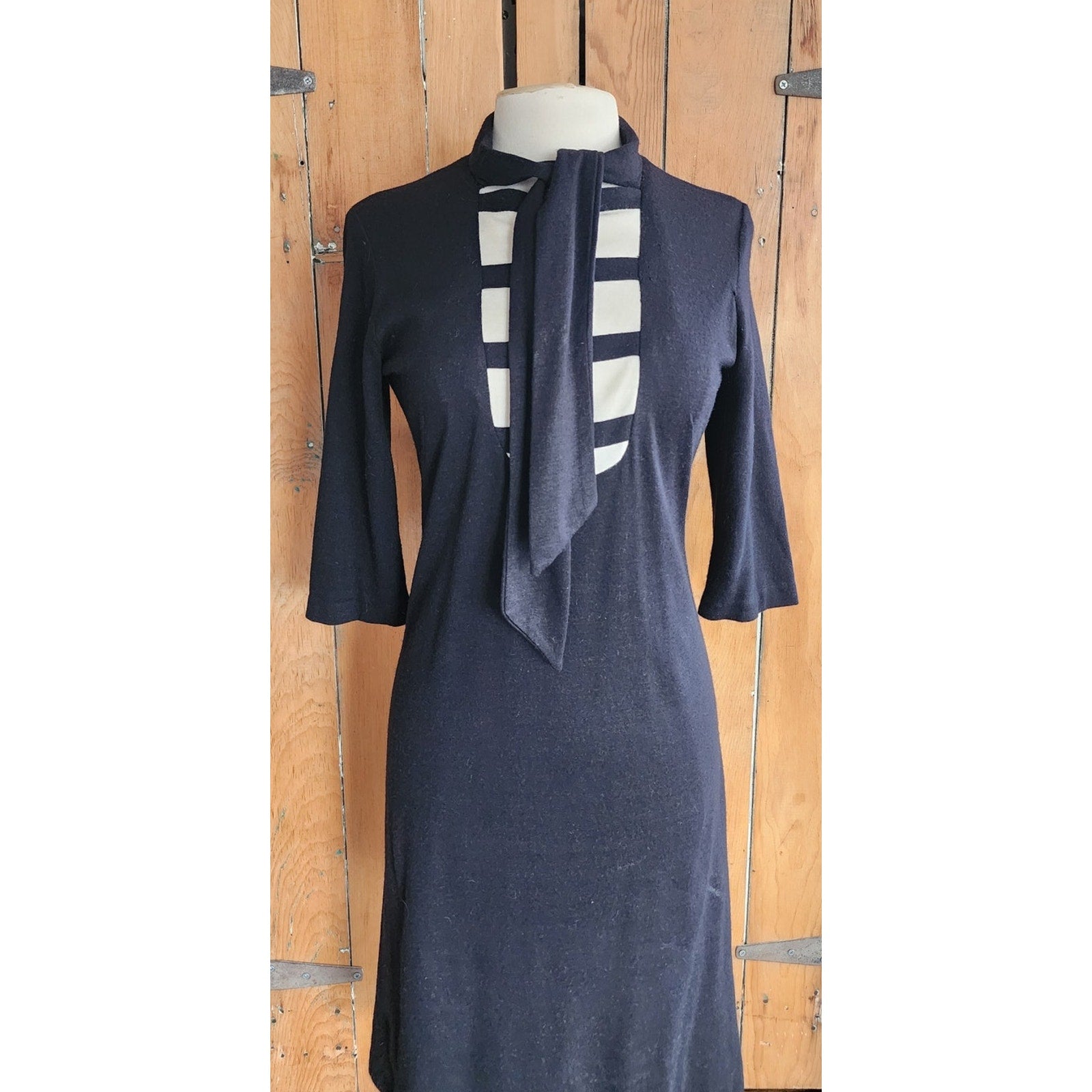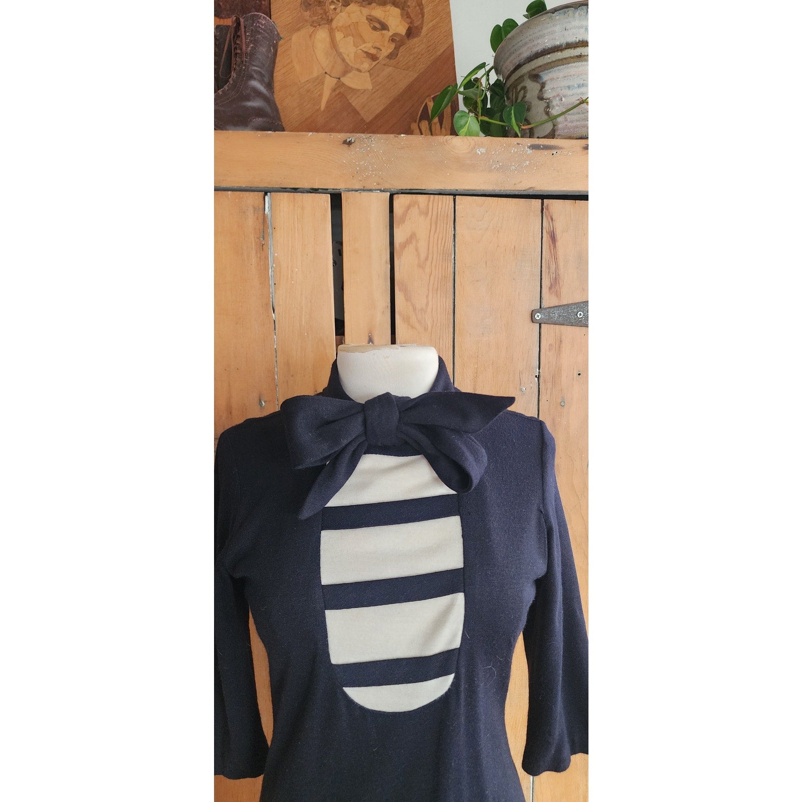 Cutie day dress in a black-poly knit fabric with stretch, it features fitted, three-quarters length sleeves and an attached, long, black sash ties at the neck that can be worn in various ways as shown. Center of chest is black and white stripe. Silhouette is fitted. Closes with a zipper down the back. Unlined. No tags.
