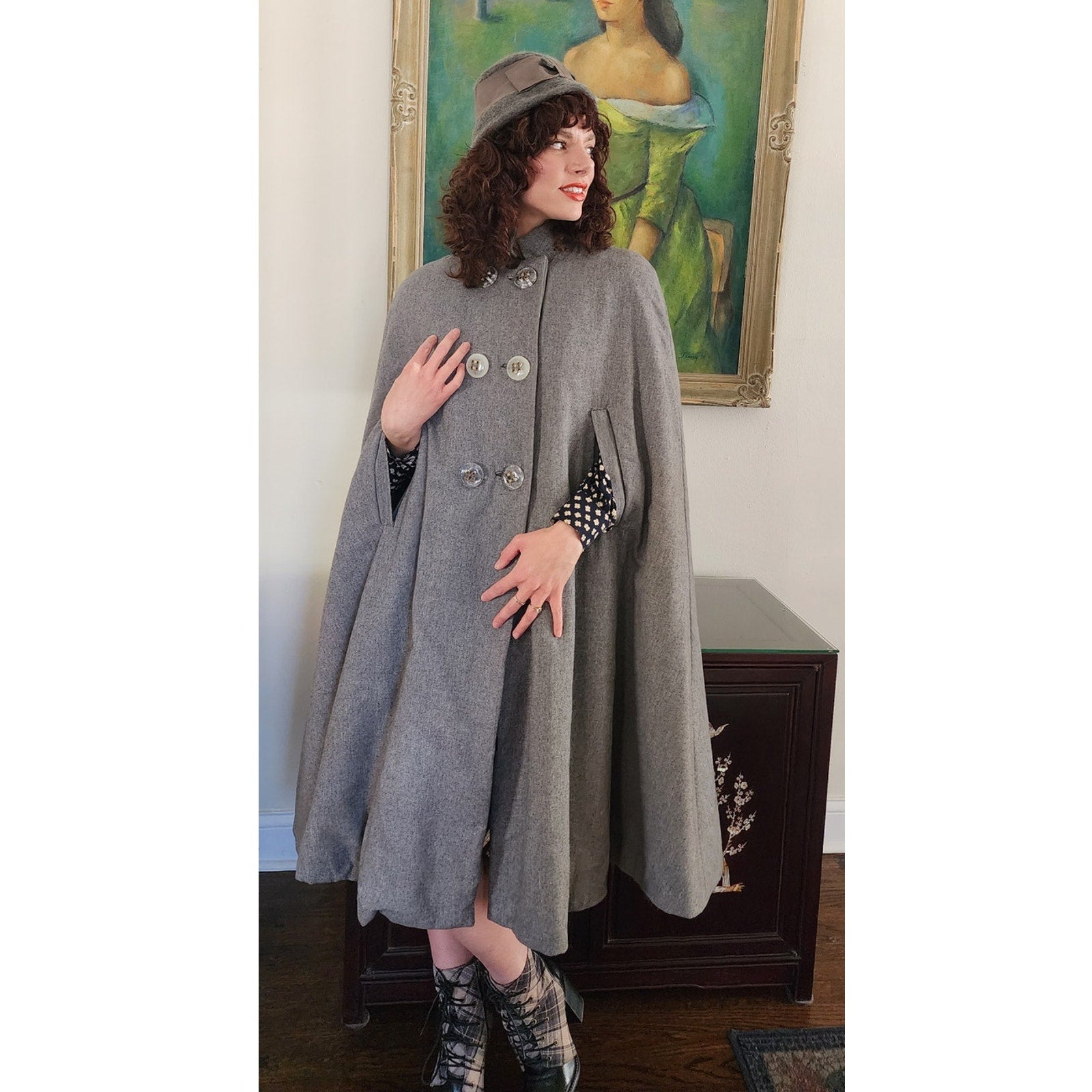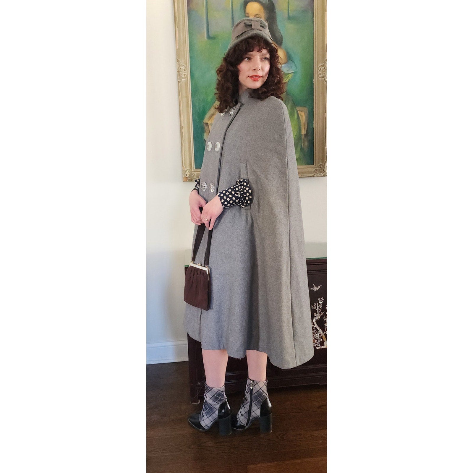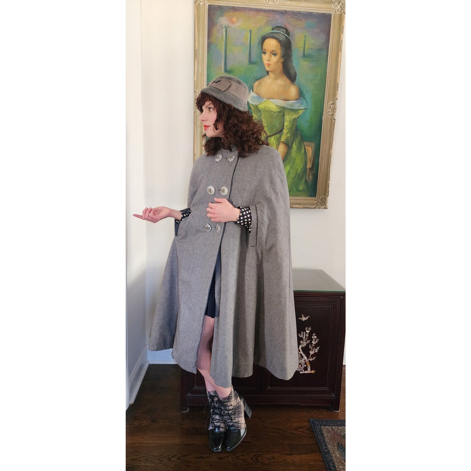 Vintage 60s Cape Coat Gray Wool Cloak w/Fuzzy Liner Mod Style / Med