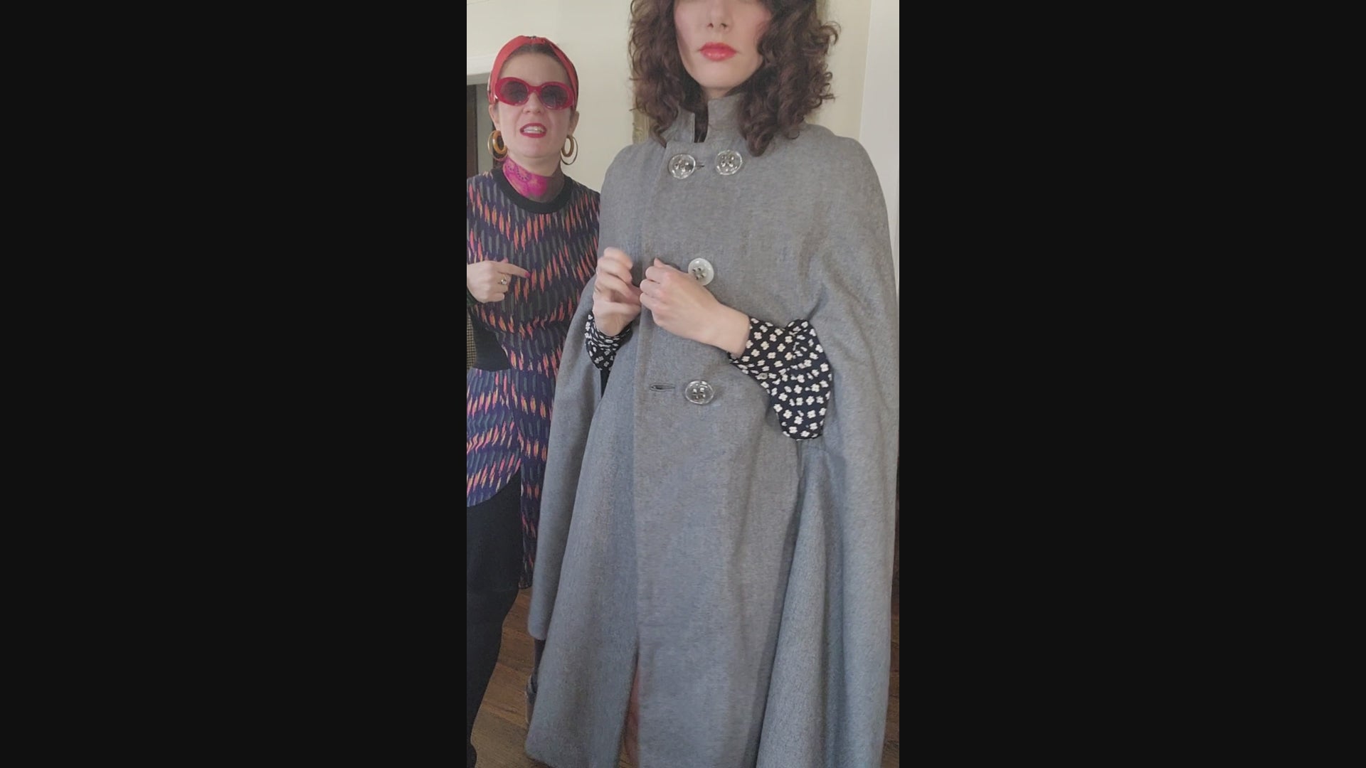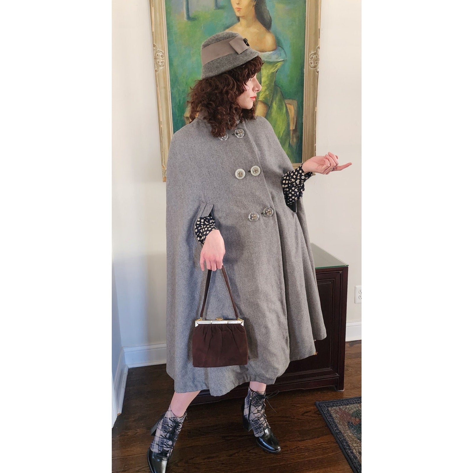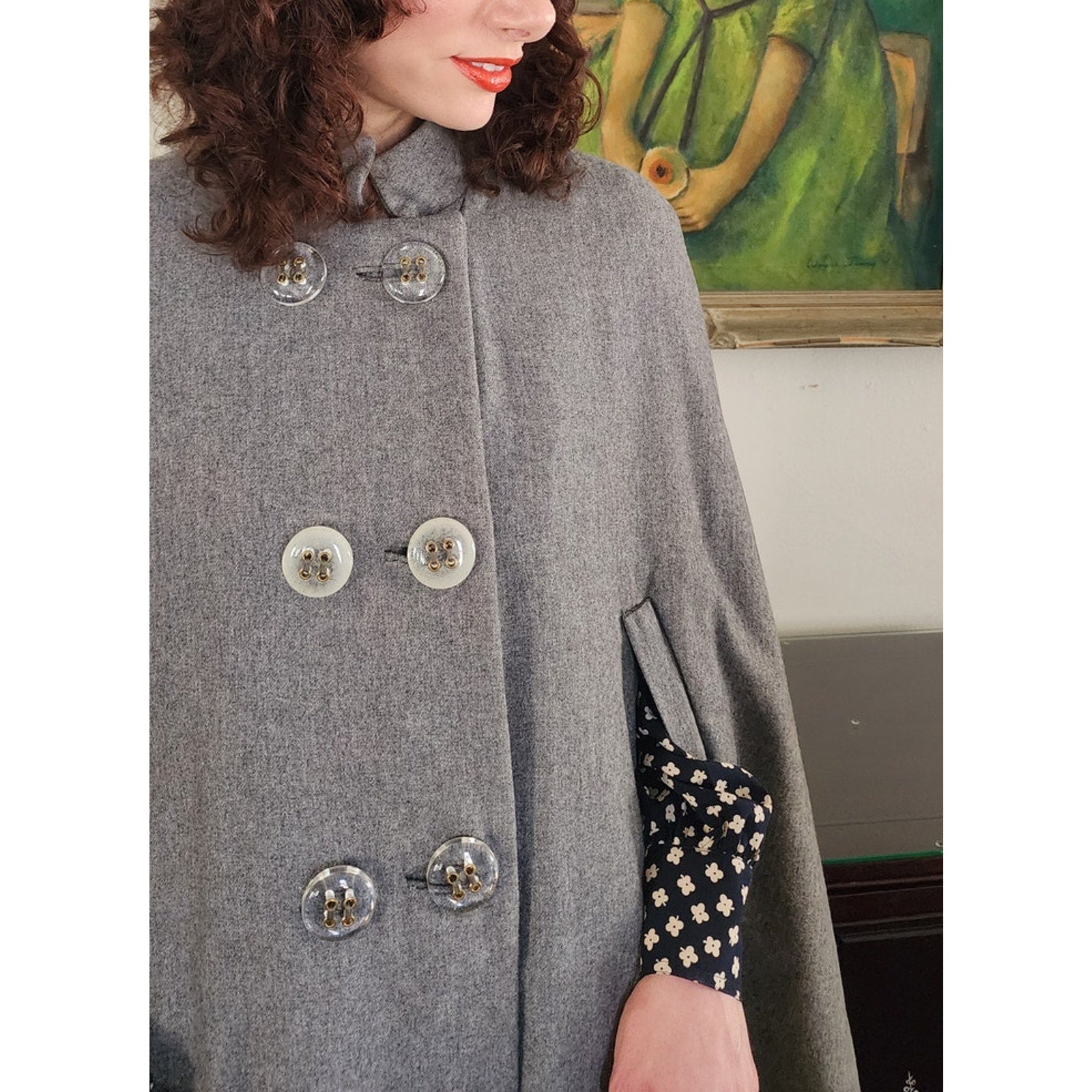 Gorgeous, winter cape in a thick, light gray wool, it has a small fold down collar and double breasted closure at the front in the form of large, round, lucite buttons - top and bottom rows are clear while the middle ones are "cloudy". Interior is lined gray, fuzzy textured, man made fabric with lots of plush and softness.