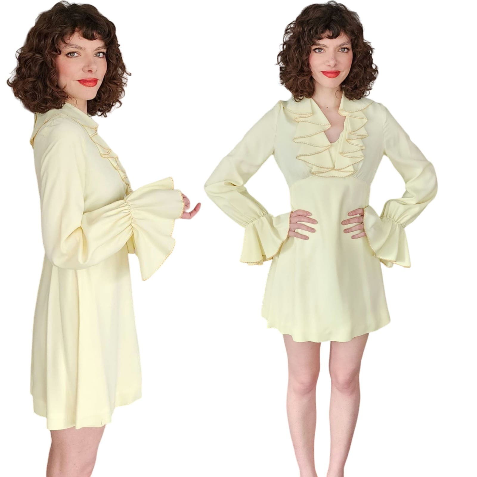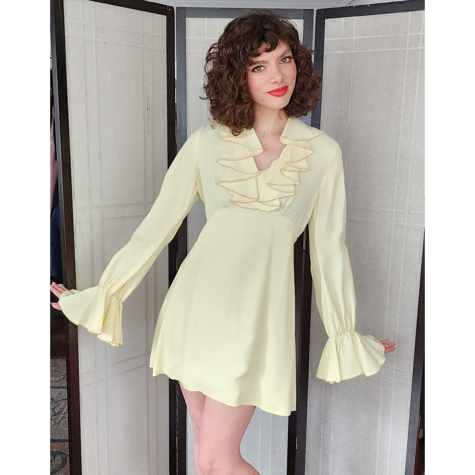 Sweet mini dress with a large ruffled collar and long sleeves with matching ruffled cuffs. It has an empire waist line and an A line skirt. Closes with a zipper at the back. Unlined. Great for dancing!