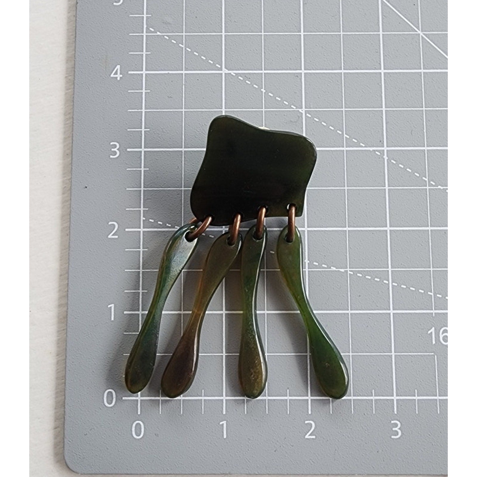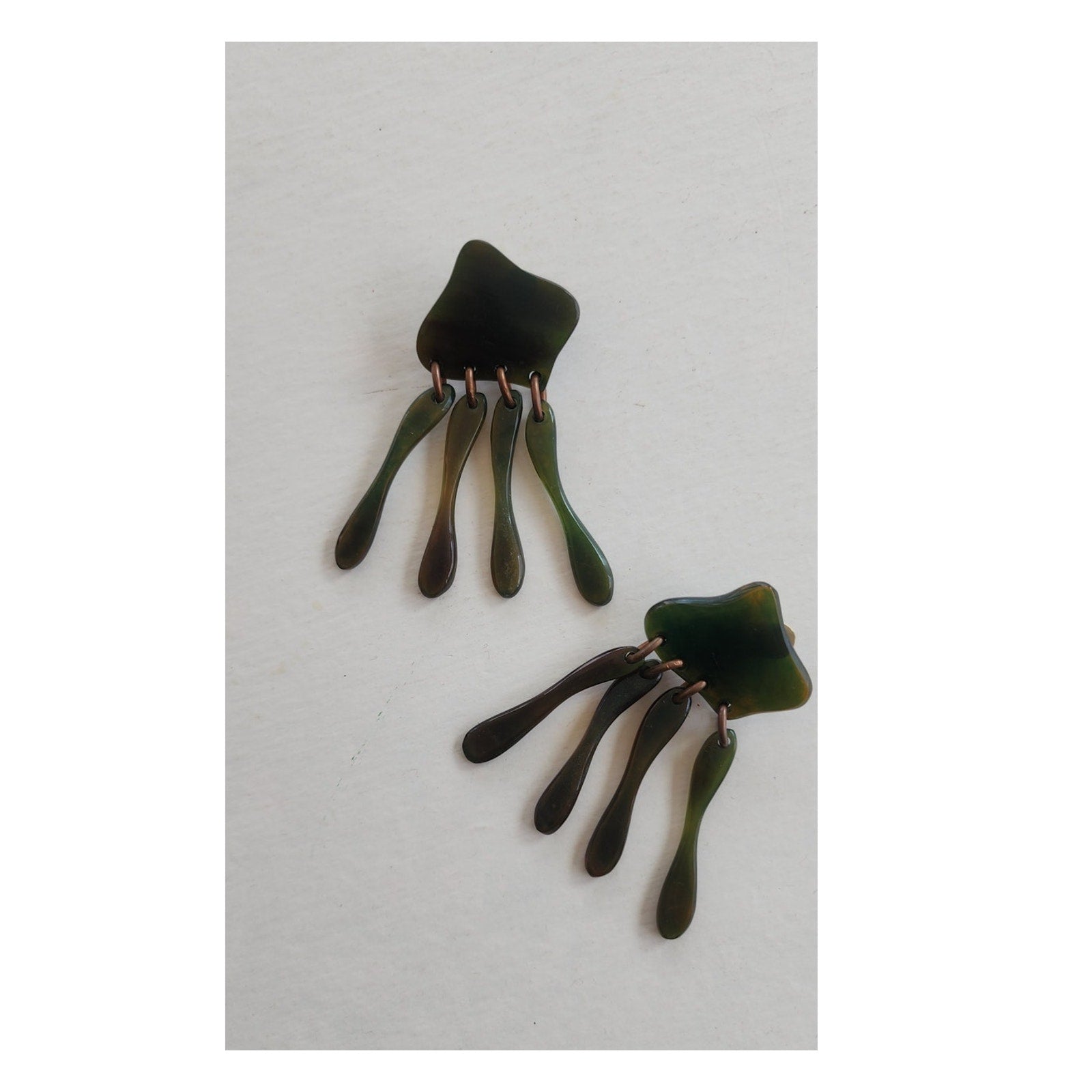 Major statement earrings in a light lucite in a dark, almost ombre green color! Bottoms have four, fringe like prongs that swing when you swing! Clip closure at rear. No stamps.