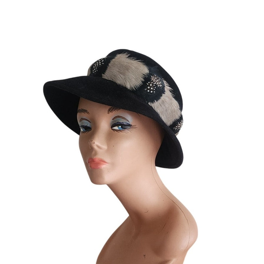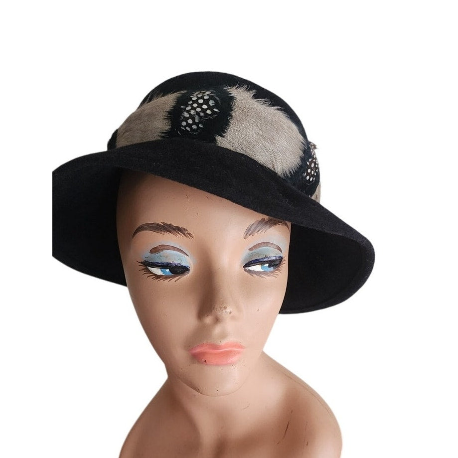 Soft bodied ladies hat with a wide brim and the crown encircled by a glorious array of feathers in black, gray, and black and white polkadots. Interior has petersham and the label.