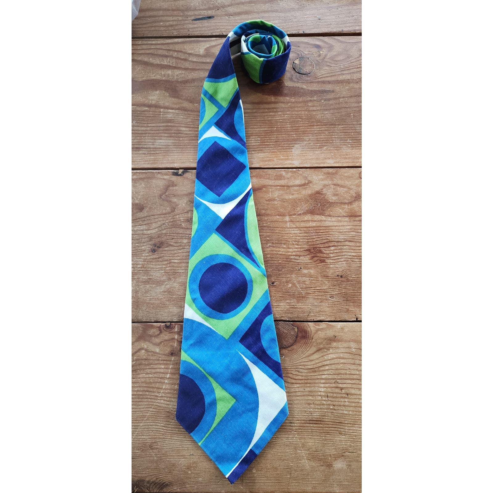 Bold and beautiful late60s tie with the signature wide width at the bottom. Geometric style pattern in color blocks shapes of blue, green, white and dark blue. No tags.