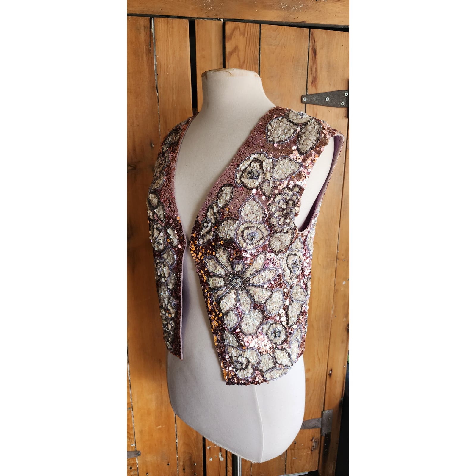 Eye catching, collarless fitted vest that closes with an interior hook at center chest, at the bottom of the v neckline. The entire exterior is sequined and beaded sil pink, silver, beige, and lavender tones of floral display. Fully lined at the interior.