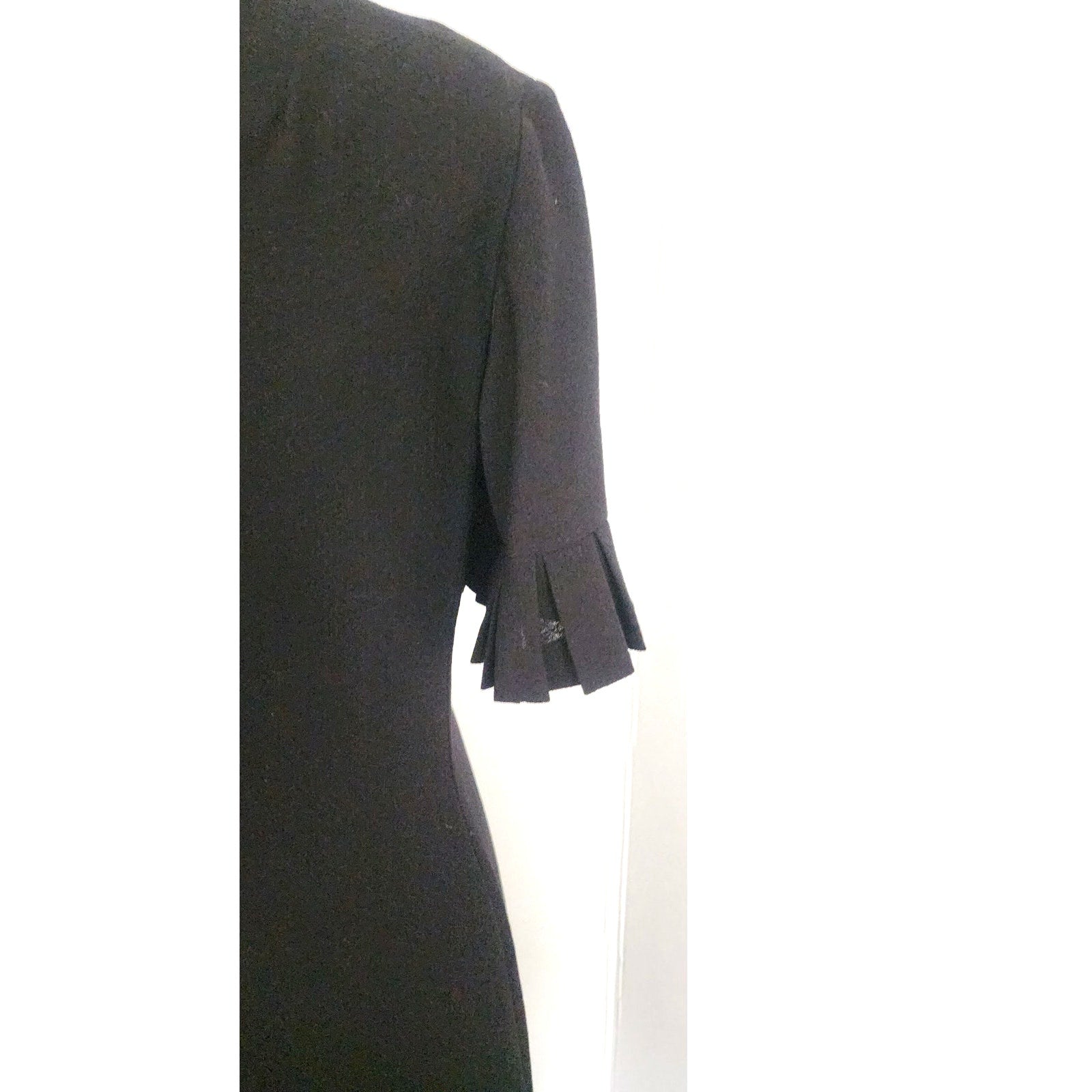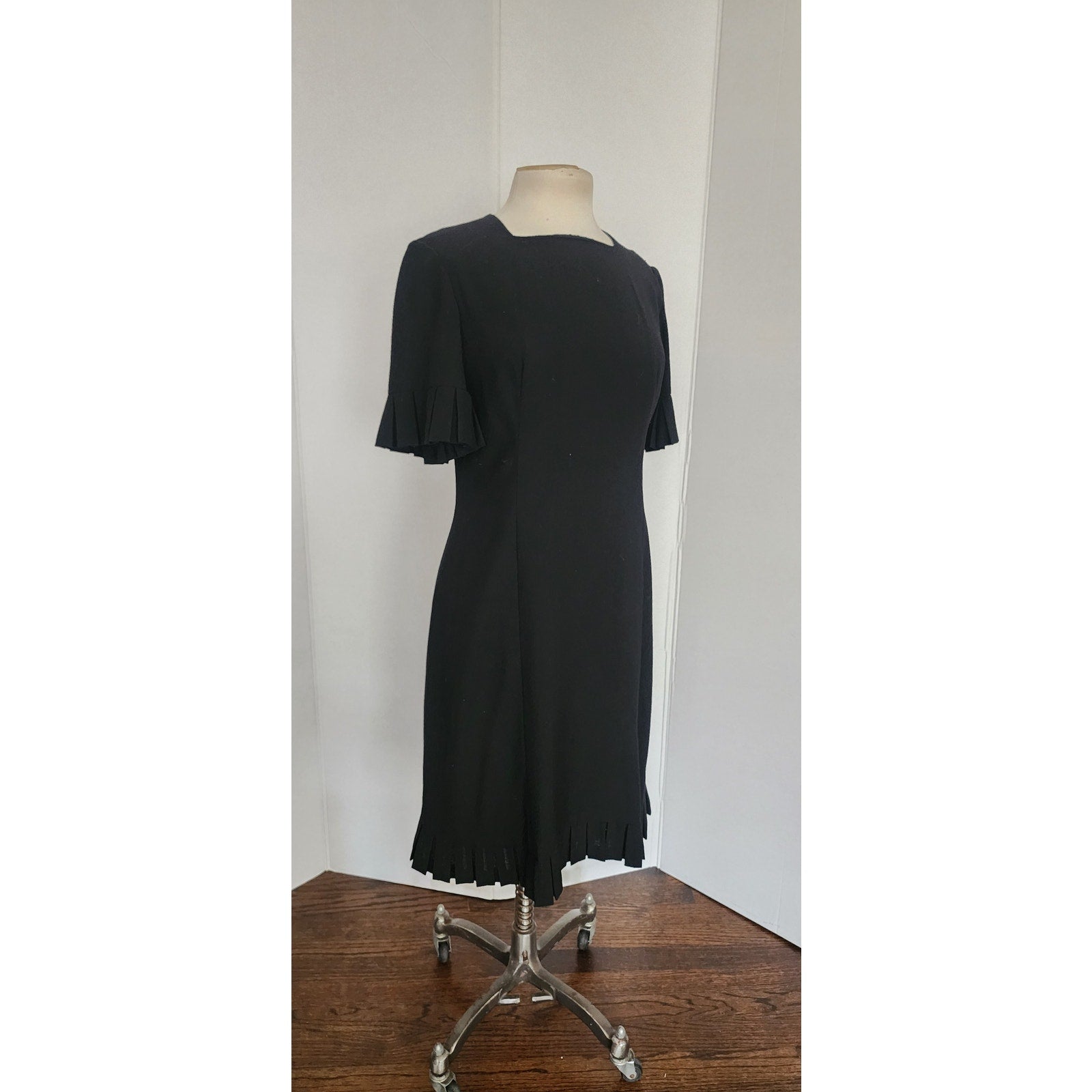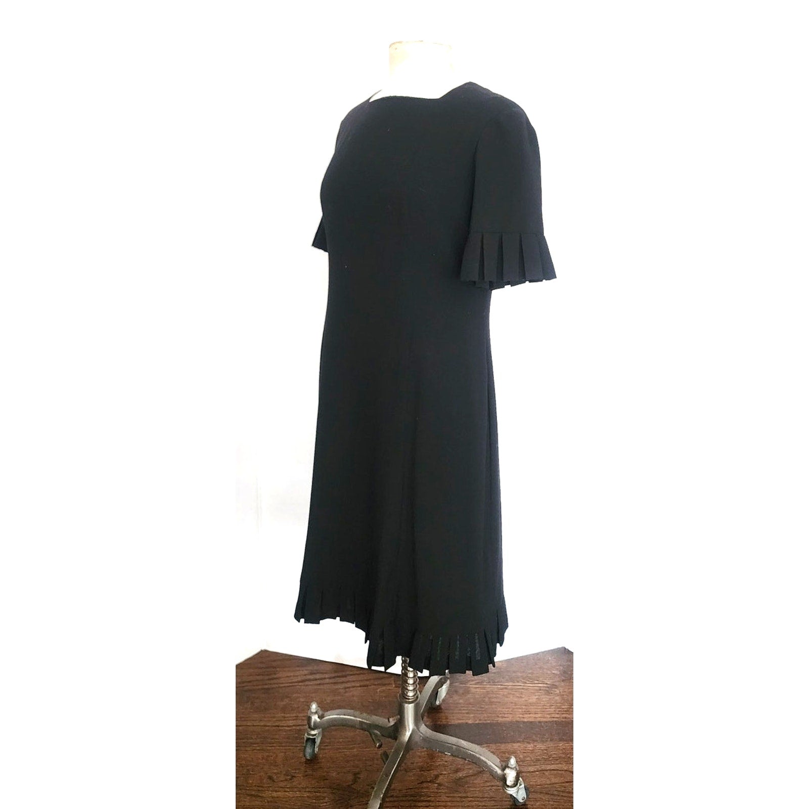 Classic little black dress from the chicest of midcentury Italian fashion houses! Collarless, with a high, square neckline, it has half sleeves with pleated fringe cuffs. The pleated panel is repeated around the mid-calf hemline. Silhouette is cut down across the torso, and princess seams create a flattering fit. Closes with a zipper at center rear. Fully lined.
