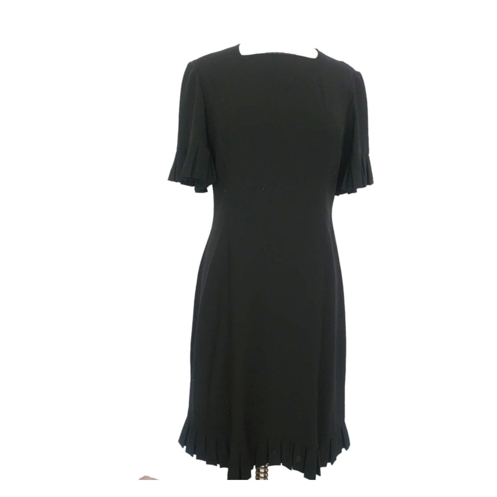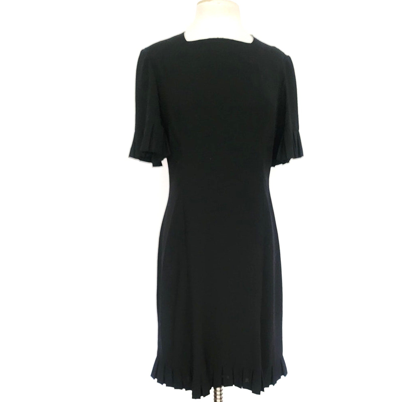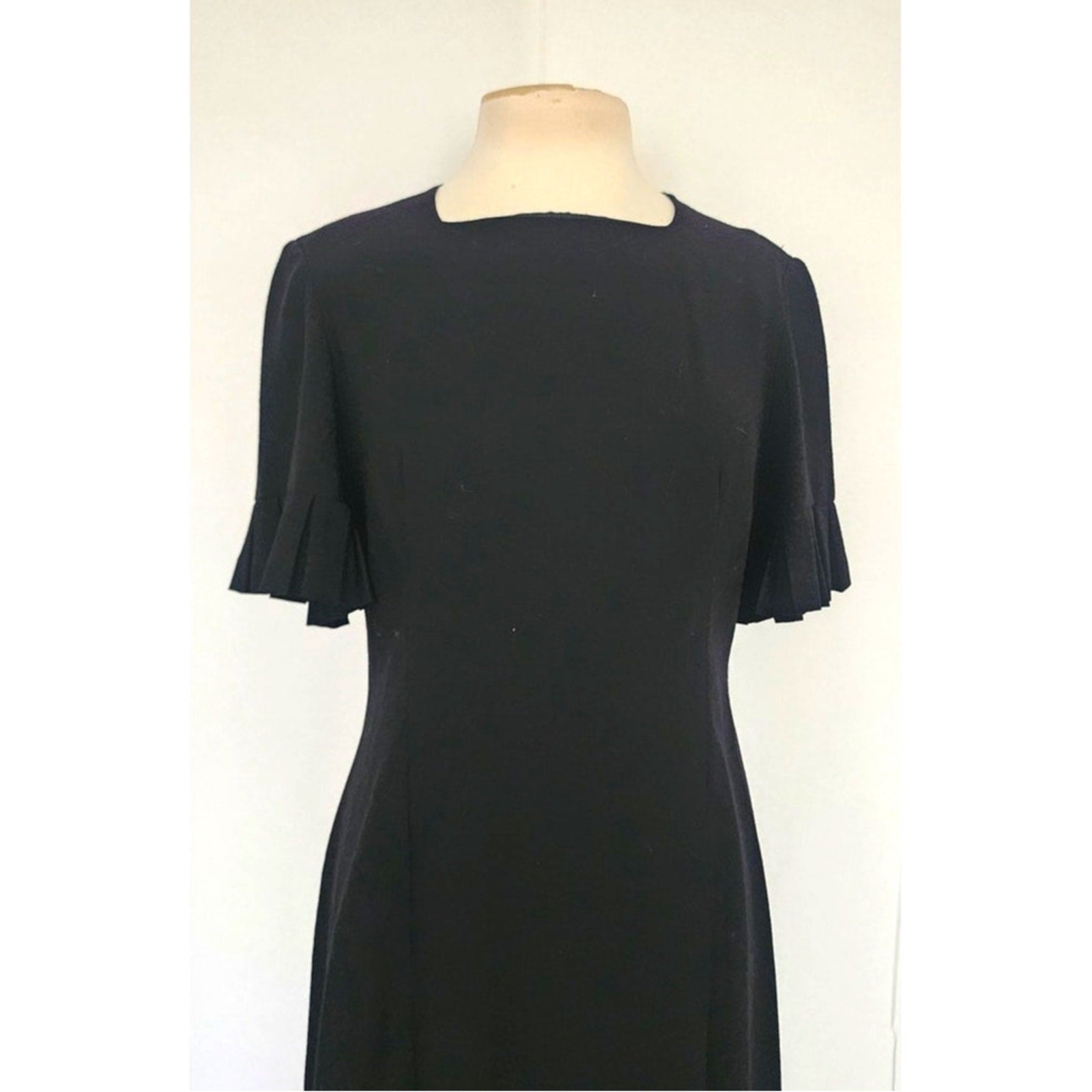 Classic little black dress from the chicest of midcentury Italian fashion houses! Collarless, with a high, square neckline, it has half sleeves with pleated fringe cuffs. The pleated panel is repeated around the mid-calf hemline. Silhouette is cut down across the torso, and princess seams create a flattering fit. Closes with a zipper at center rear. Fully lined.
