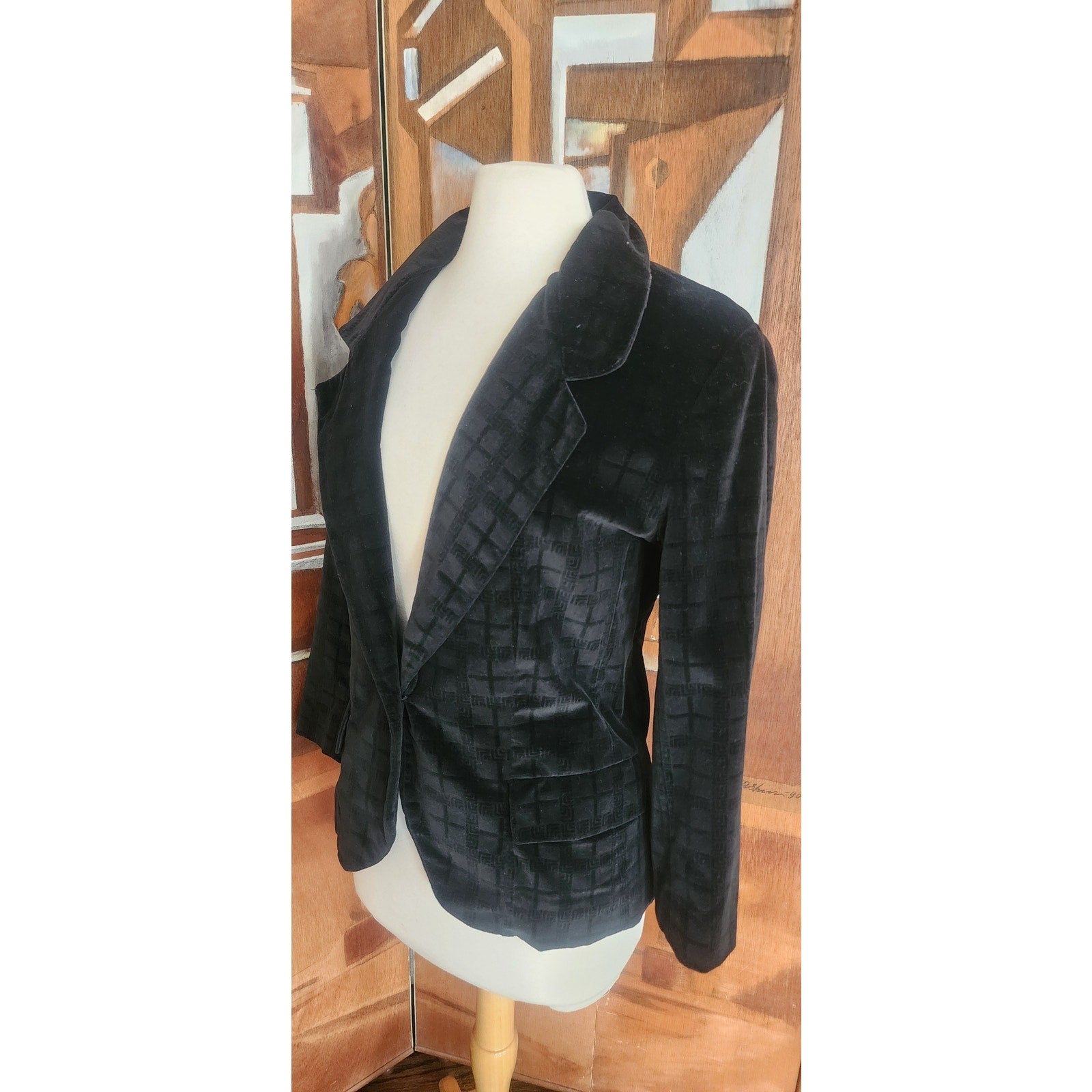 Subtle black-on-black checked pattern give this closet staple extra flair. Fitted with a fold down collar and singly button closure, it has flap pockets at the hip fronts. Fully lined.