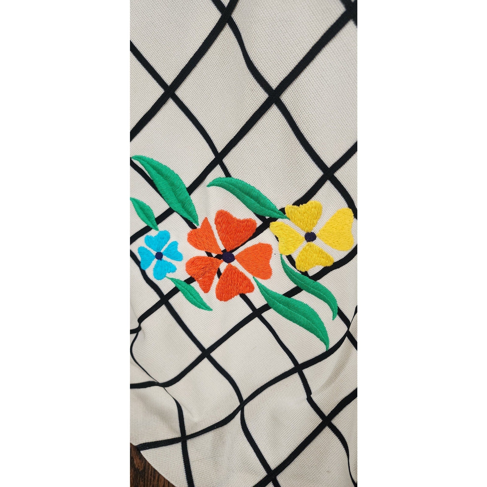 Vintage 70s Maxi Dress Black Knit Top Cream Windowpane Skirt Floral Applique Crissa Italy